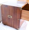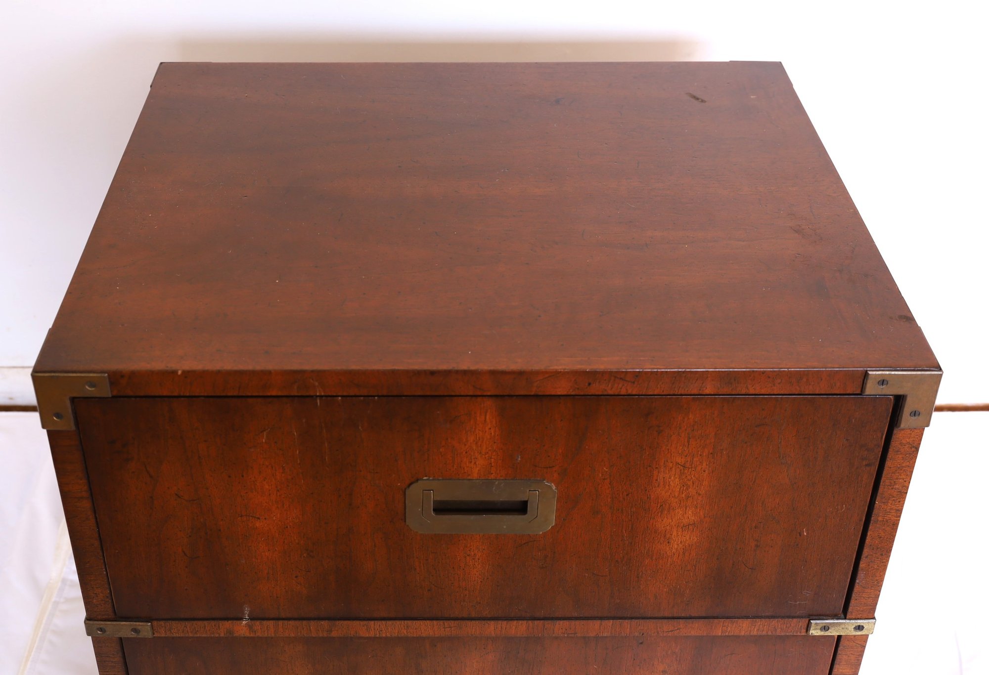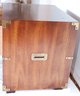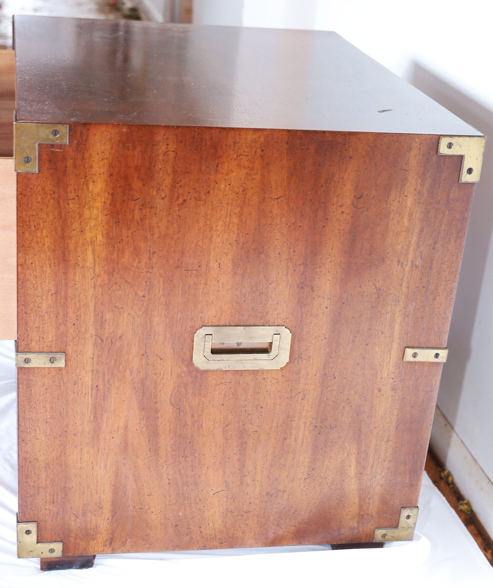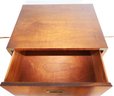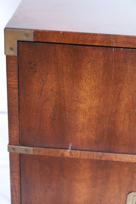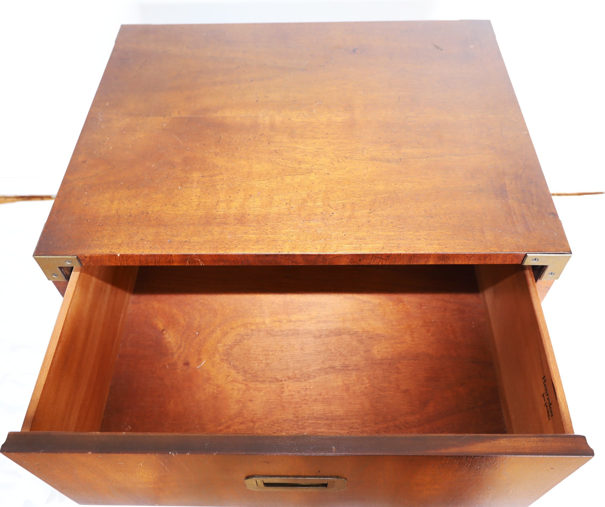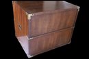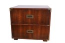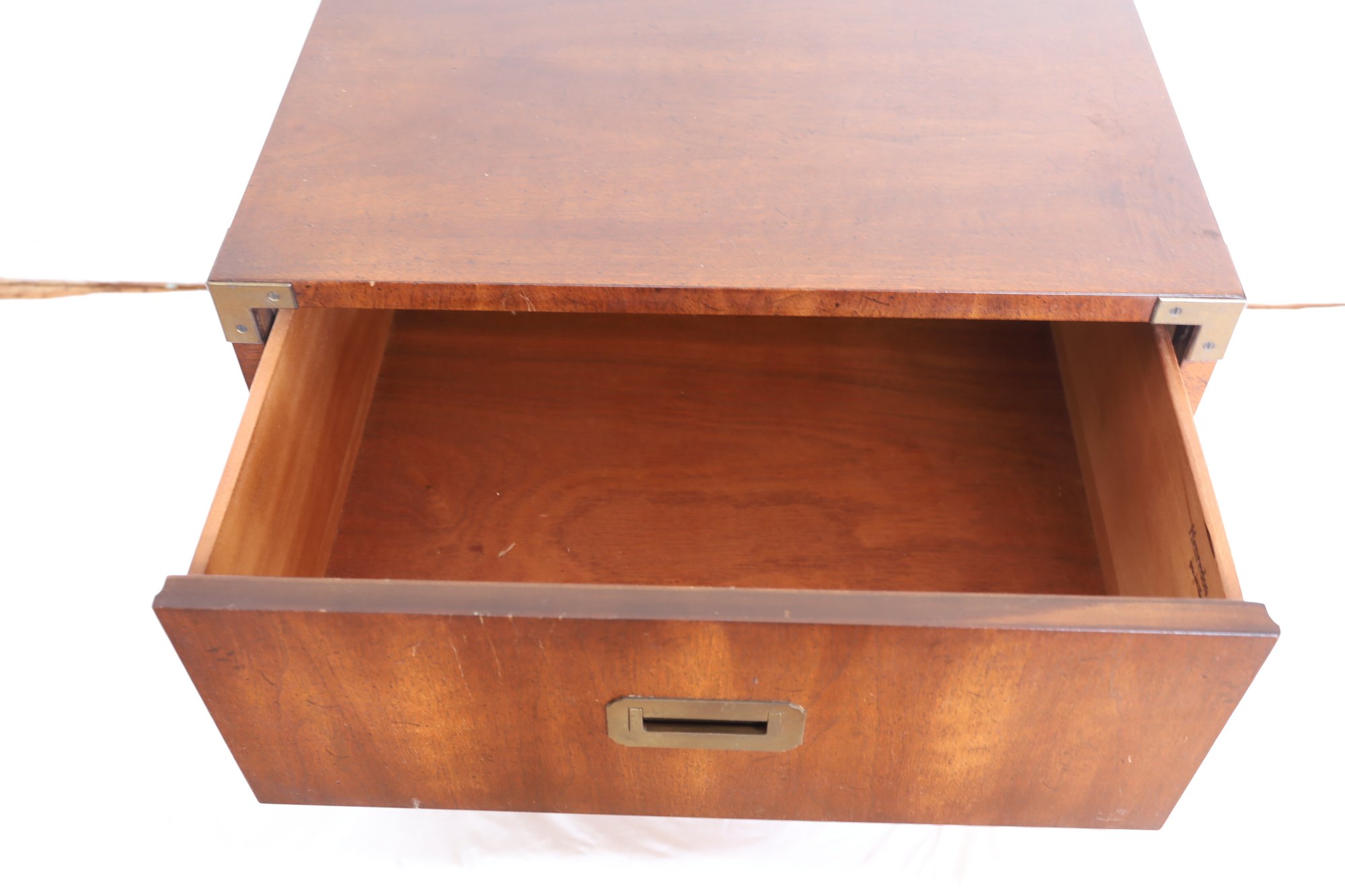 Walnut construction with brass hardware, including two spacious drawers and block feet. Crafted in the USA. Dimensions: 24"W x 19"D x 22"H.
