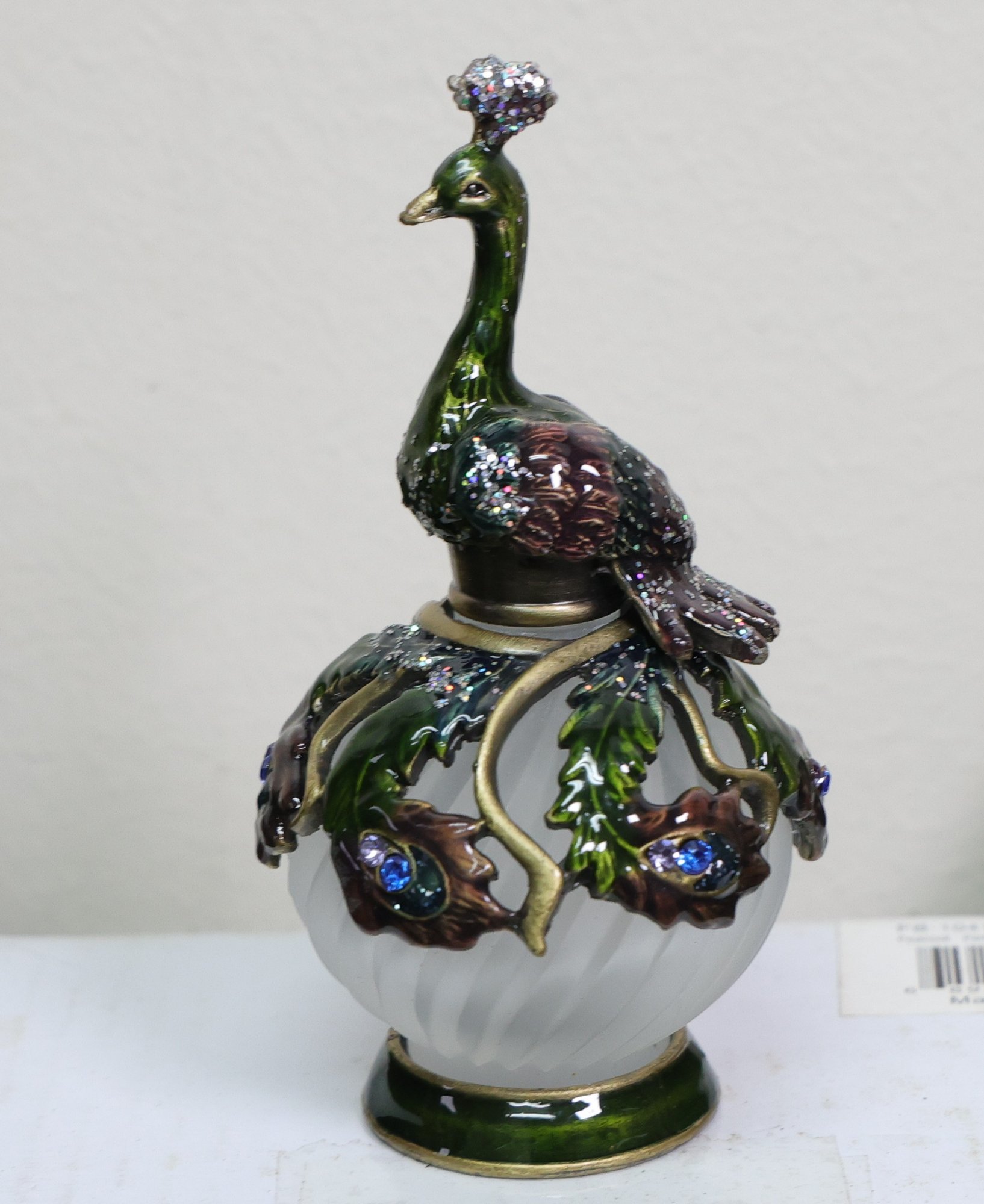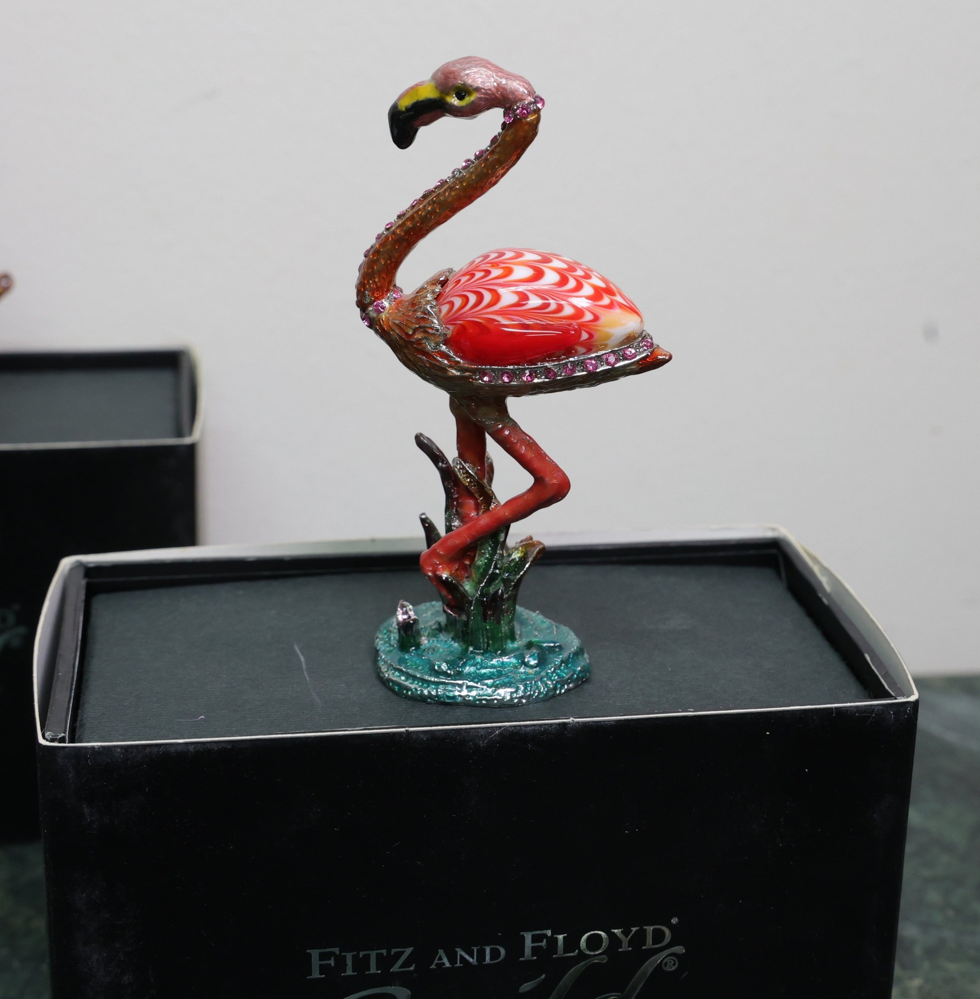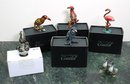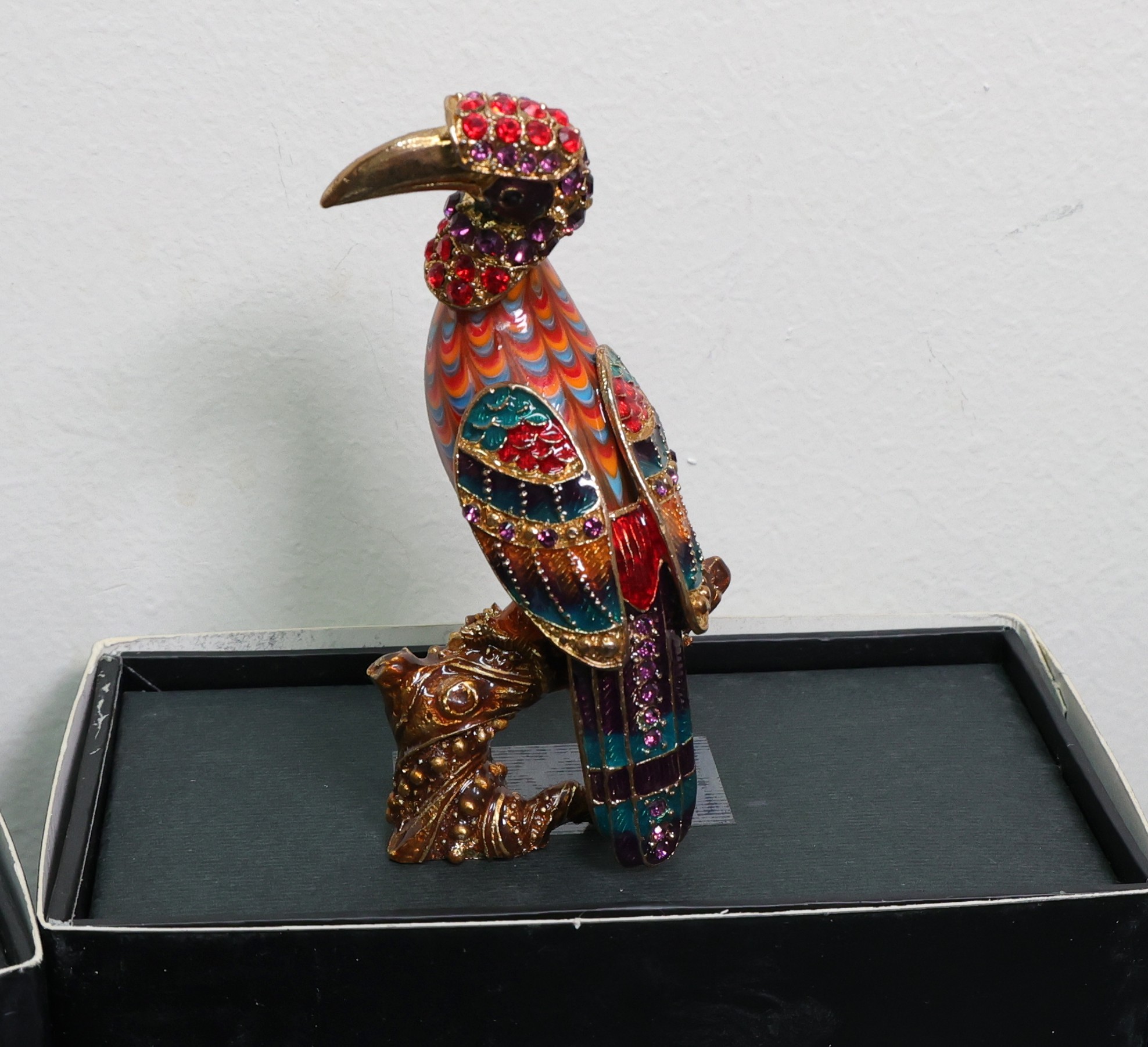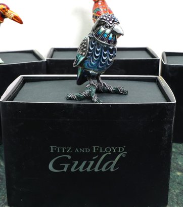 Various hand-painted Fitz and Floyd Guild bird figurines, including some from the Cleopatra Bird Guild Collection. Made of metal with enamel and crystal or rhinestone accents.