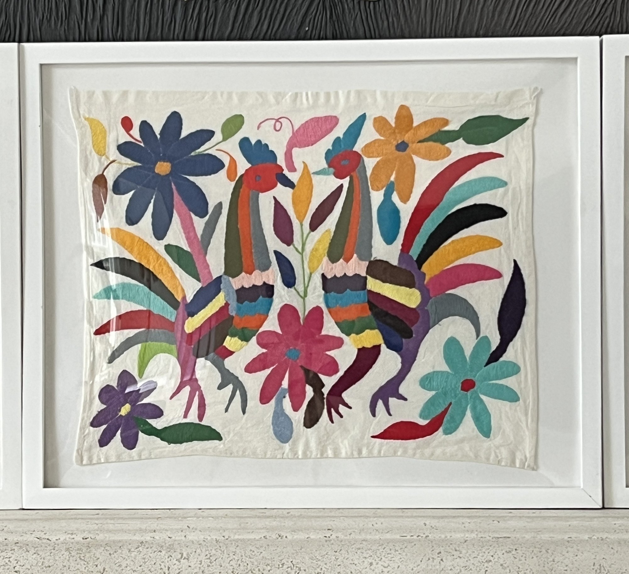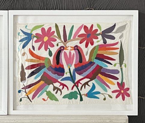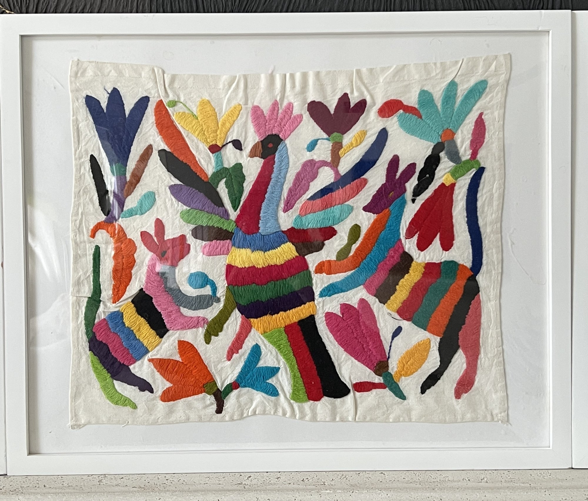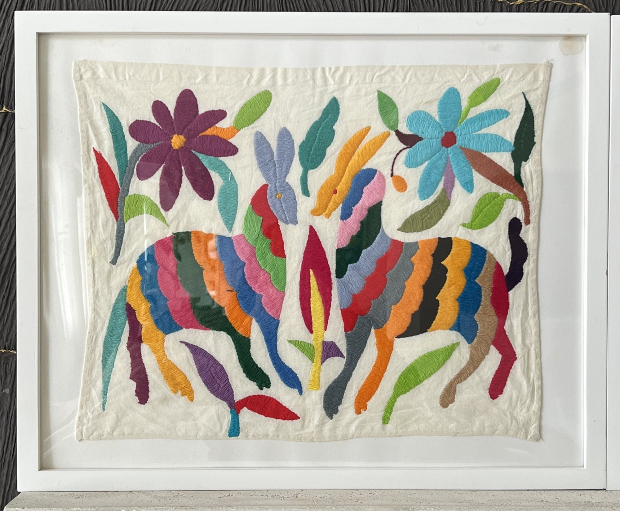 Five wonderful hand embroidered vibrant folk pieces of art on cloth with bright white frames.