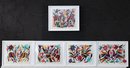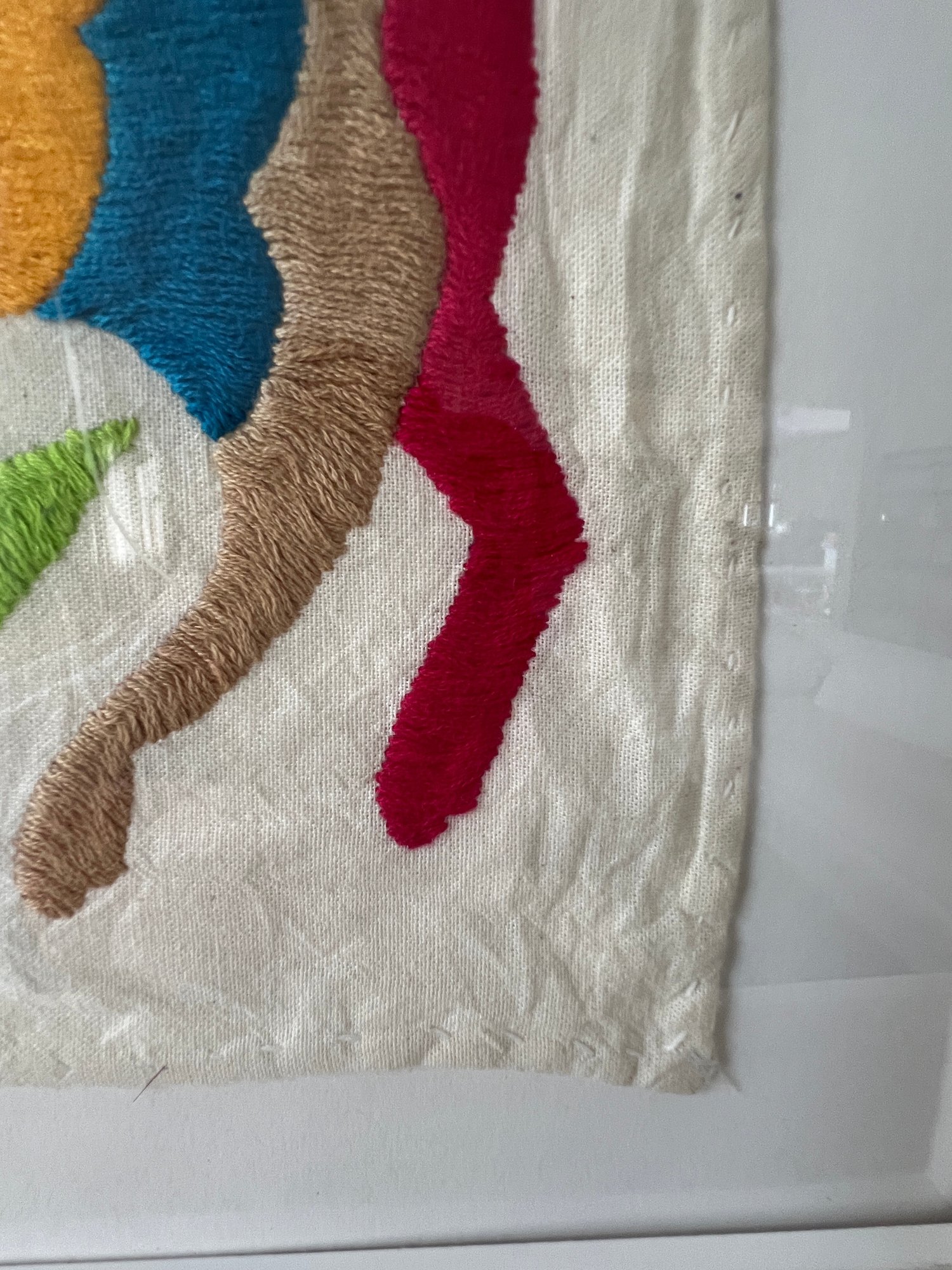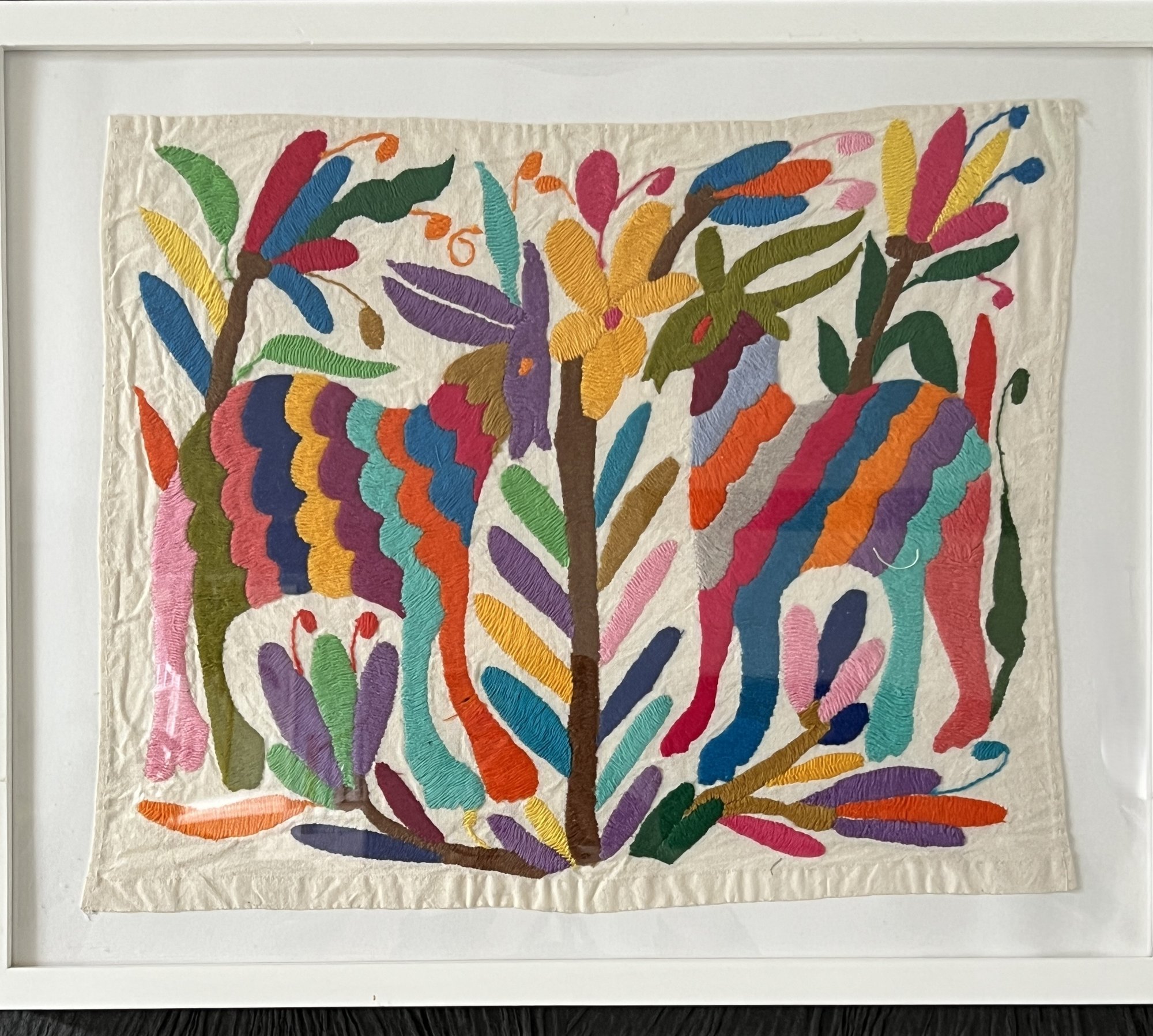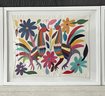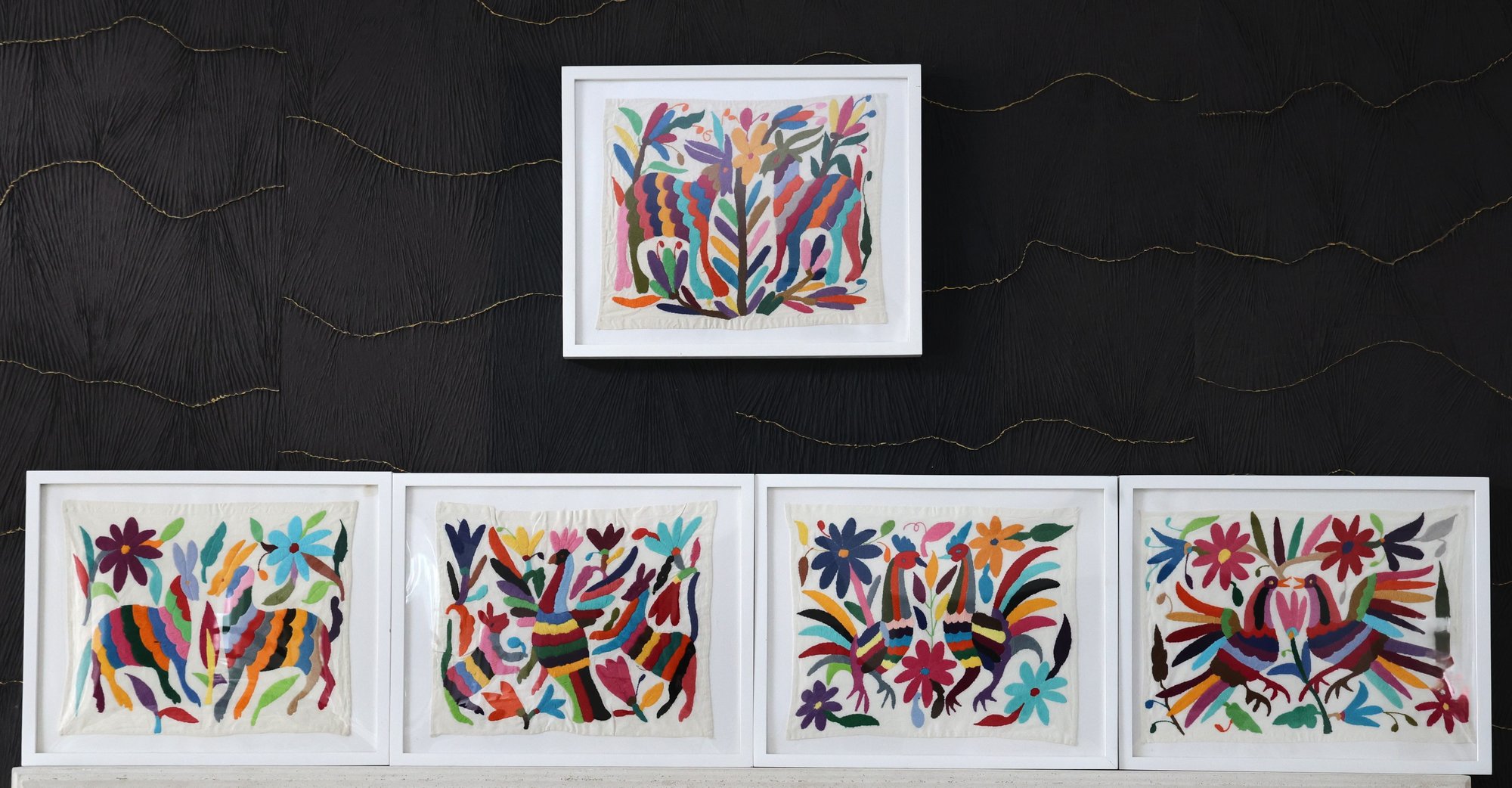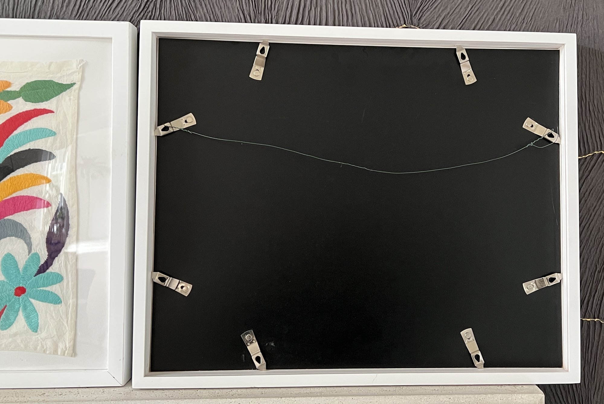 Five wonderful hand embroidered vibrant folk pieces of art on cloth with bright white frames.