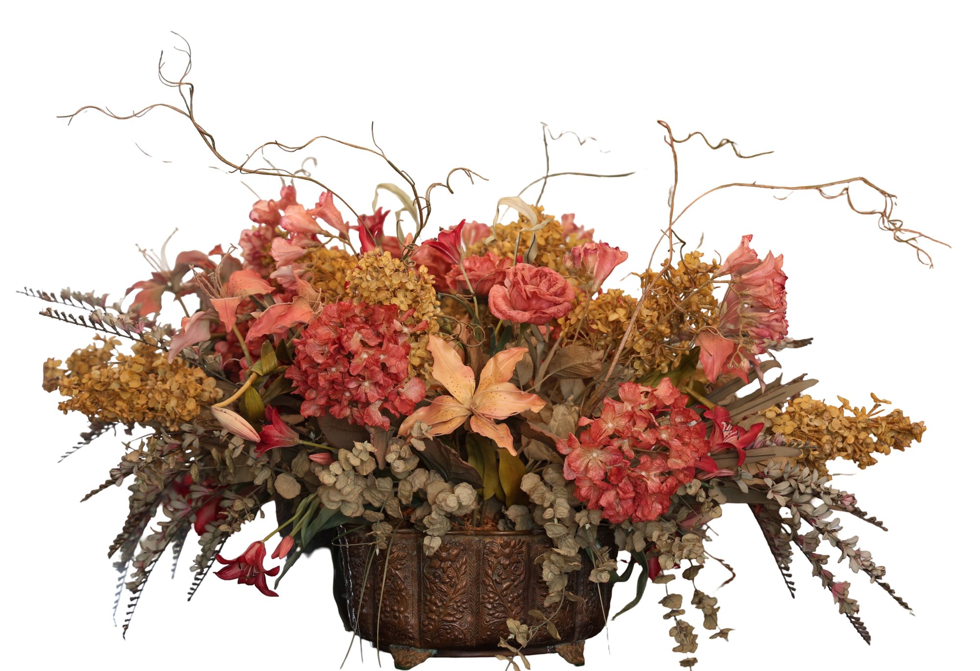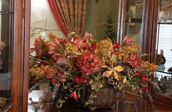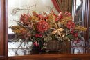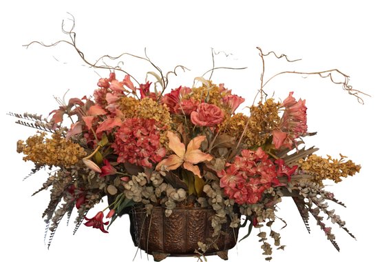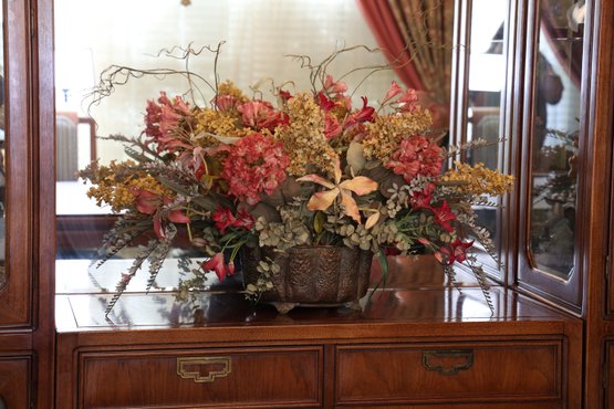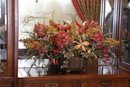 Lovely floral centerpiece with silk flowers, with a variety of flowers and greenery in a decorative pot.