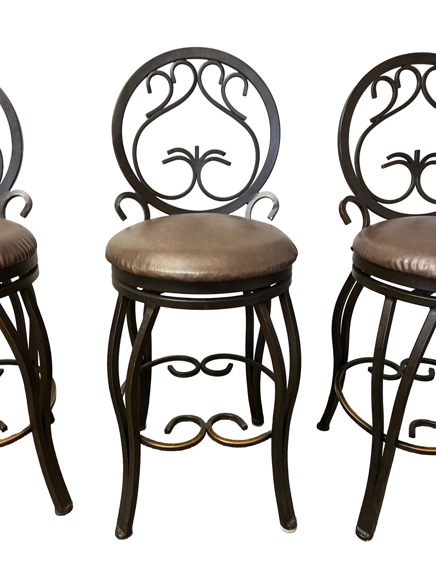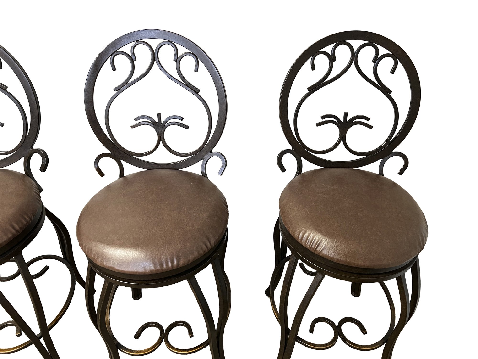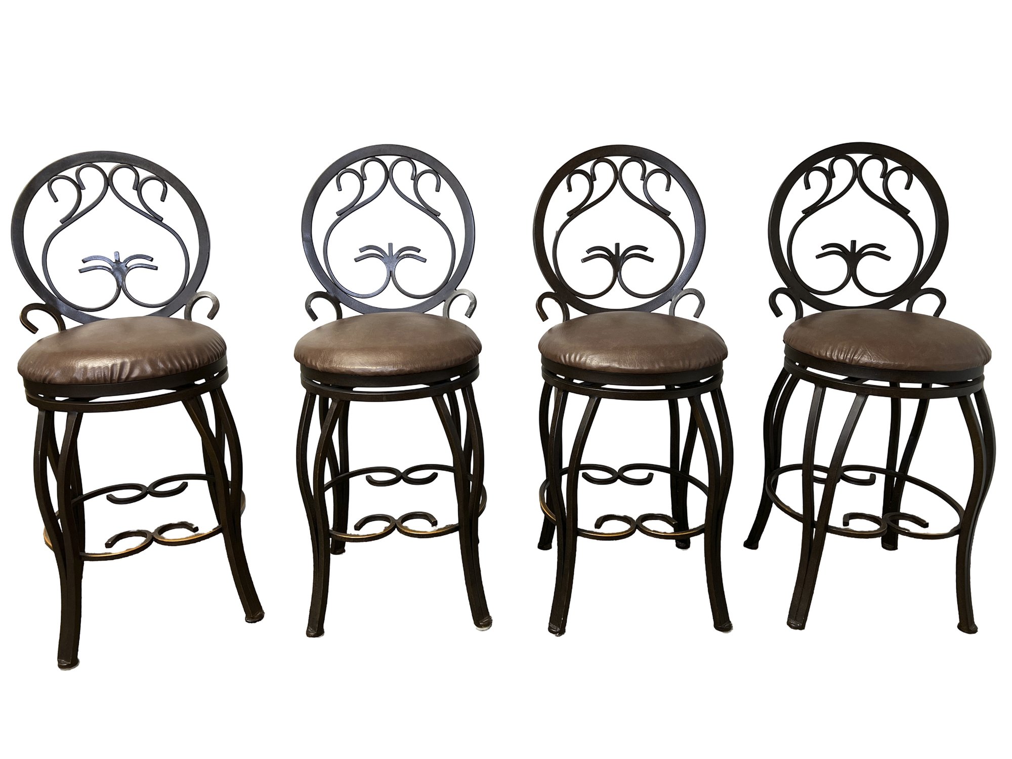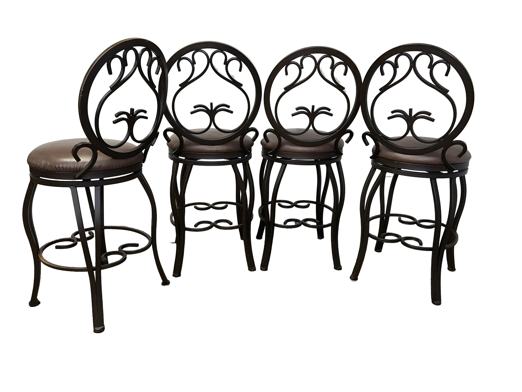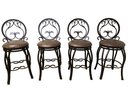 Four metal swivel bar/kitchen stools, featuring an ornate, scroll back design and a cushioned seat. With an aged bronze finish.