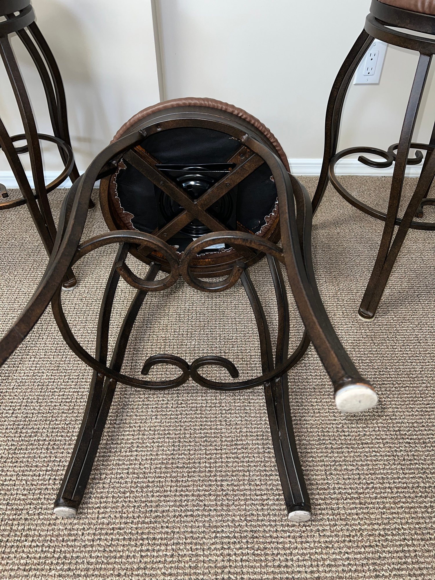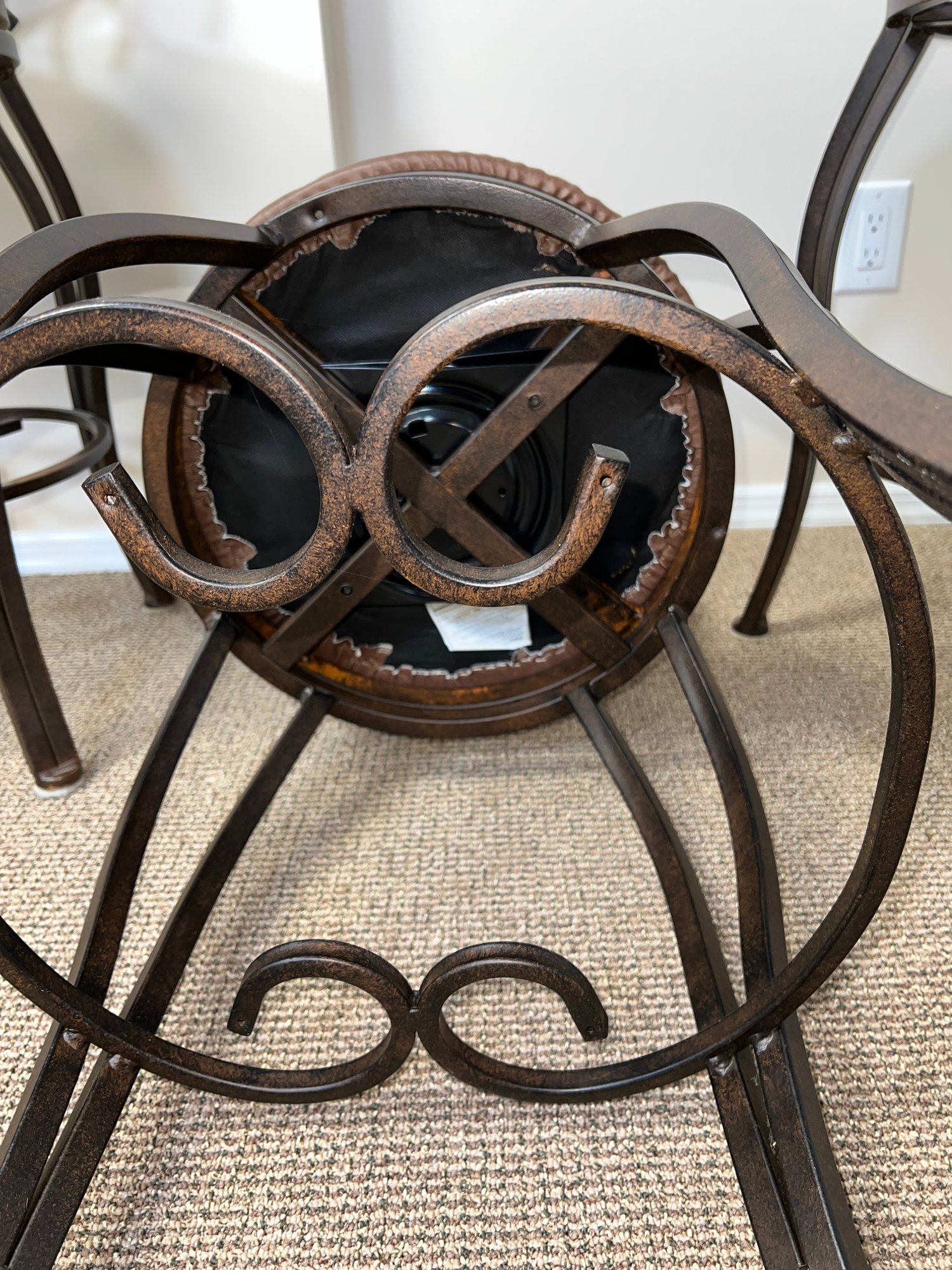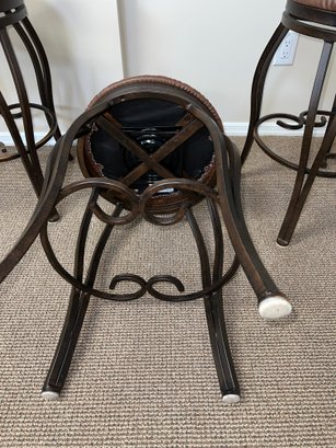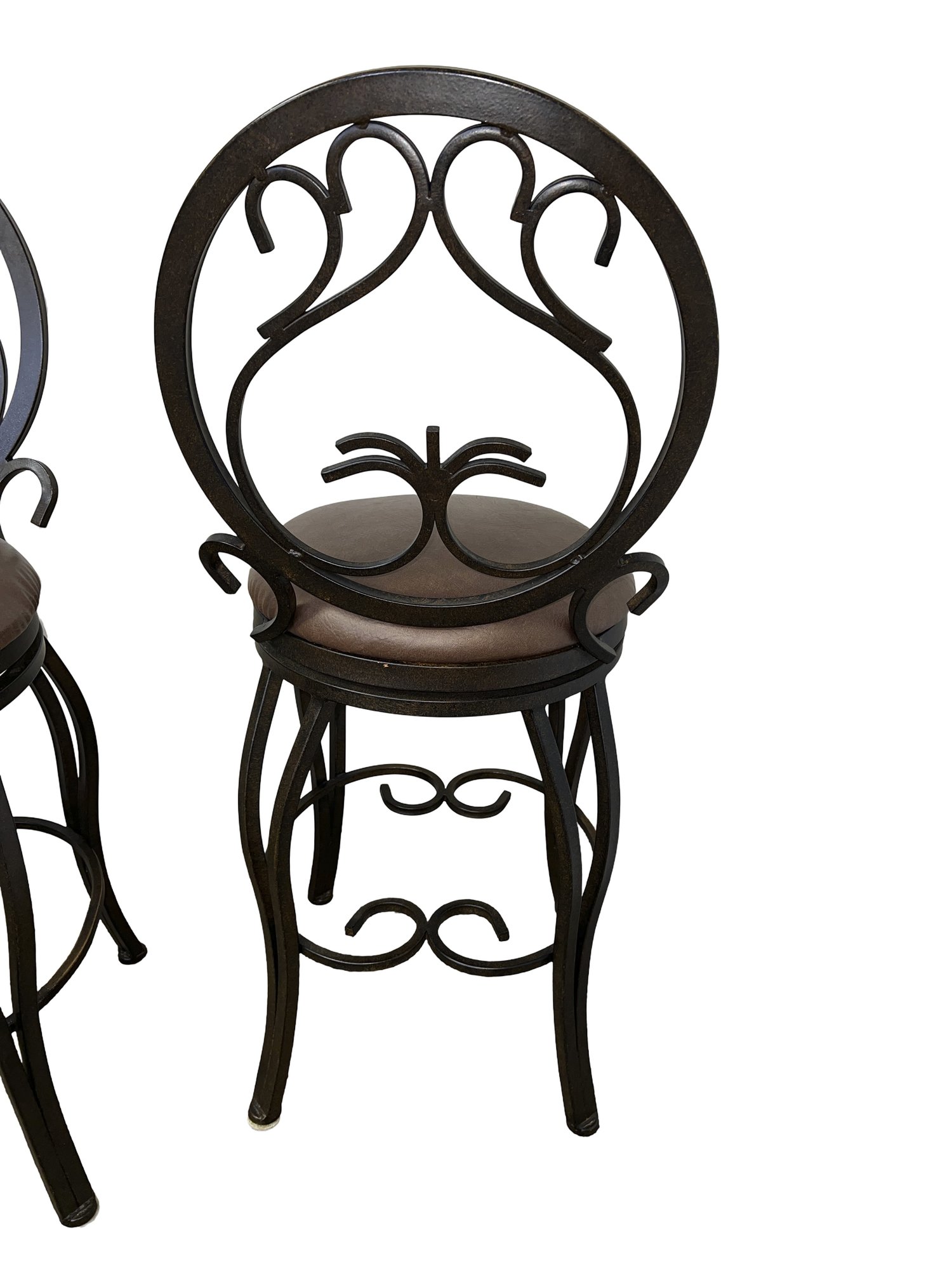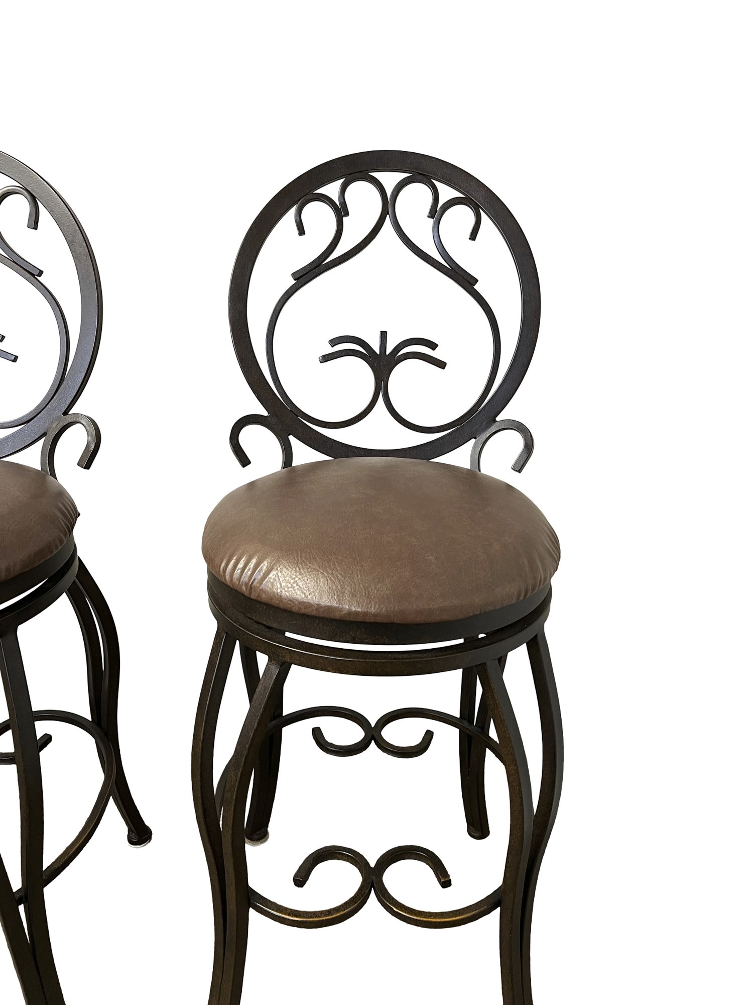 Four metal swivel bar/kitchen stools, featuring an ornate, scroll back design and a cushioned seat. With an aged bronze finish.