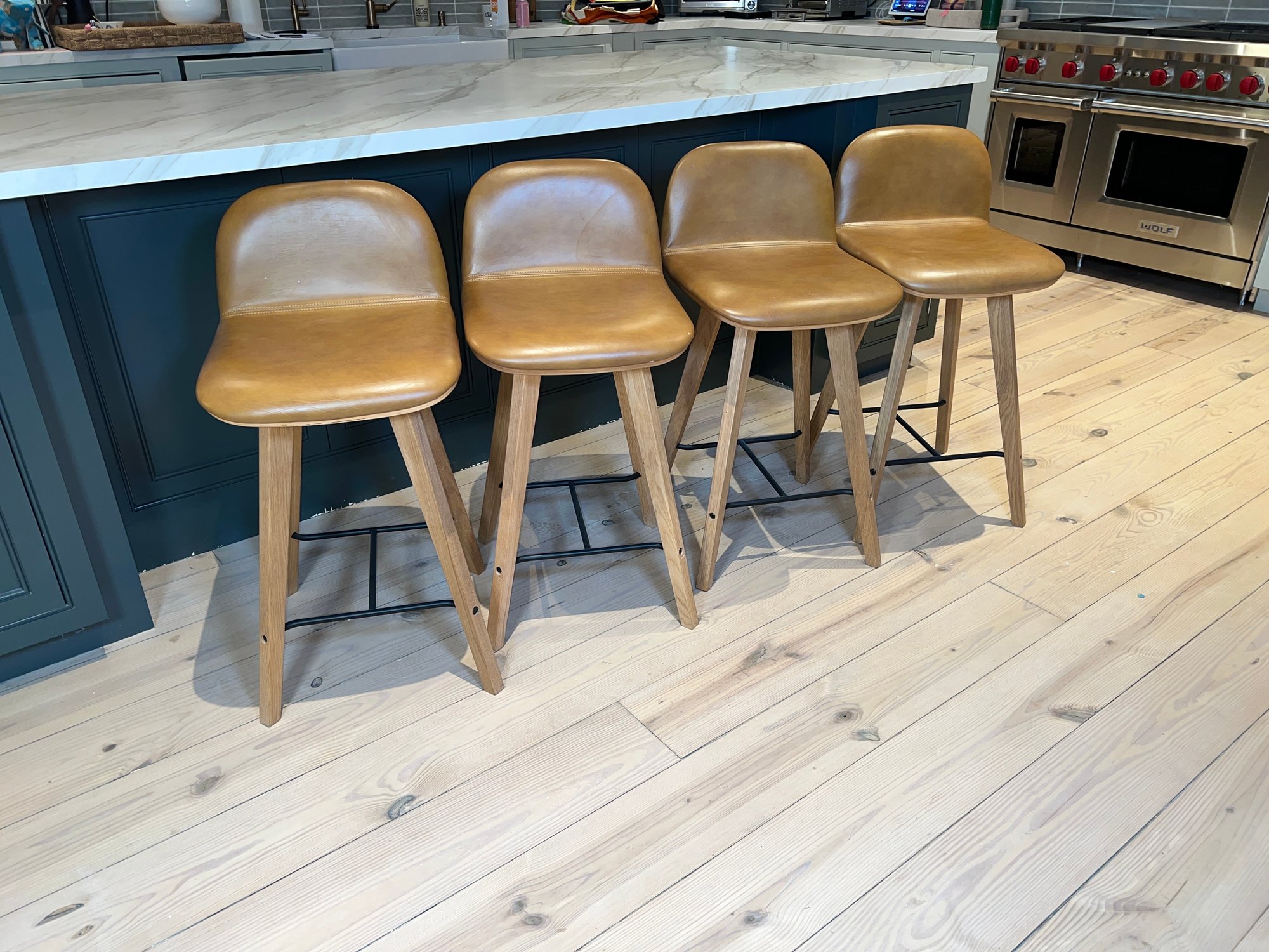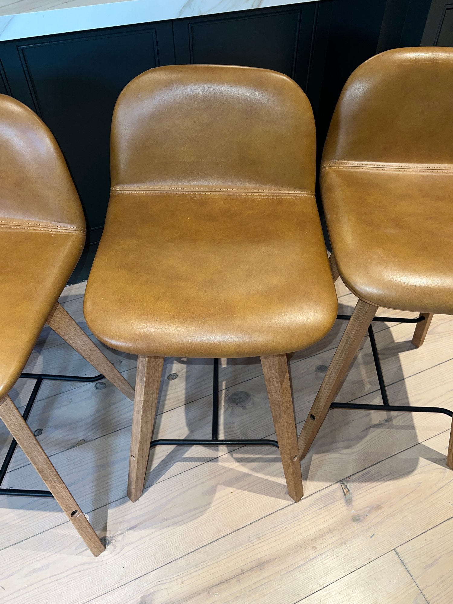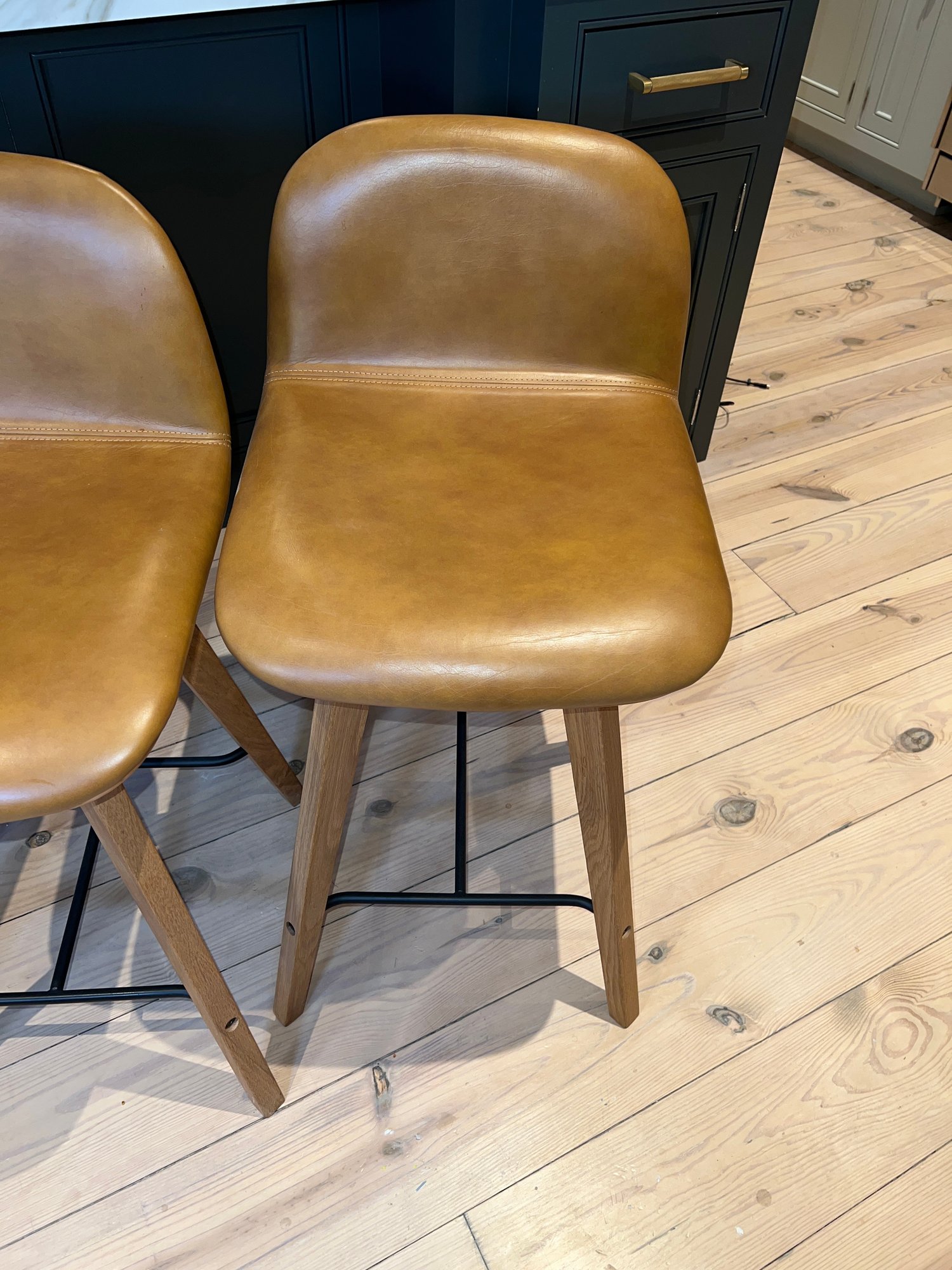 Solid oak wood legs with top grain leather tan seats and foam-filled cushions in a curved shape. Low back , armless and has a black metal footrest. retail $699.00 each