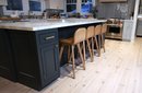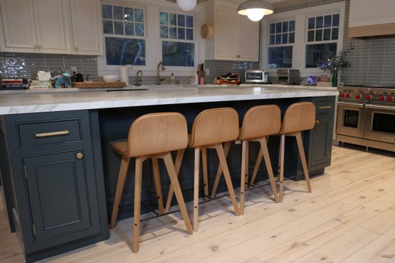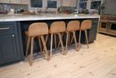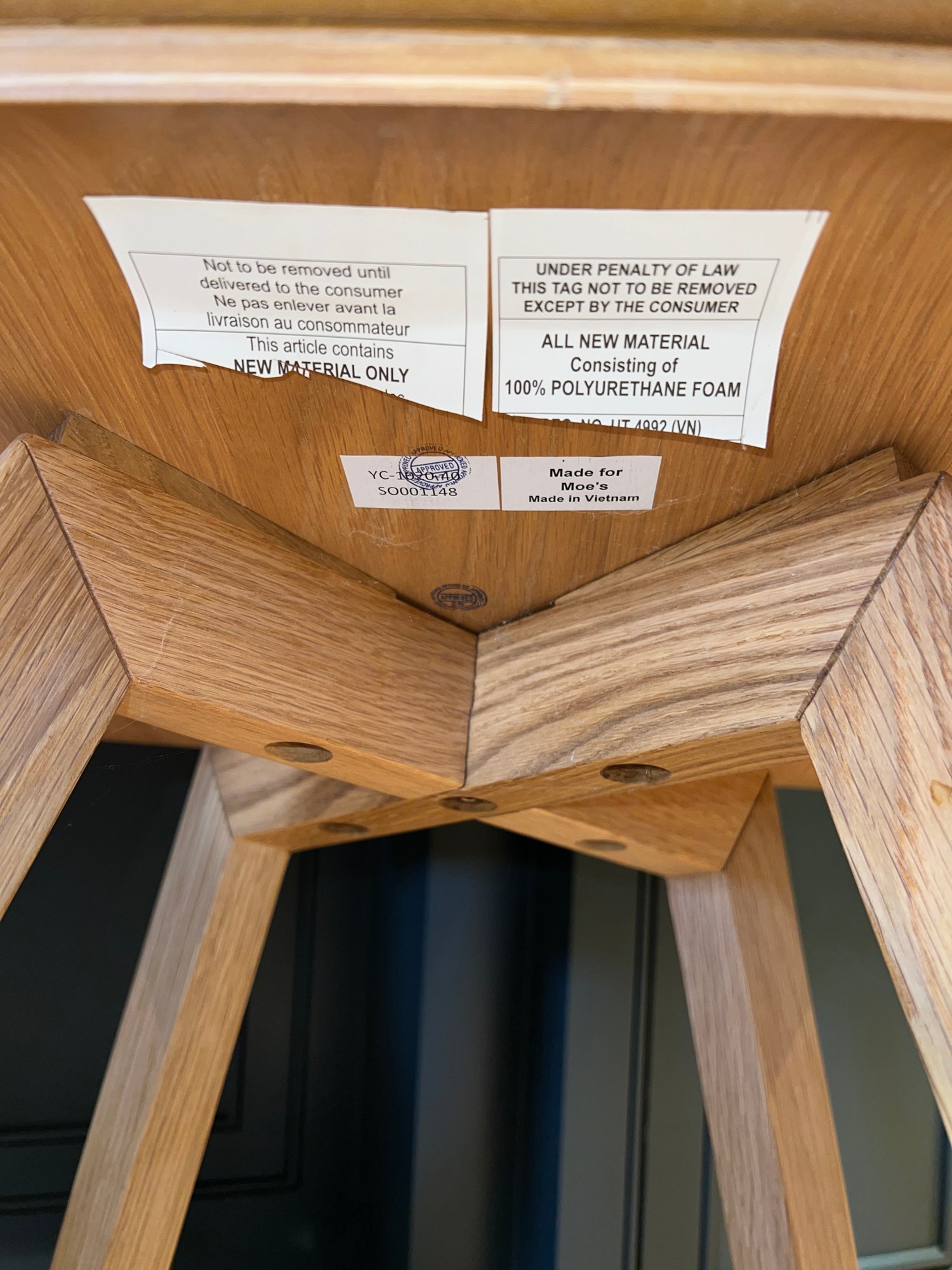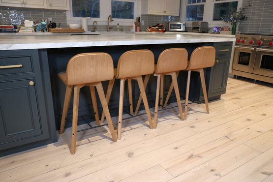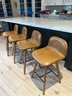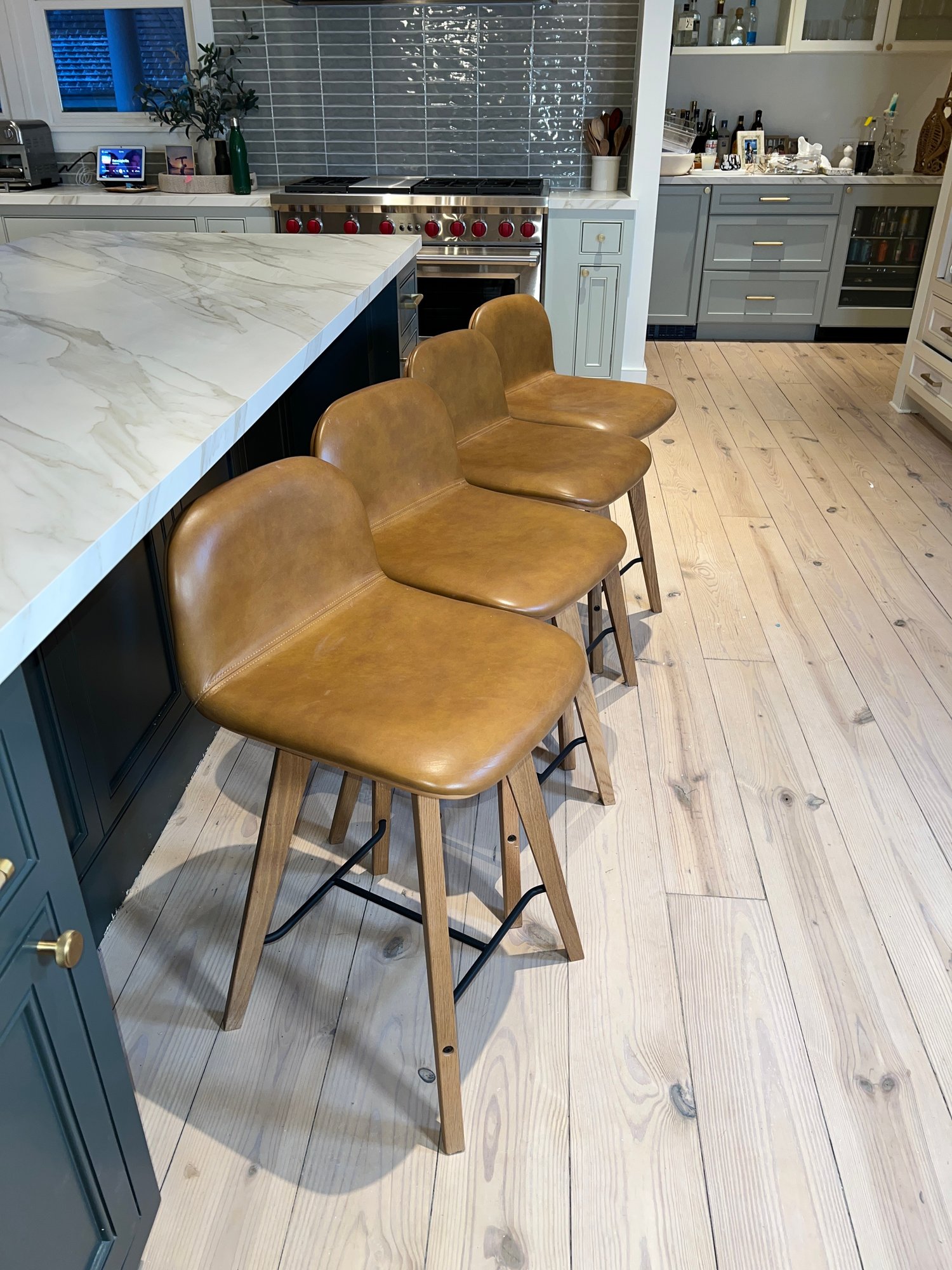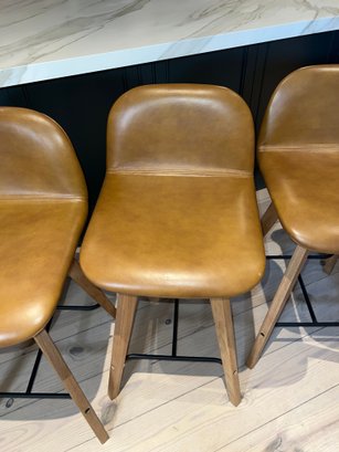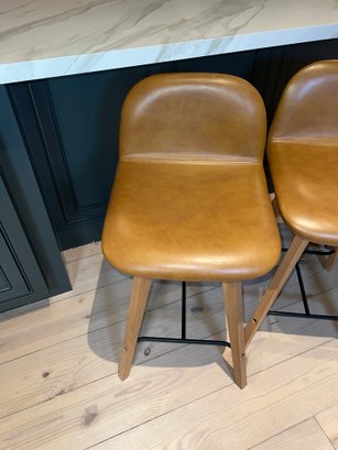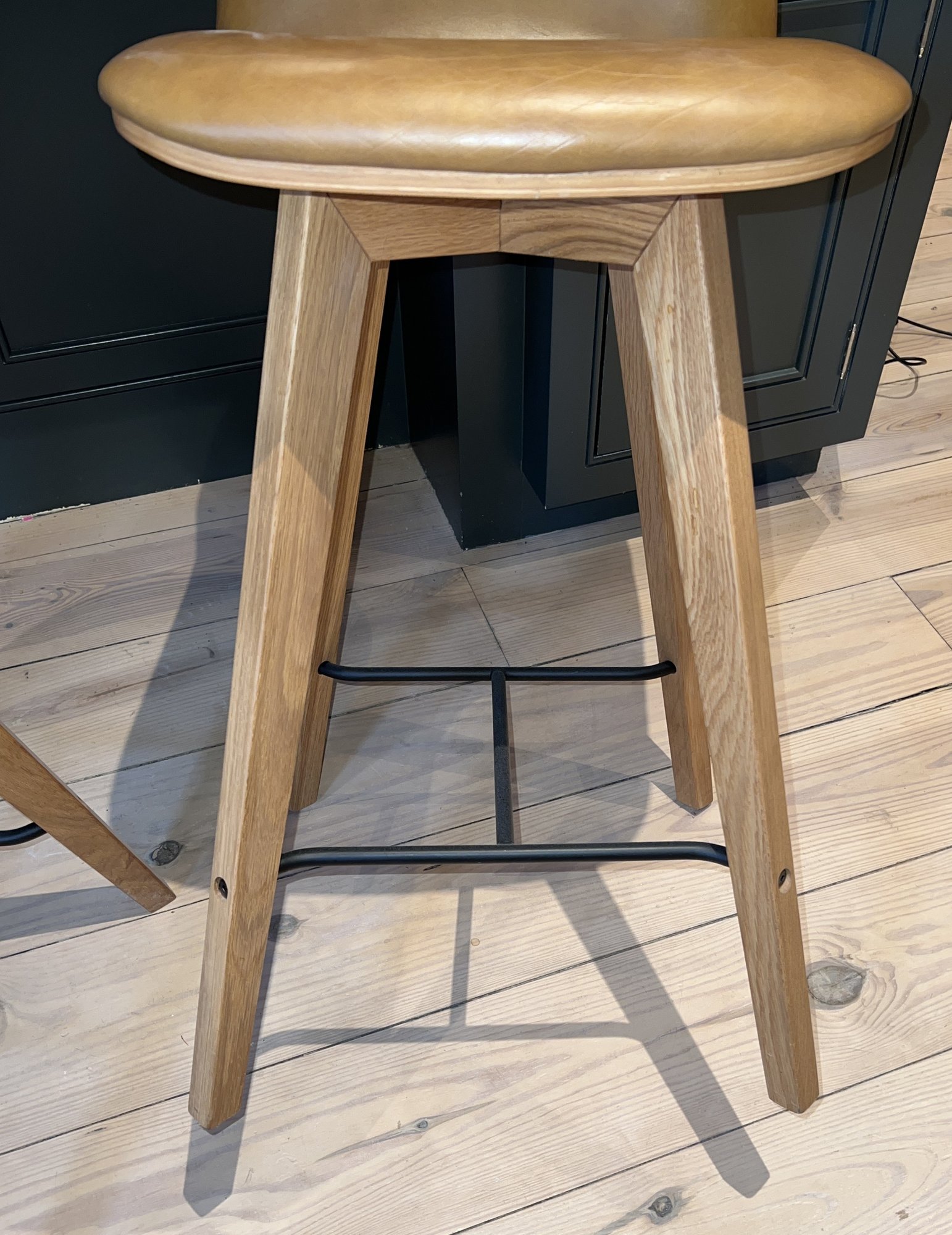 Solid oak wood legs with top grain leather tan seats and foam-filled cushions in a curved shape. Low back , armless and has a black metal footrest. retail $699.00 each