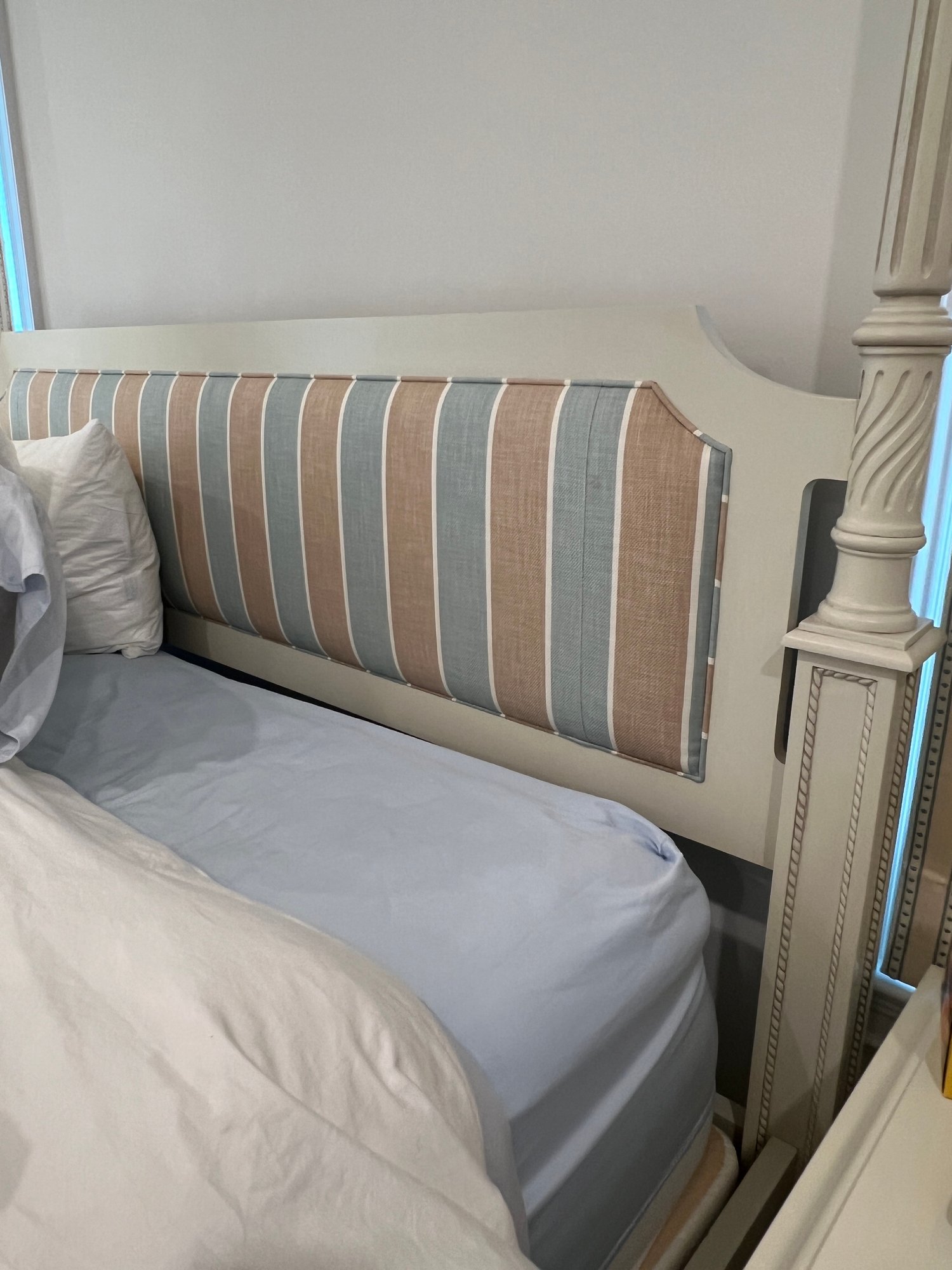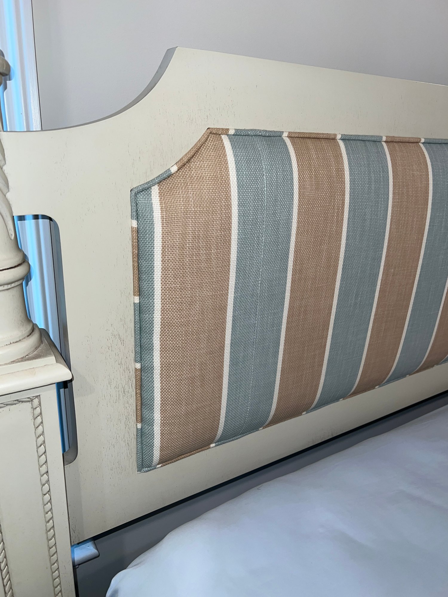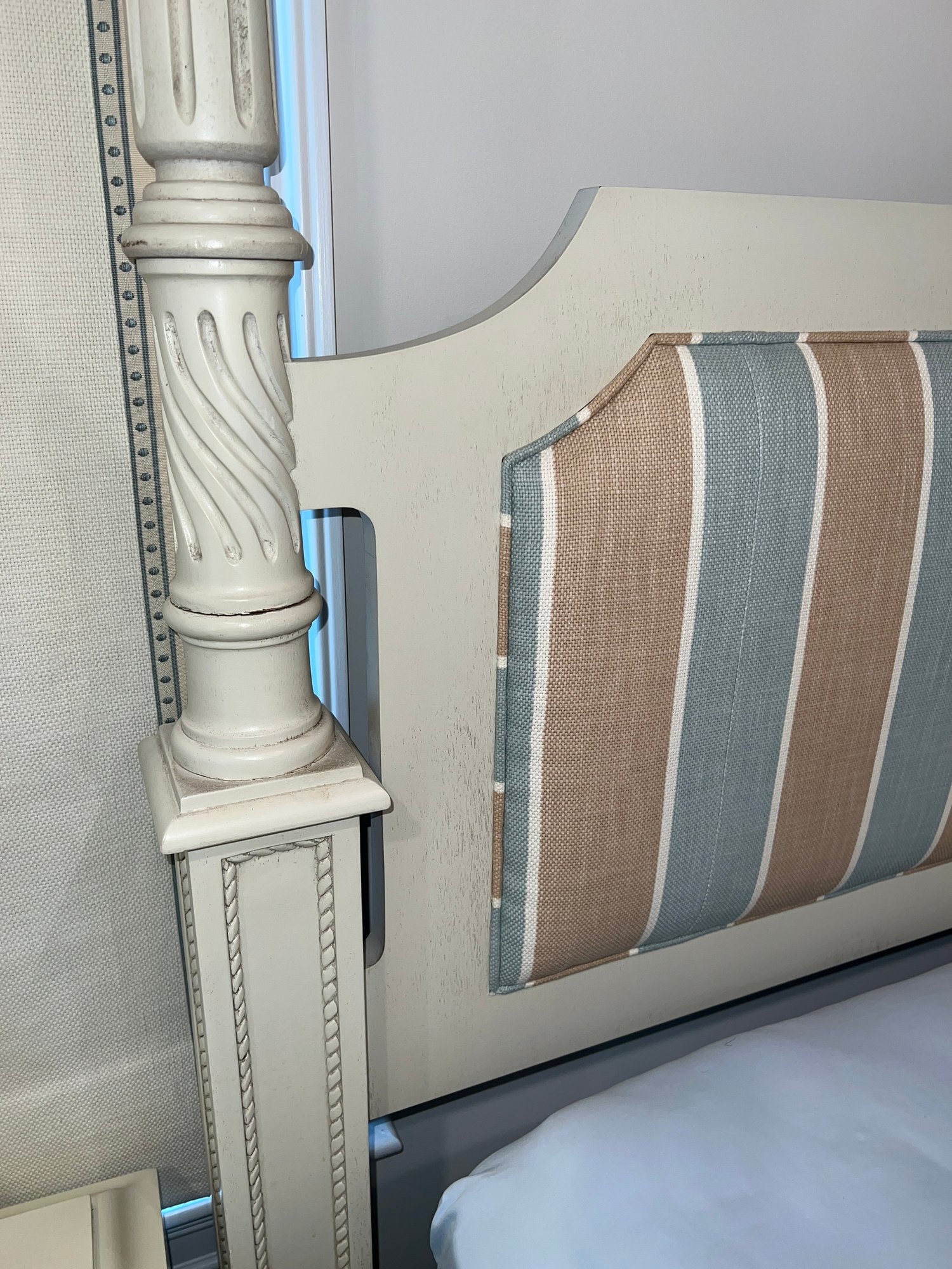 King four poster bed frame . Headboard in blue, brown and white cushioned fabric in heavy linen.