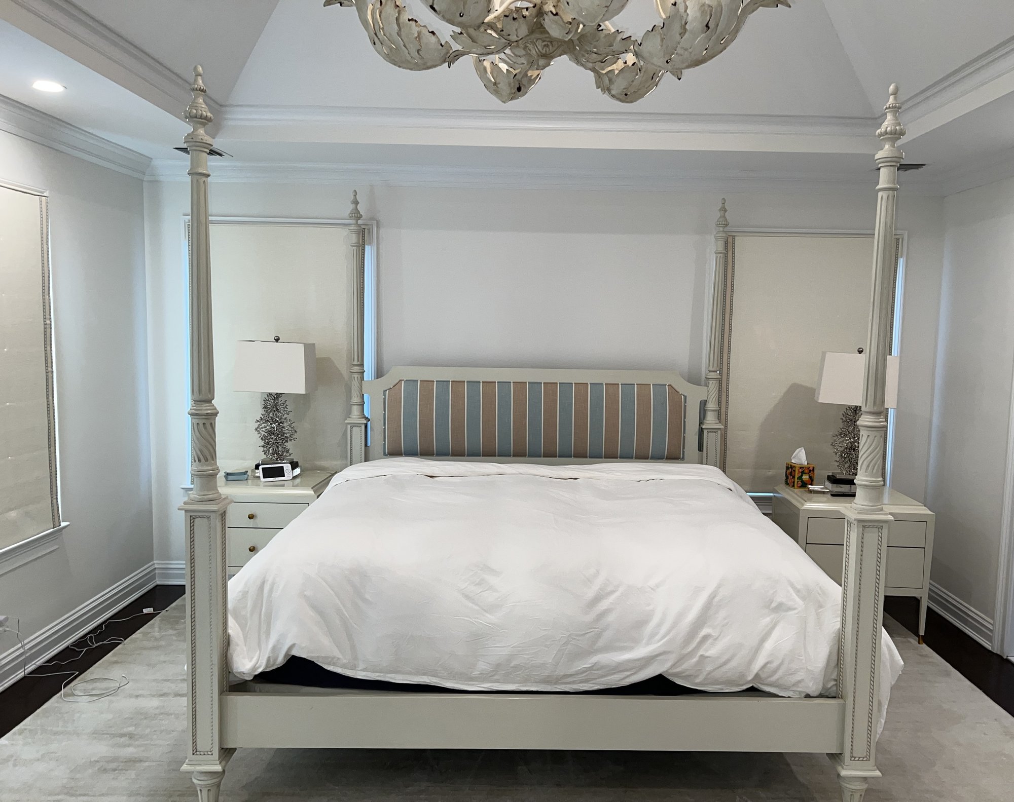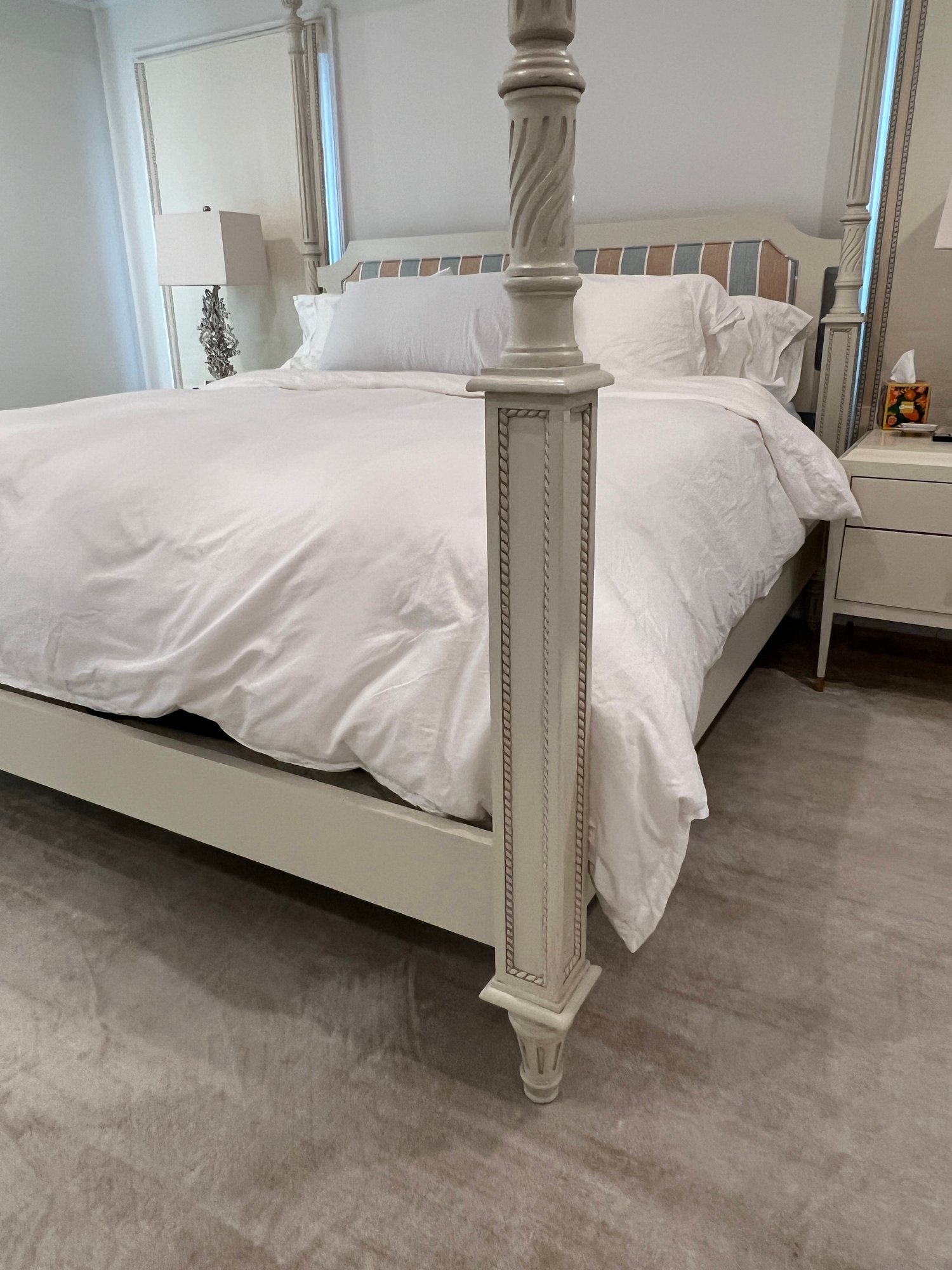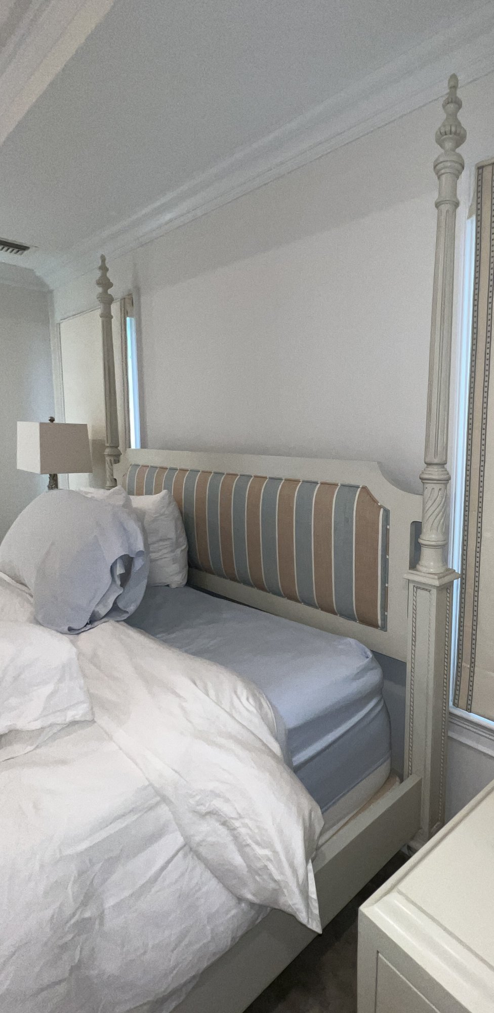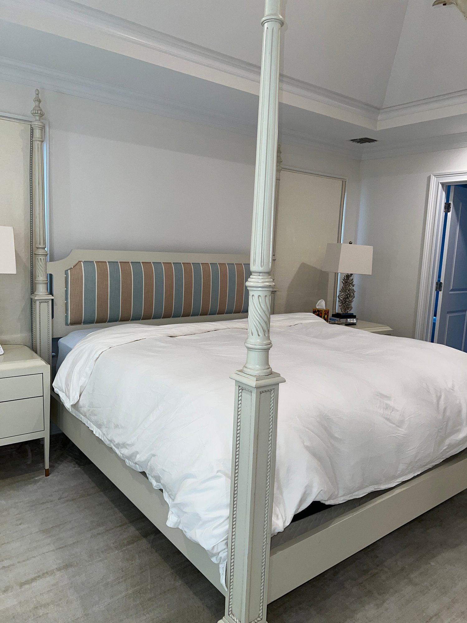 King four poster bed frame . Headboard in blue, brown and white cushioned fabric in heavy linen.