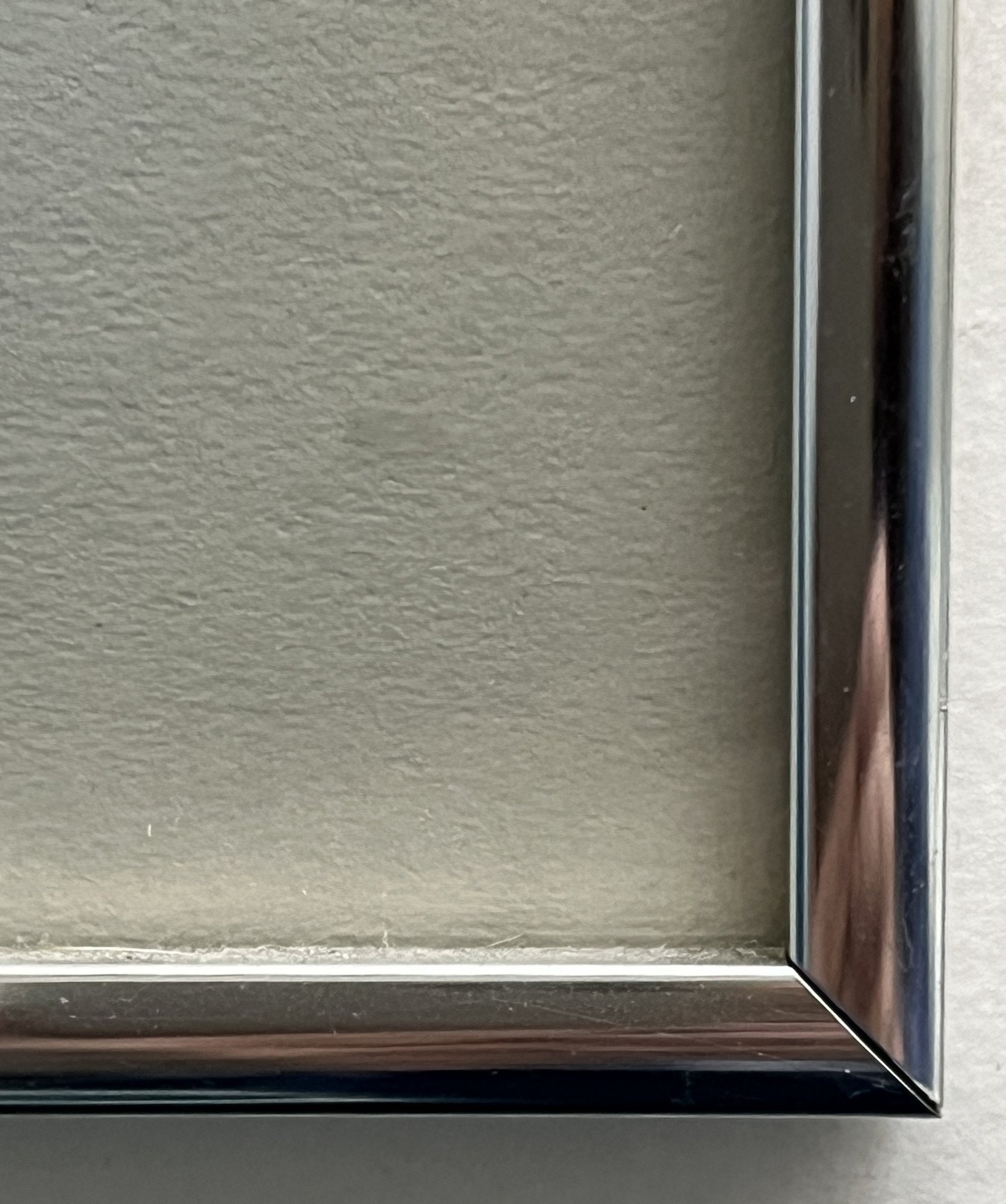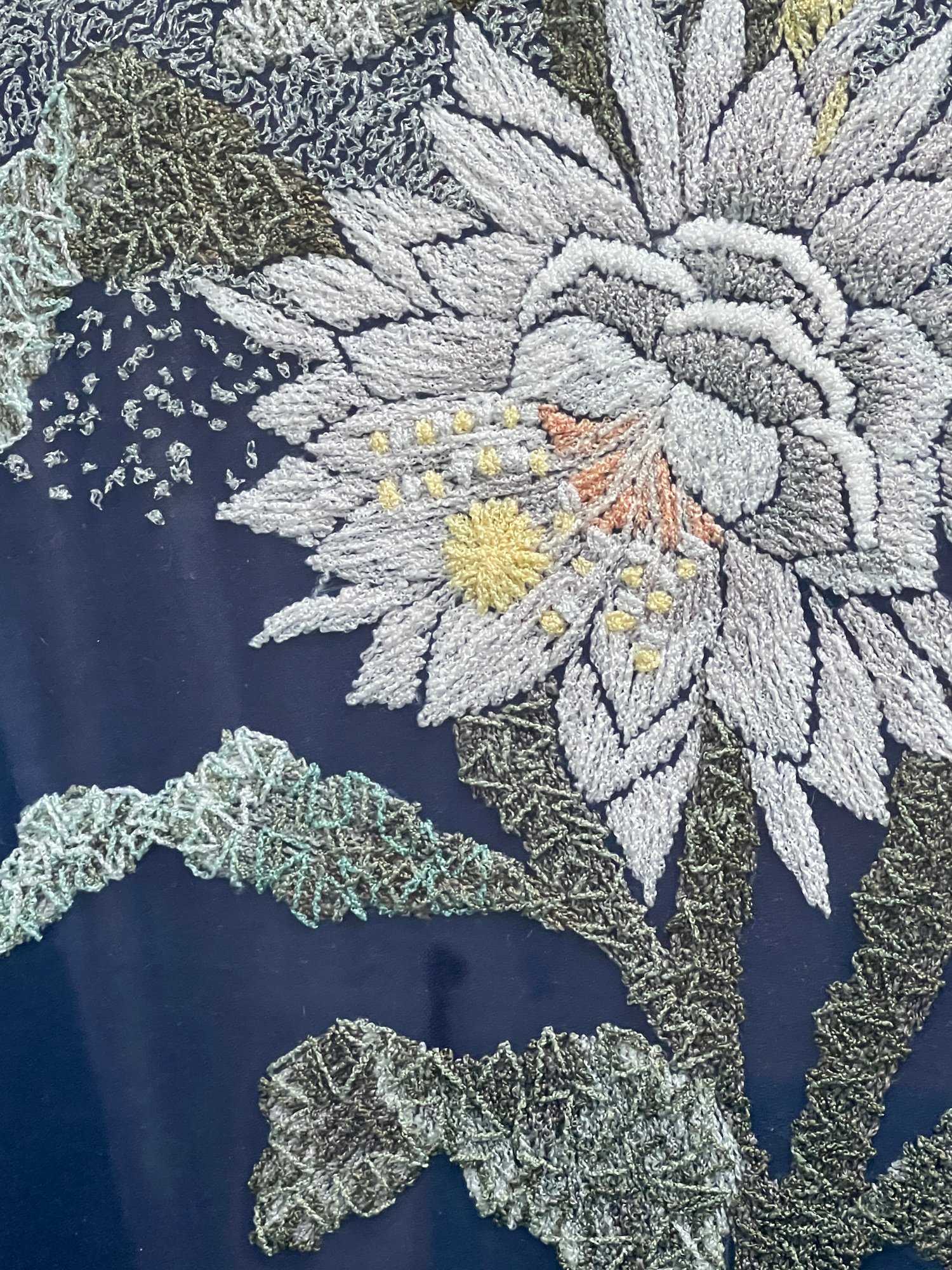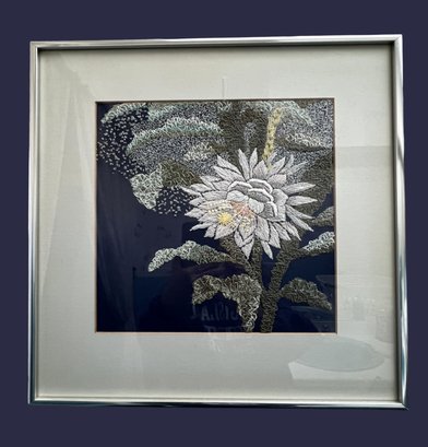 This framed embroidered piece highlights a large chrysanthemum set against a dark backdrop. Surrounding the flower are stylized leaves and other foliage, all depicted with intricate embroidery. The artwork exhibits a remarkable level of detail, especially in the petals and adjacent foliage, with fine, precise stitching. It is elegantly housed in a slim silver frame.