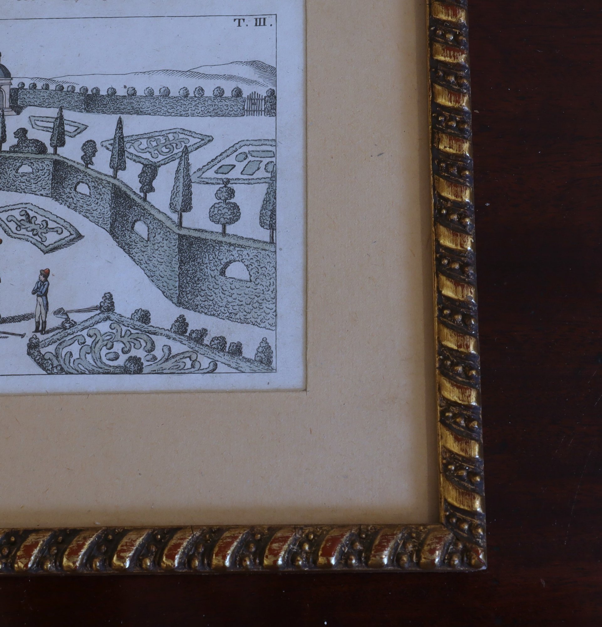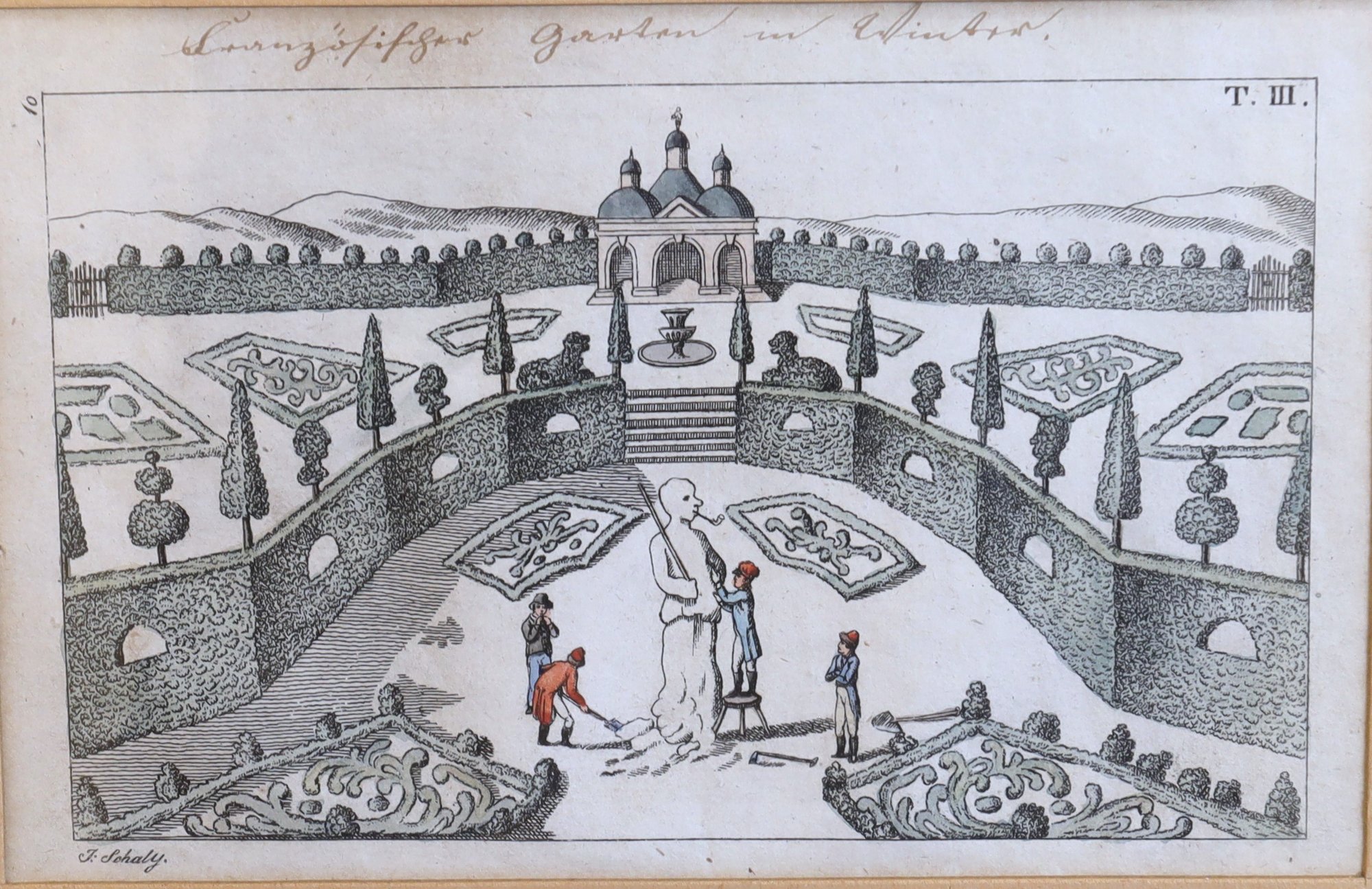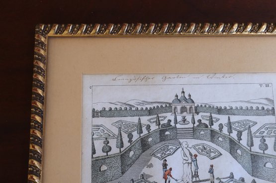 Engraving by J. Schaly, copper plate #3, hand-colored. "Garden in Winter" measures 7" x 9.5" framed and is part of a private collection in NYC.