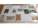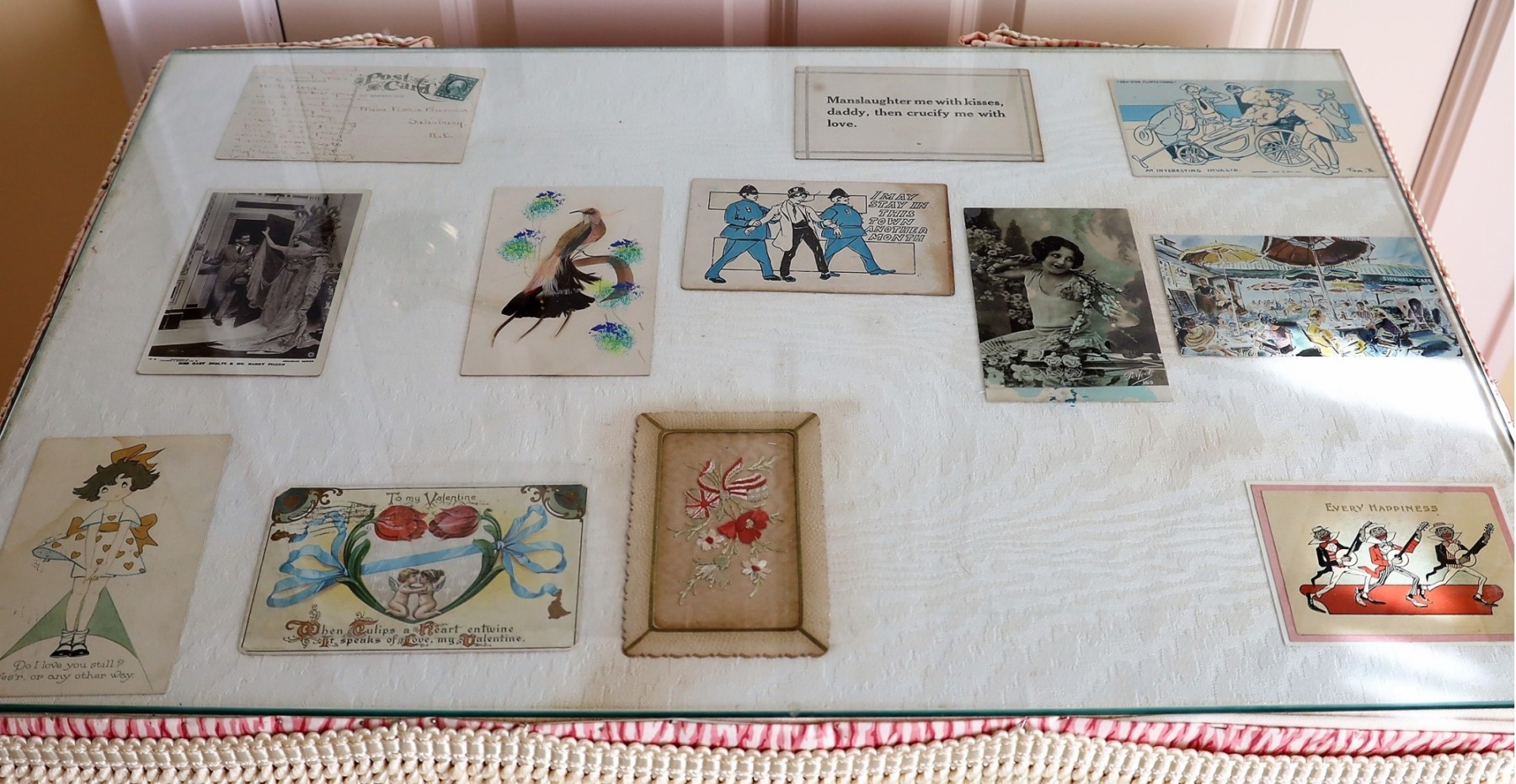 This fun postcard table features fringe, a skirt and old postcards under a glass top. Unique piece!