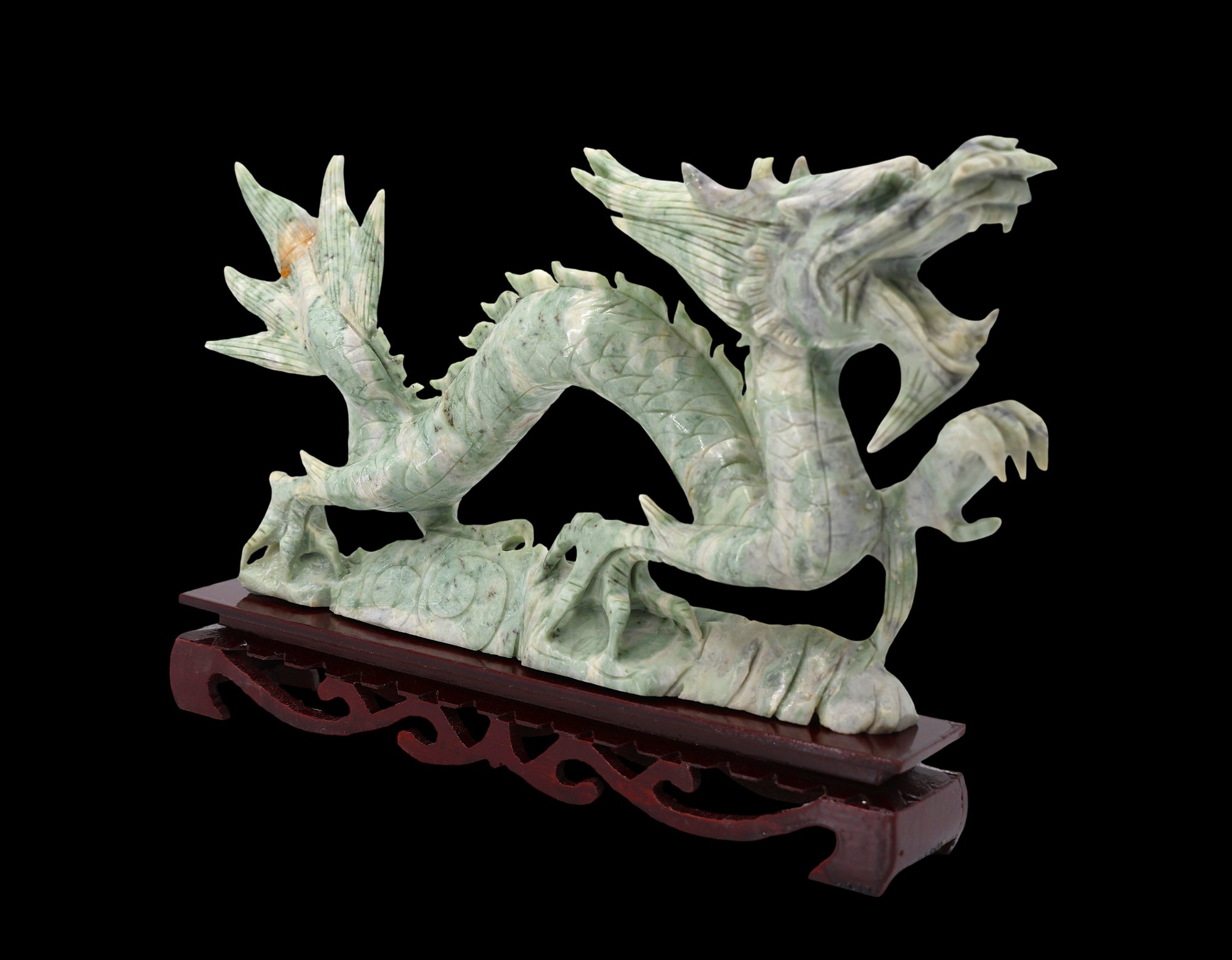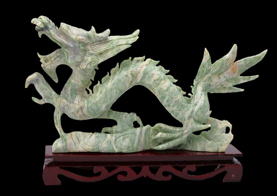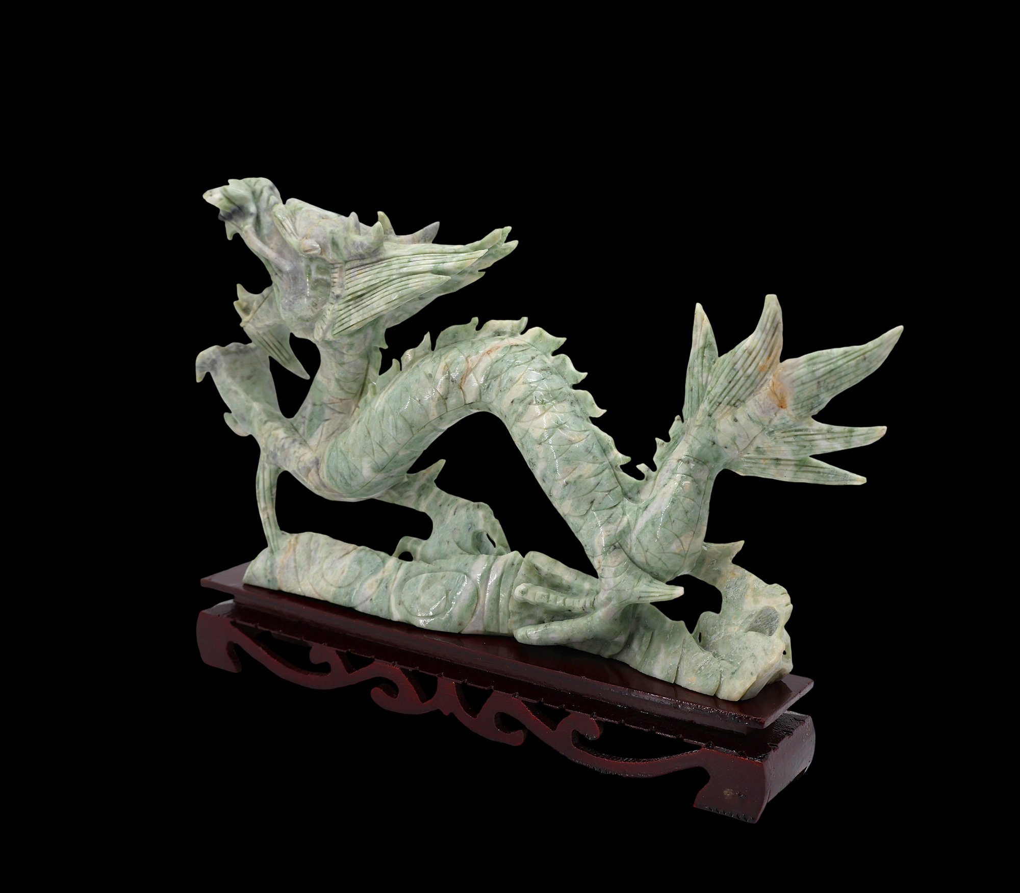 Hand-carved jade dragon statue mounted on a wooden display base. Crafted from natural jade, either nephrite or jadeite, it is a symbol of power and nobility in Asian traditions. Often used as home decor and Feng Shui item, it is believed to attract good luck and wealth. The statue features detailed carving of the dragon's scales and facial features. The jade shows natural color variations in green and white, with signs of age or fractures that add character and authenticity. It has a glued fin (see photo) and exhibits fine detail - 13.5" W x 7.5" H. comes with original box