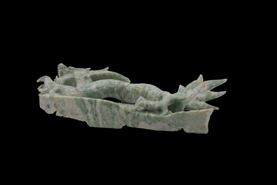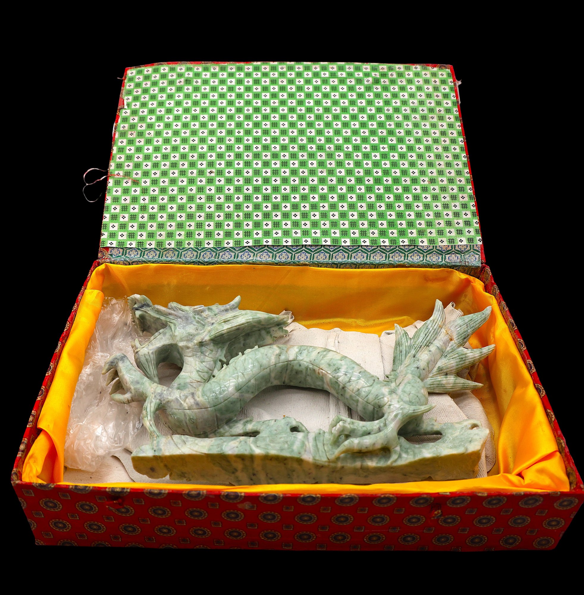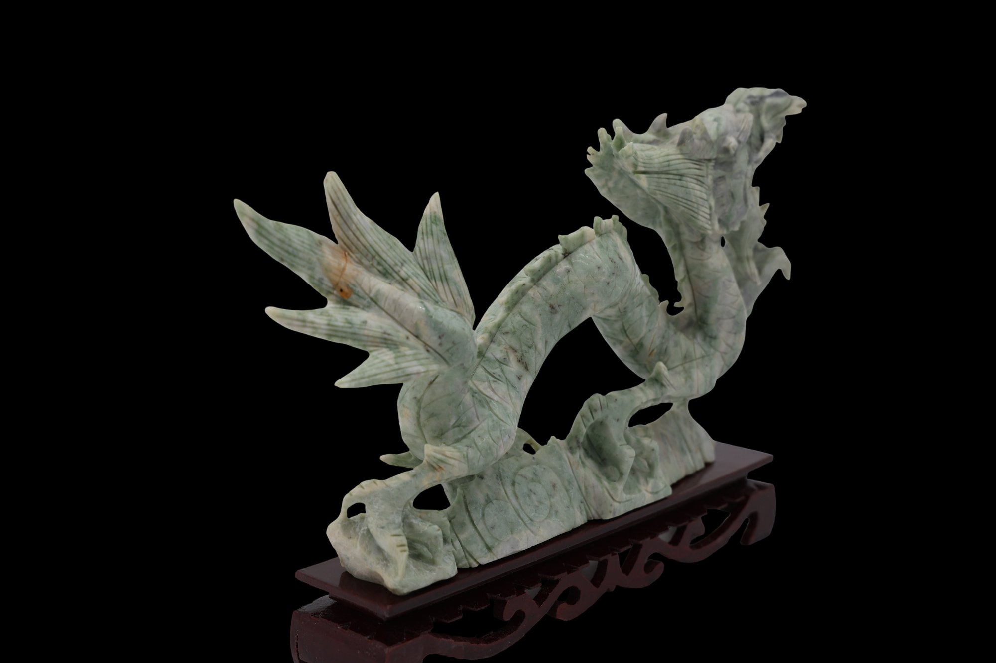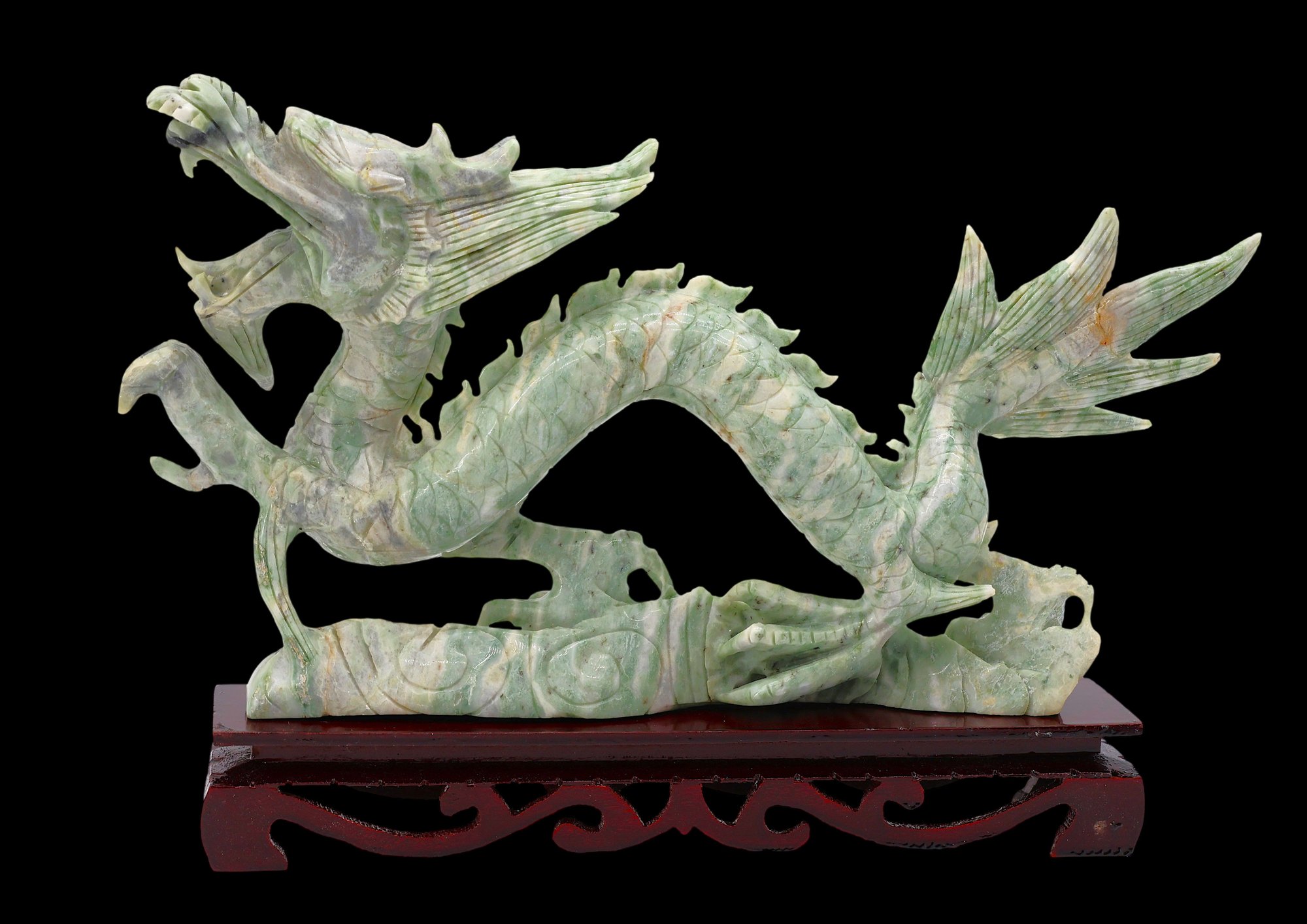 Hand-carved jade dragon statue mounted on a wooden display base. Crafted from natural jade, either nephrite or jadeite, it is a symbol of power and nobility in Asian traditions. Often used as home decor and Feng Shui item, it is believed to attract good luck and wealth. The statue features detailed carving of the dragon's scales and facial features. The jade shows natural color variations in green and white, with signs of age or fractures that add character and authenticity. It has a glued fin (see photo) and exhibits fine detail - 13.5" W x 7.5" H. comes with original box