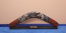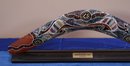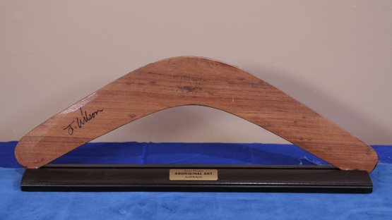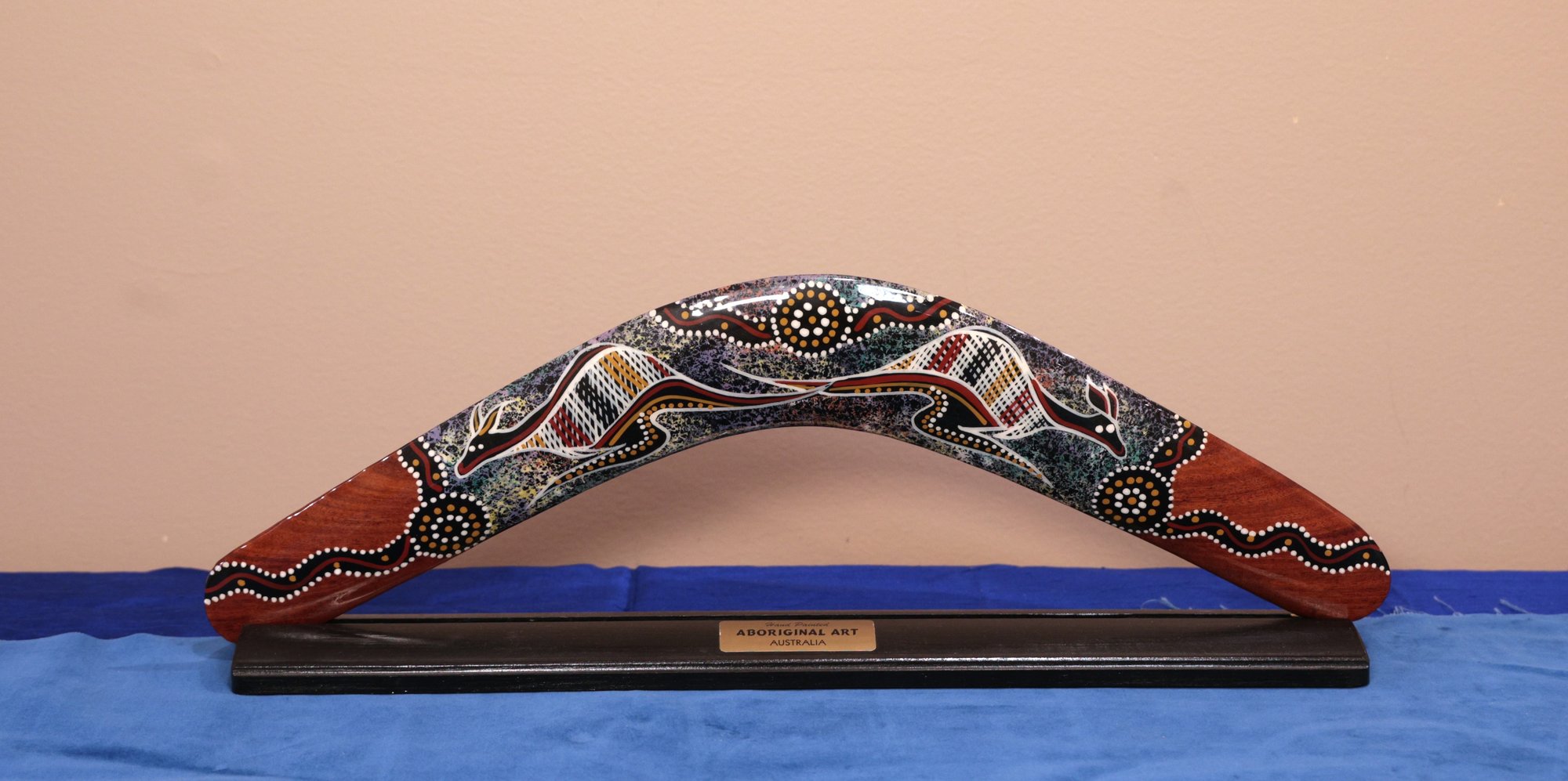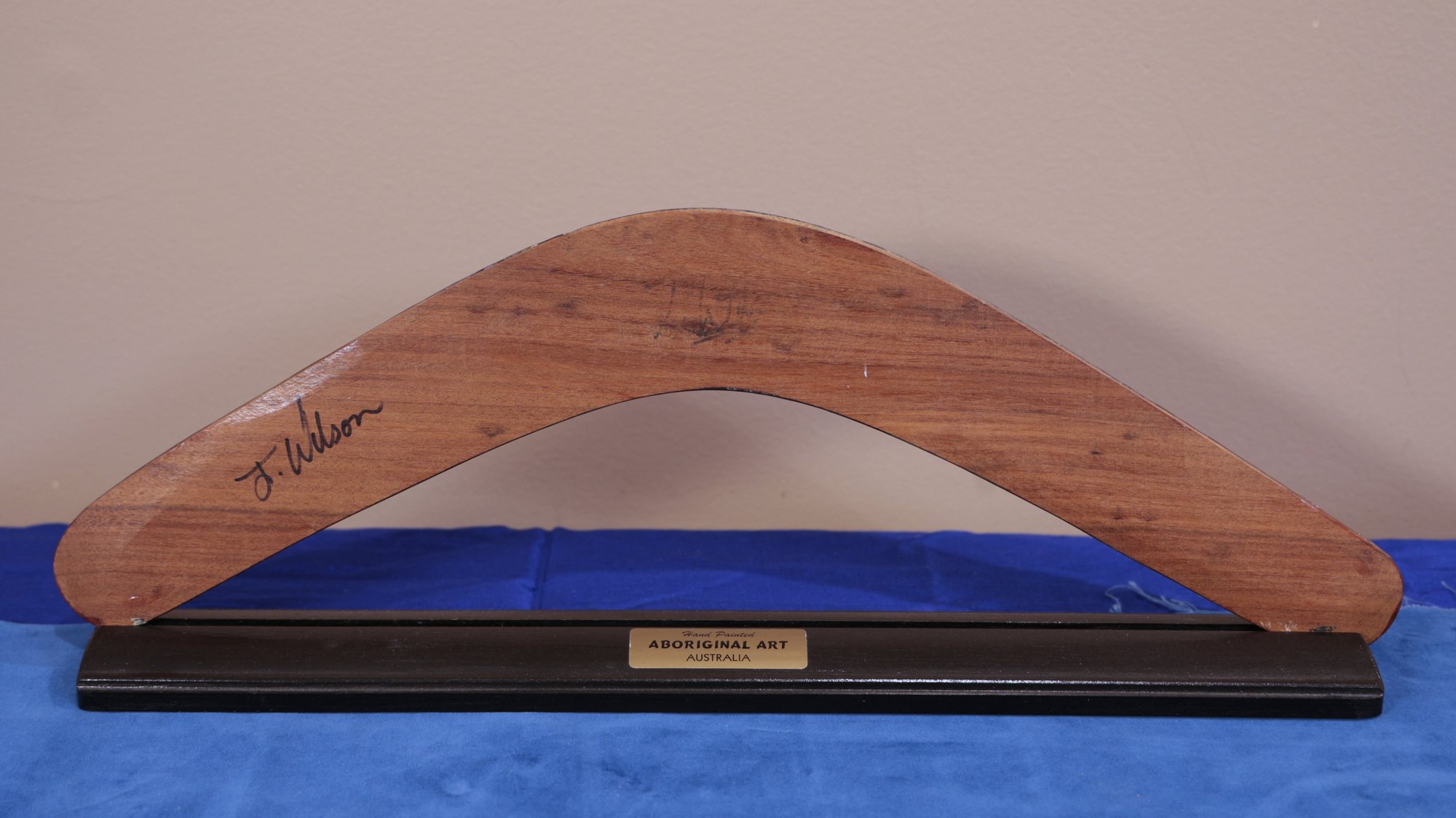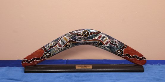 Hand-painted Aboriginal Art Boomerang signed with stand