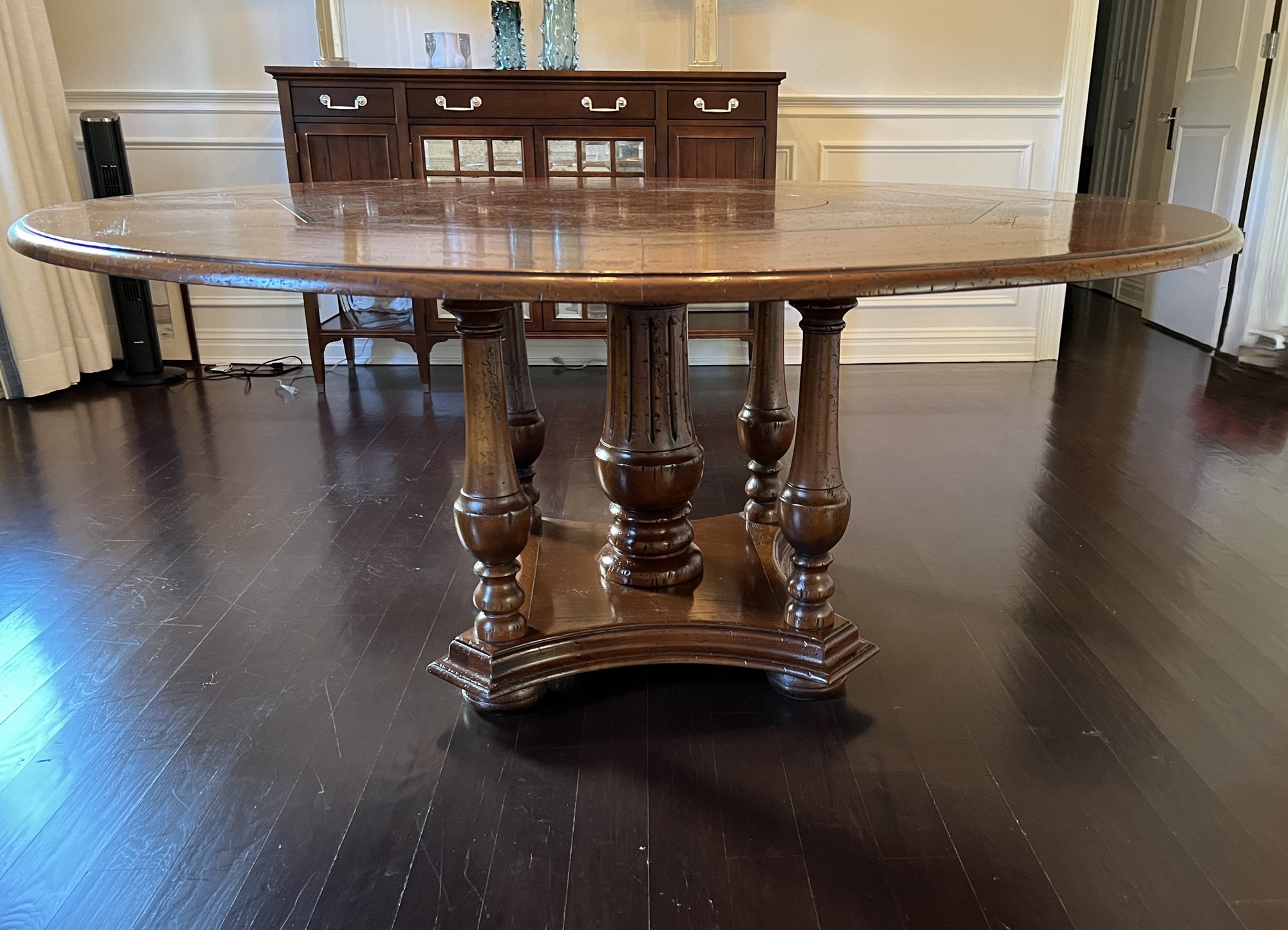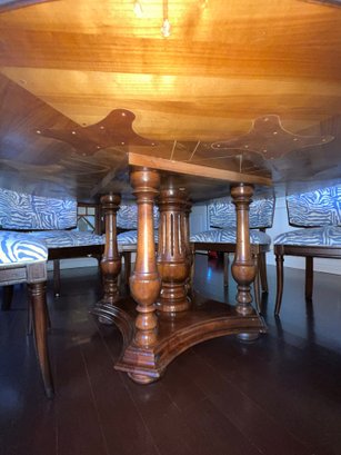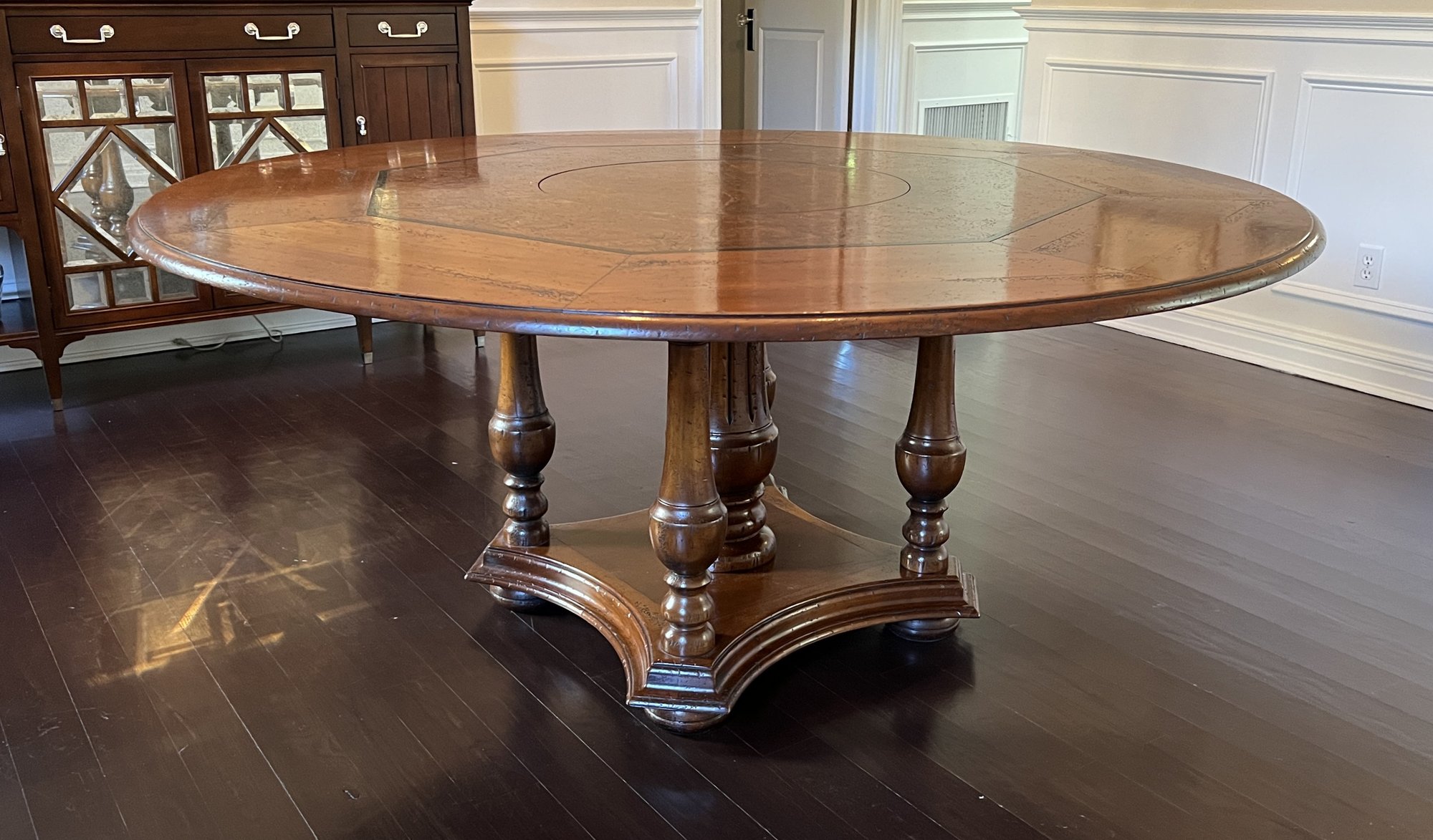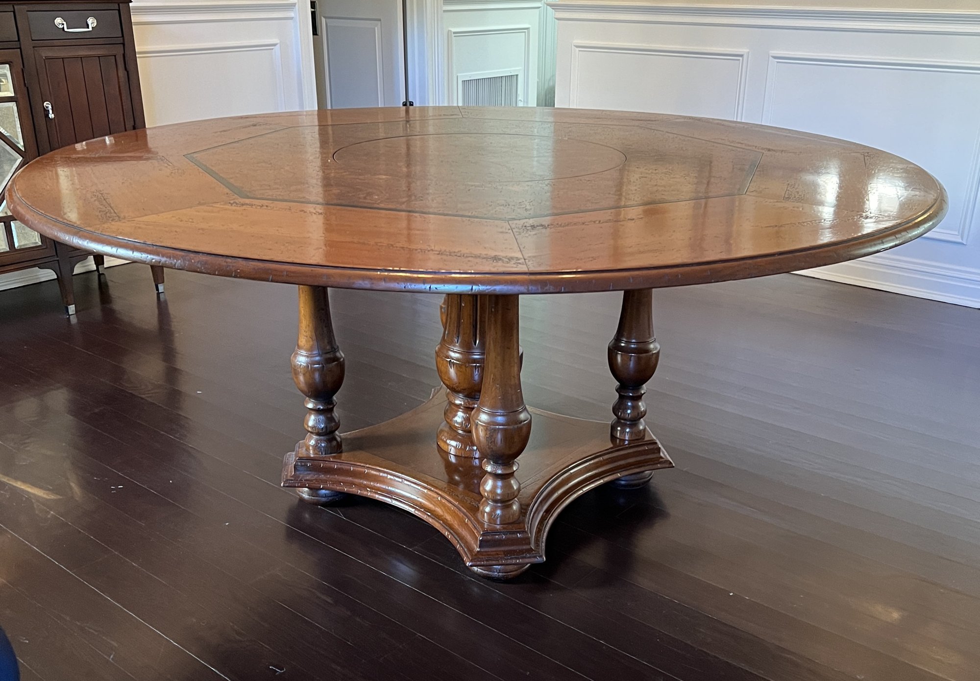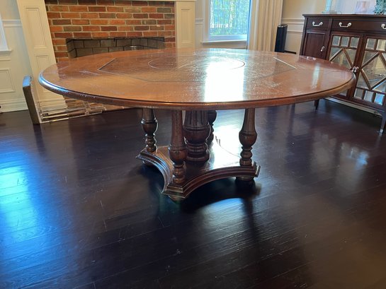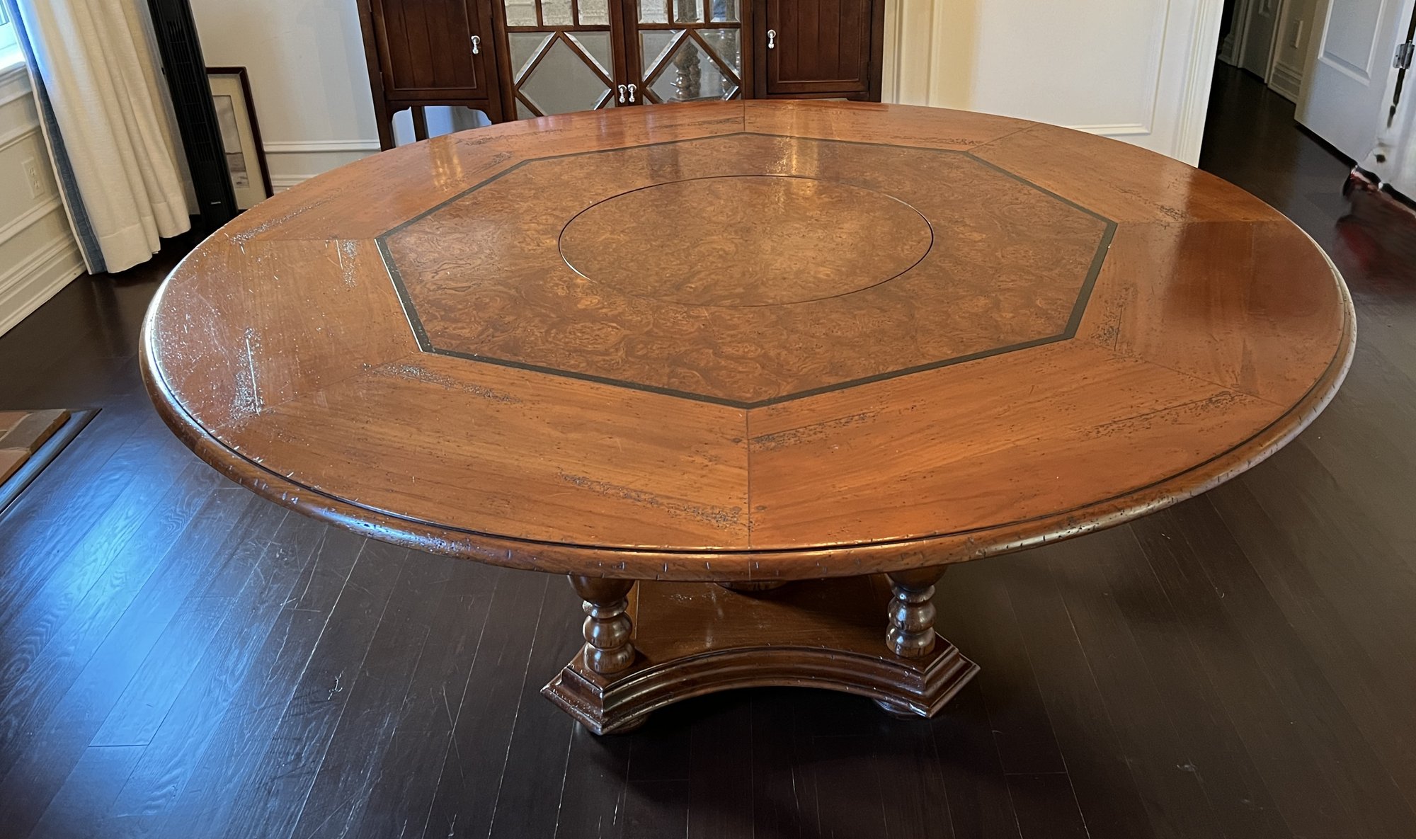 Beautiful handcrafted French cherry wood dining table with parquet top and Ebony marquetry. Octagon band surrounding a walnut burl center. Lazy Susan in the center (needs a little WD-40) on an elaborate carved center urn pedestal with four surrounding supports.
