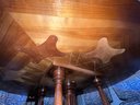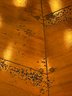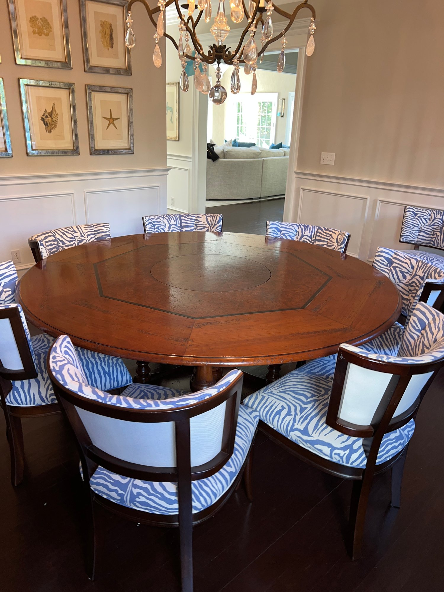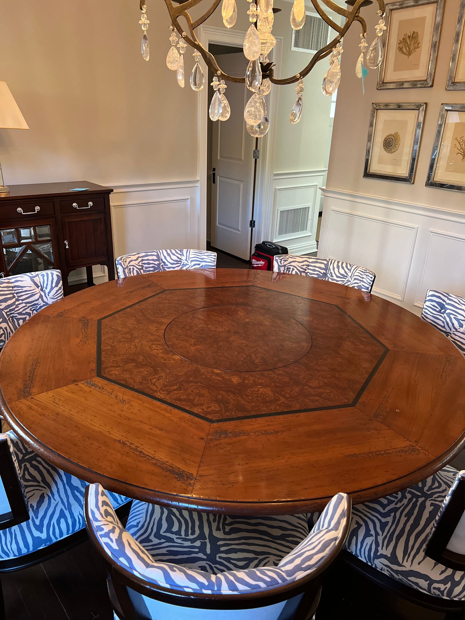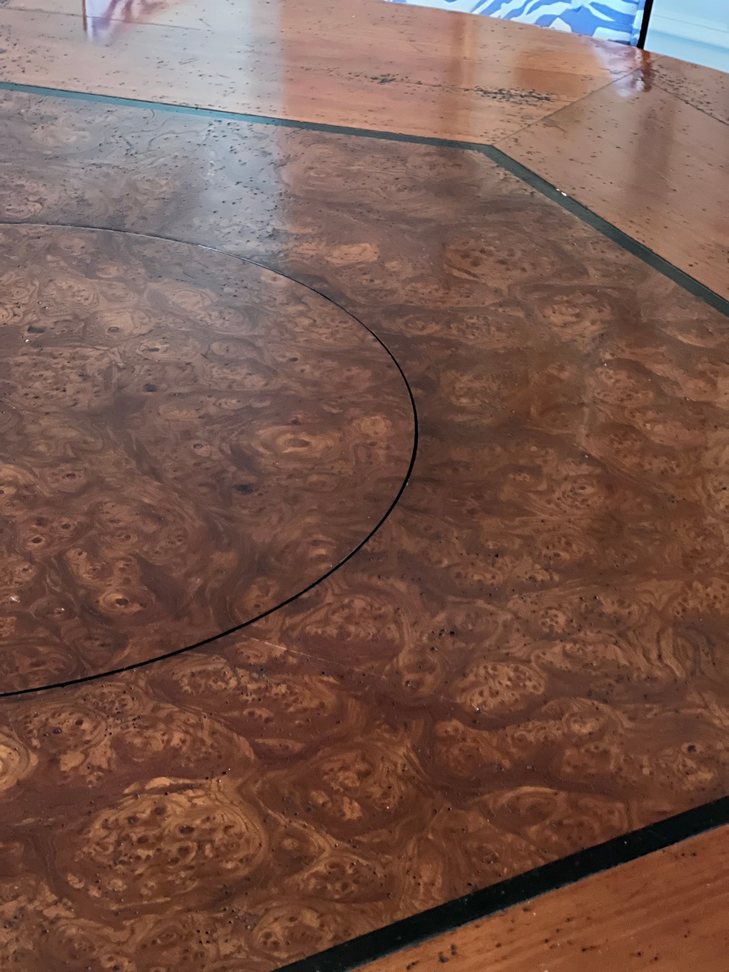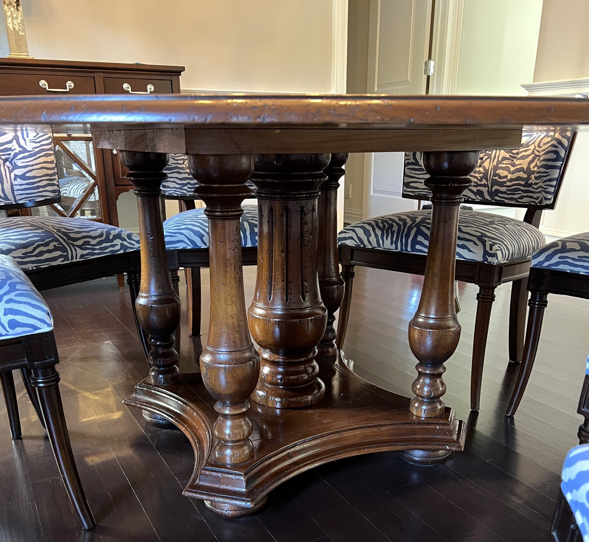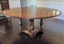Beautiful handcrafted French cherry wood dining table with parquet top and Ebony marquetry. Octagon band surrounding a walnut burl center. Lazy Susan in the center (needs a little WD-40) on an elaborate carved center urn pedestal with four surrounding supports.