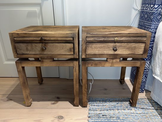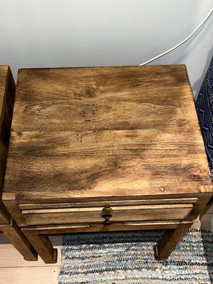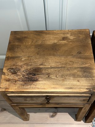 Handcrafted pair of Mango wood side tables , medium finish that accentuates the wood's rich organic grain.