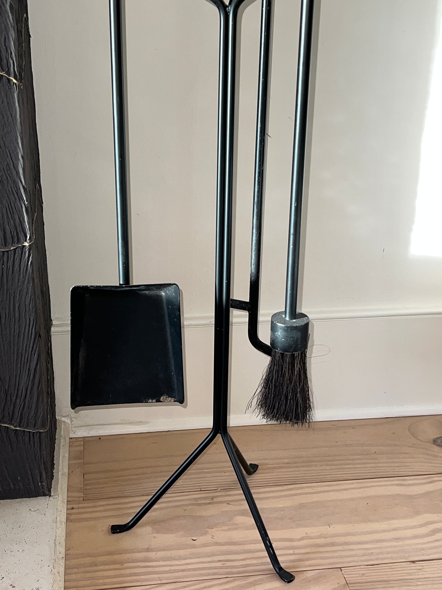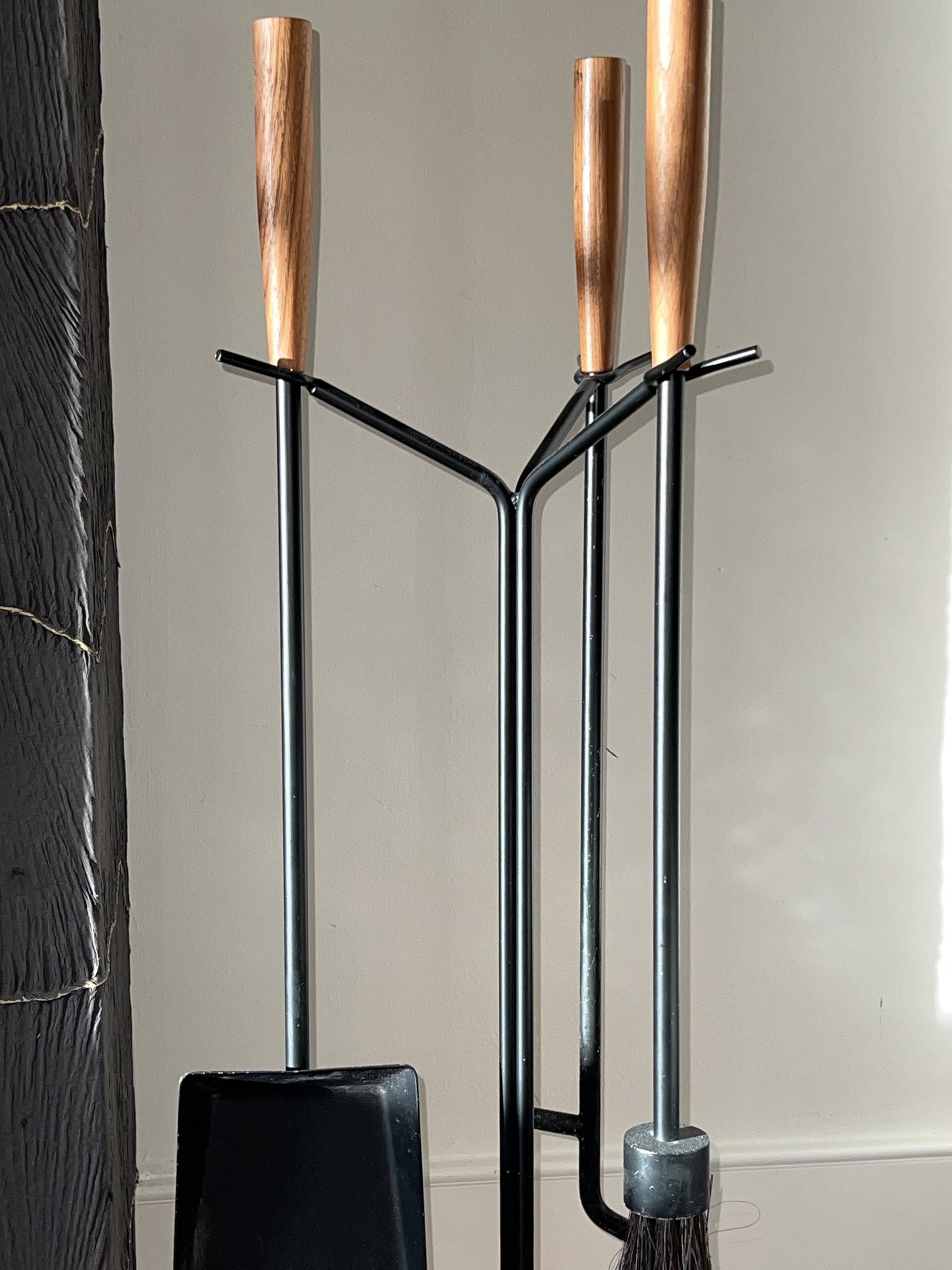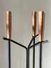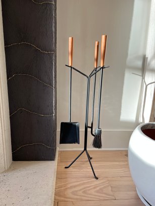 This is a George Nelson fireplace tool set designed for Herman Miller. Made of Powder coated steel in black with walnut handles. Includes stand, poker, brush and shovel.