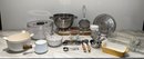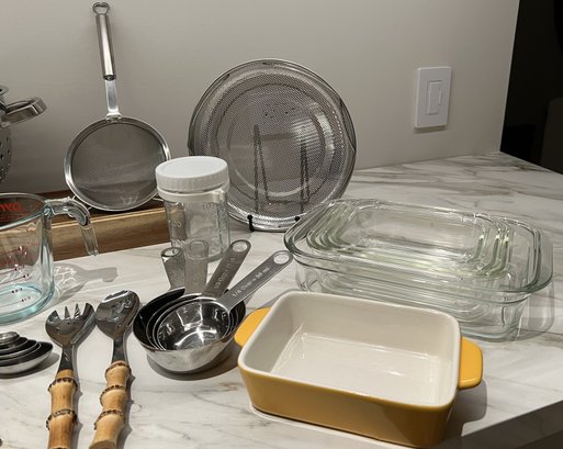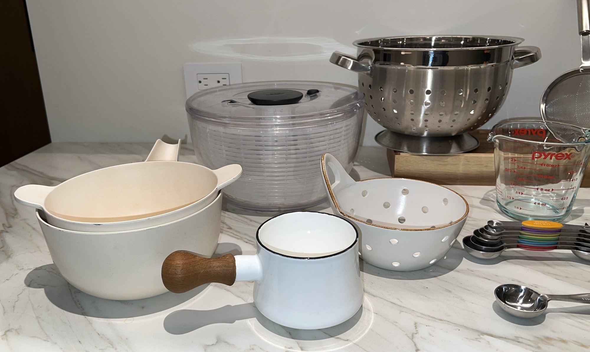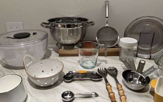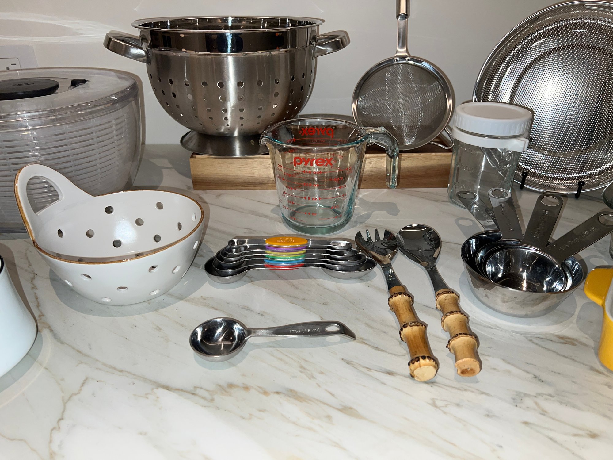 Bowls,rolling pins, measuring tools, scale, Dansk koben style white porcelain small pourer, strainers, salad spinner, Crate and Barrel pan and more!!