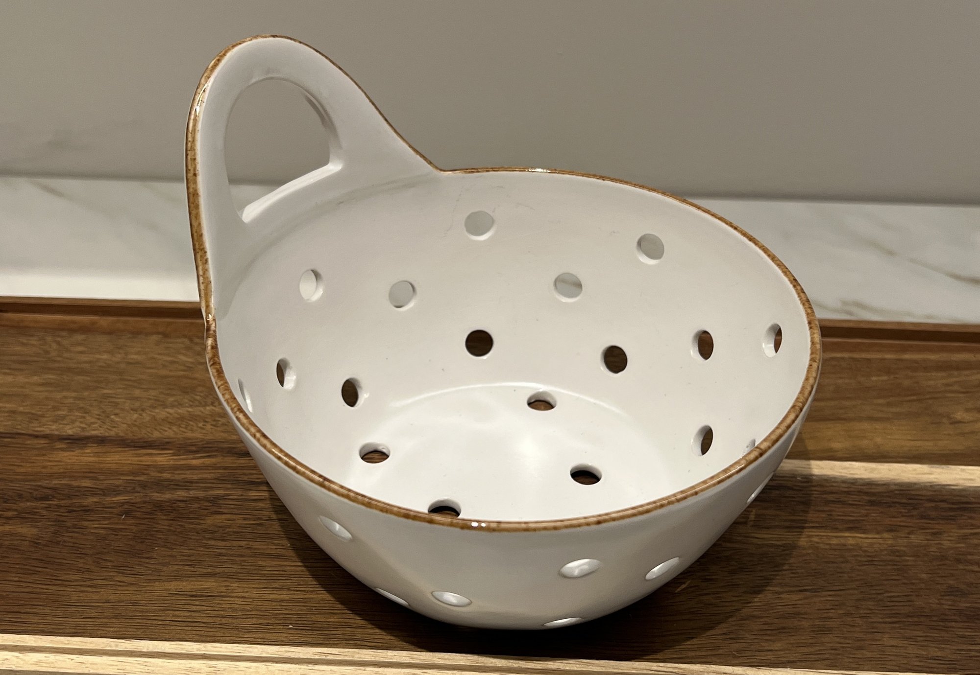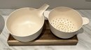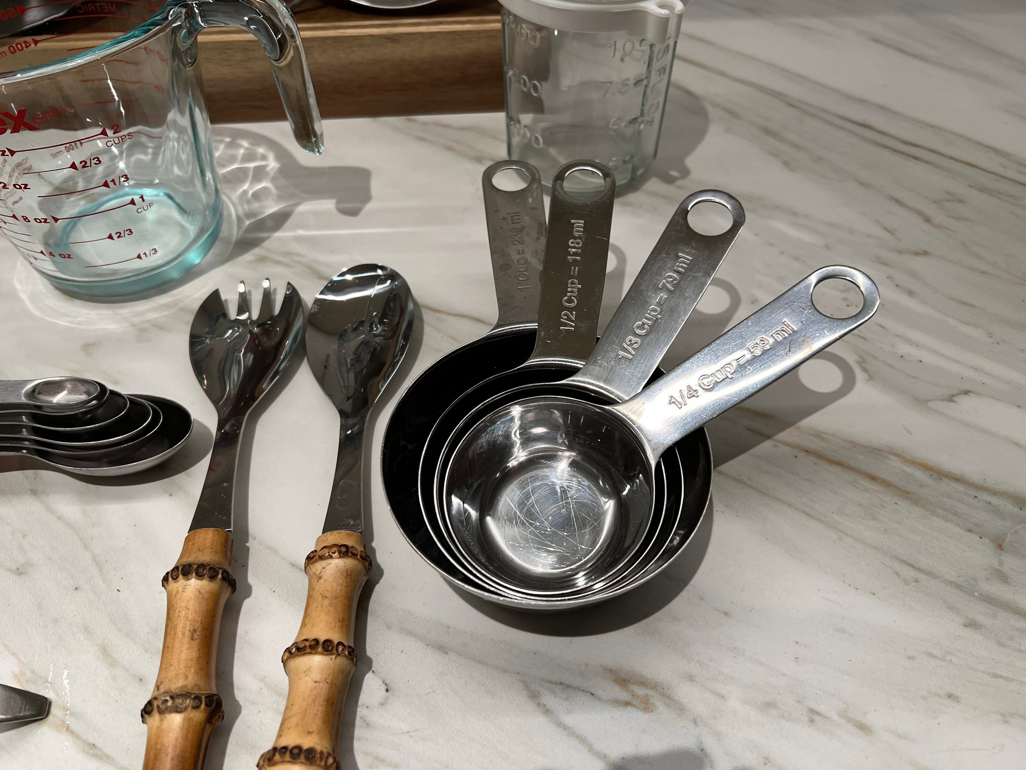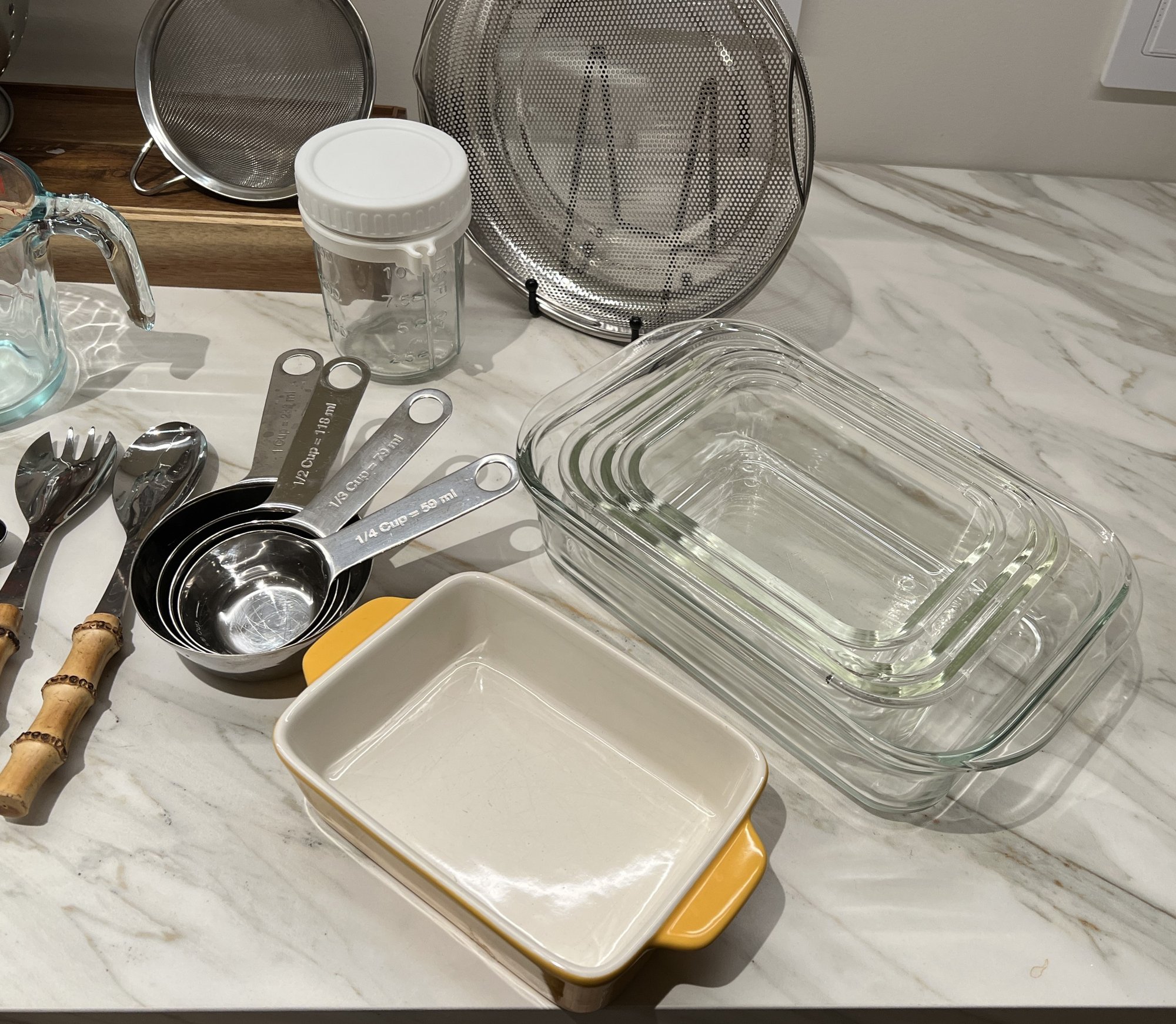 Bowls,rolling pins, measuring tools, scale, Dansk koben style white porcelain small pourer, strainers, salad spinner, Crate and Barrel pan and more!!