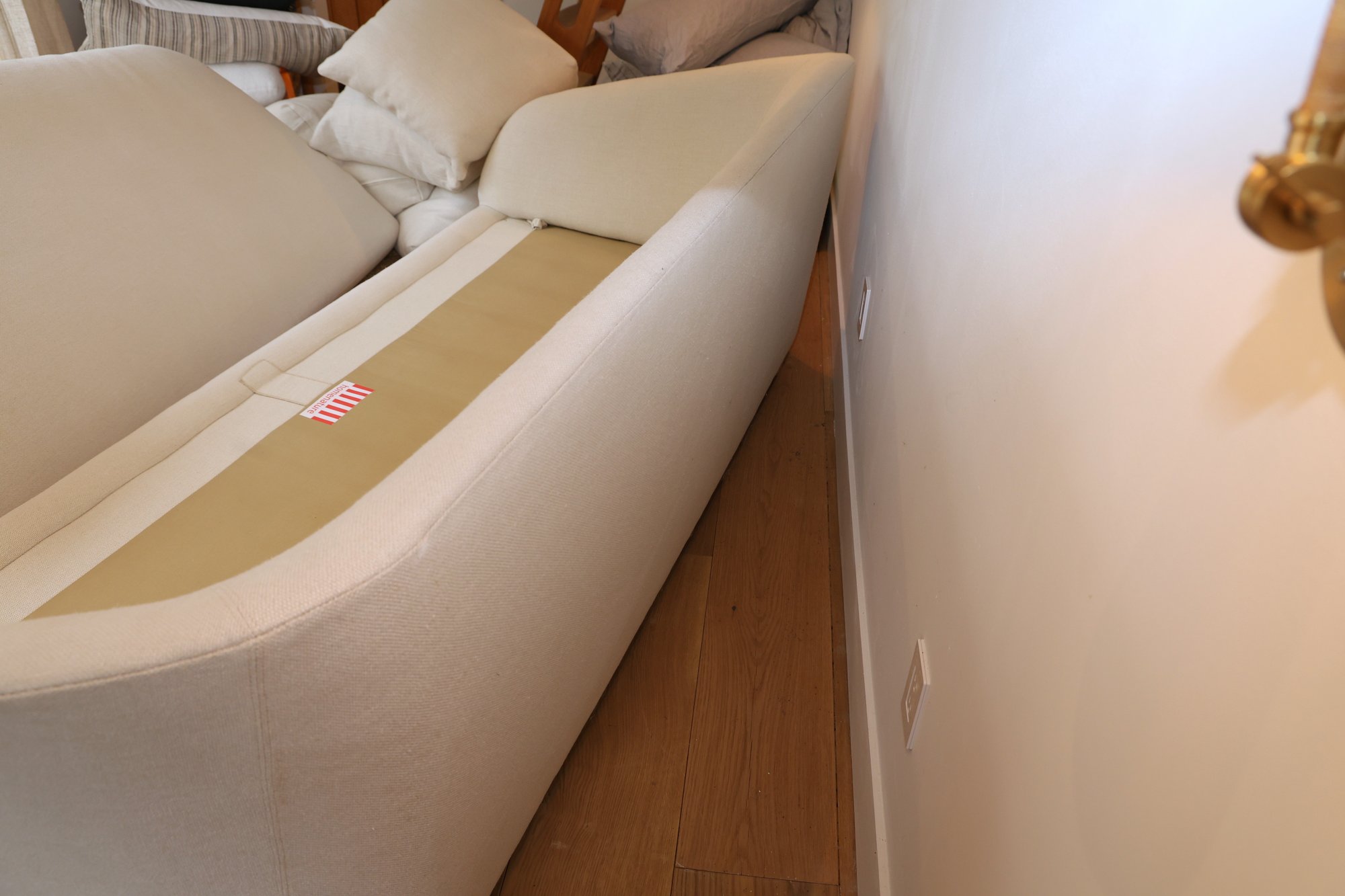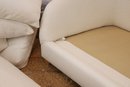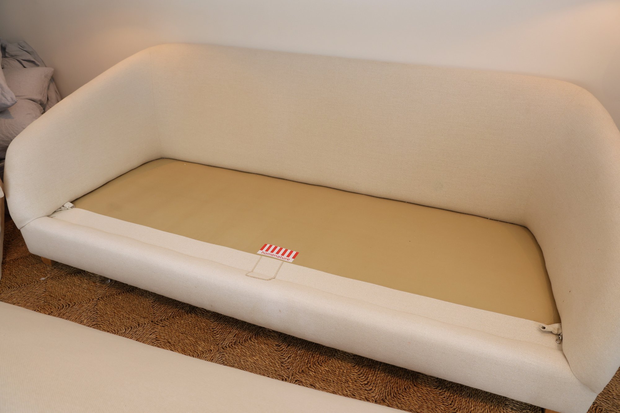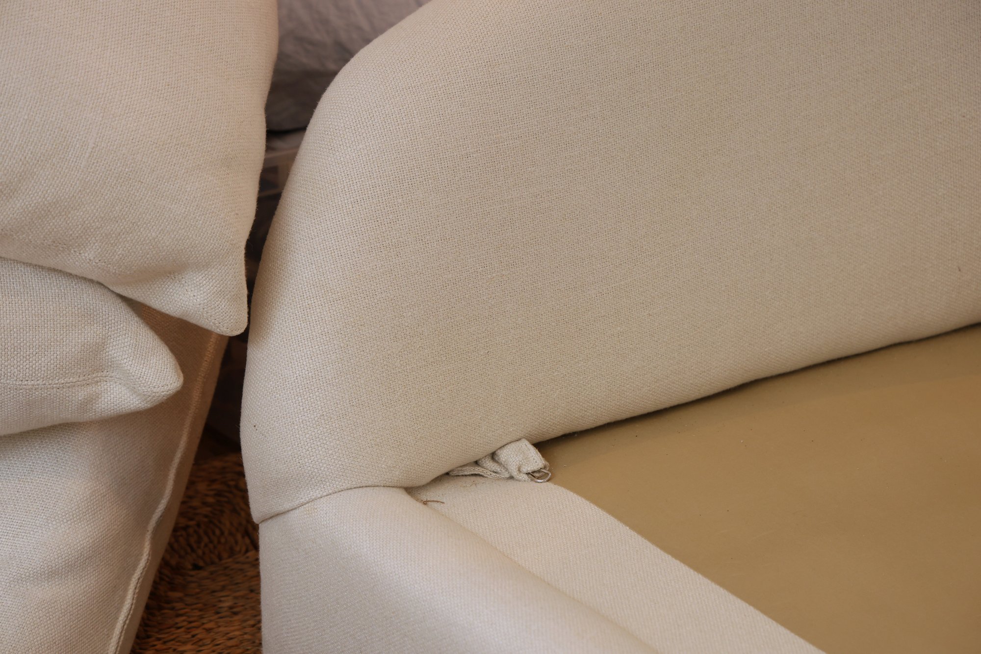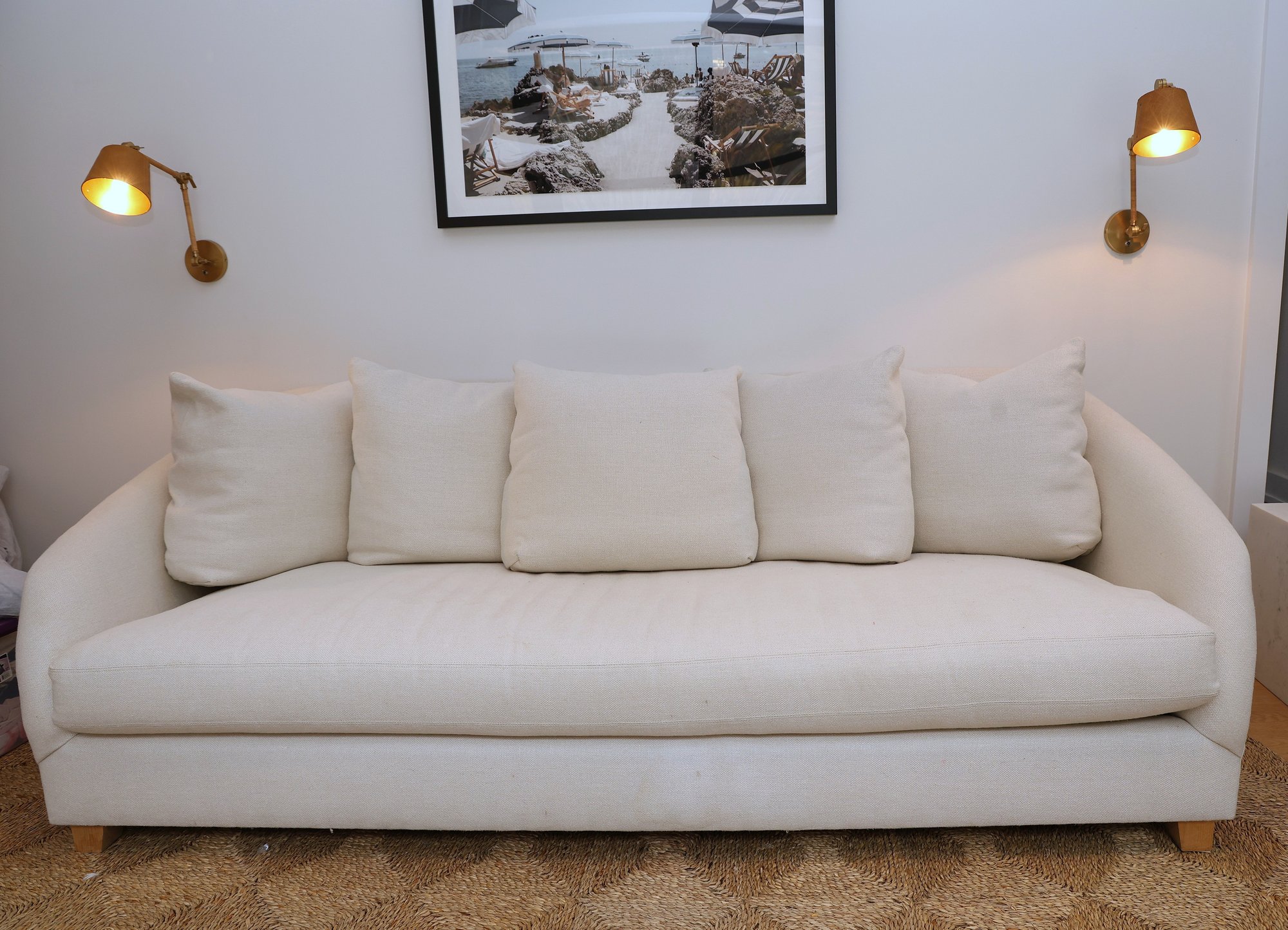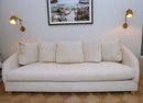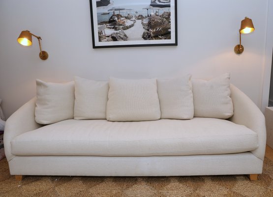 HomeNature Curved Arm Linen Sofa and five loose pillows. One hefty single cushion that can be flipped!! Heavy hi-end linen ivory texture.