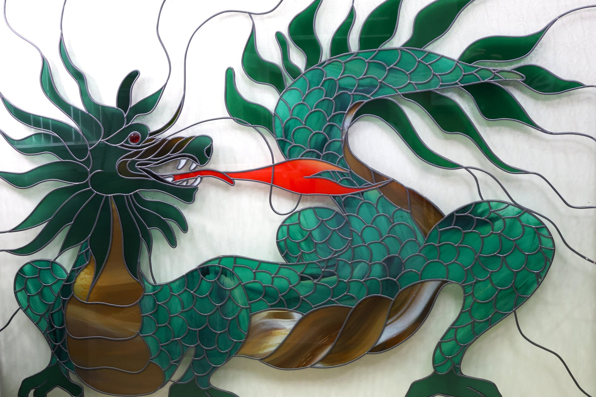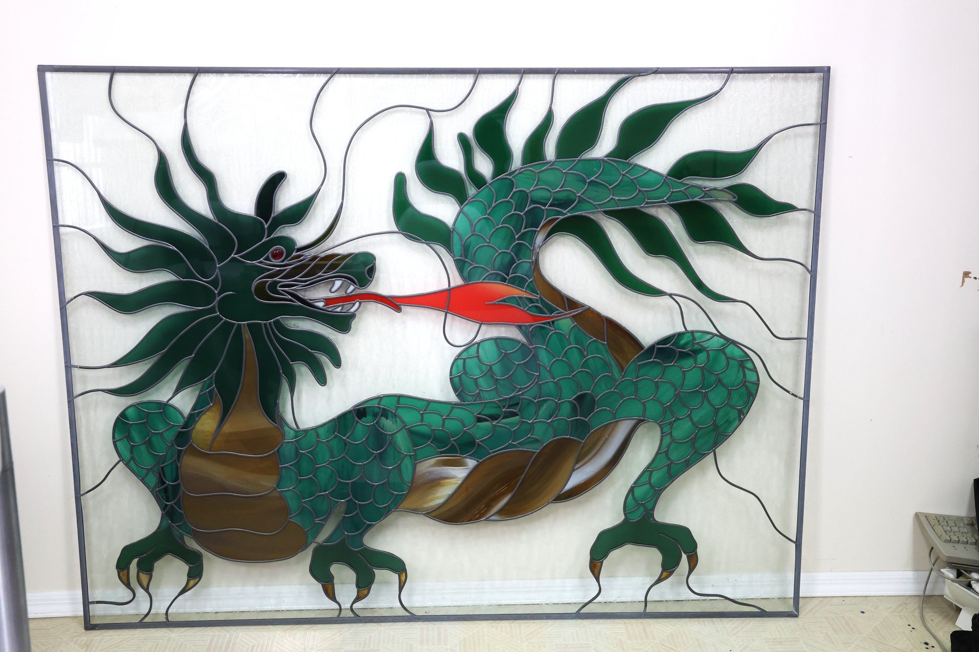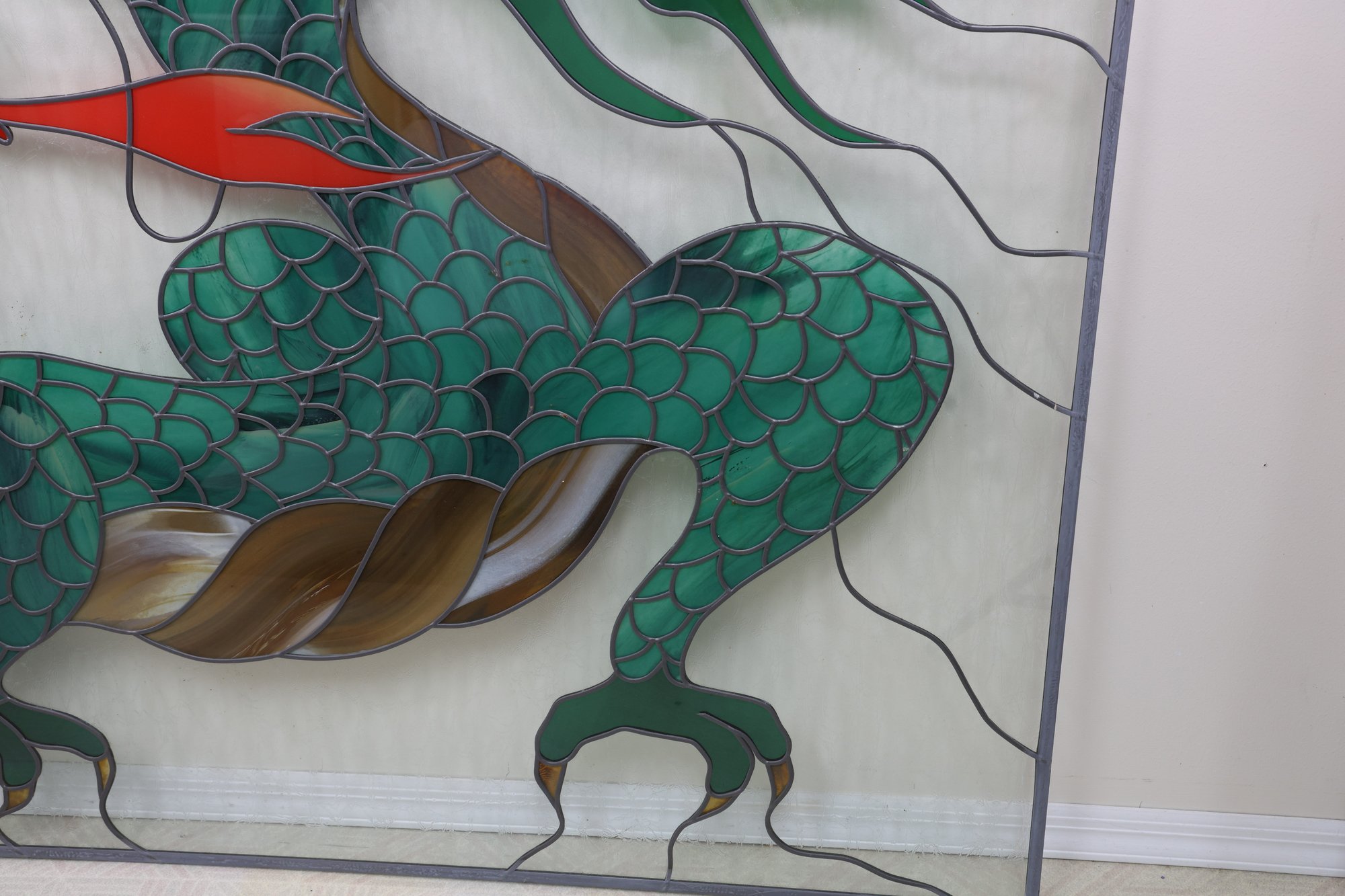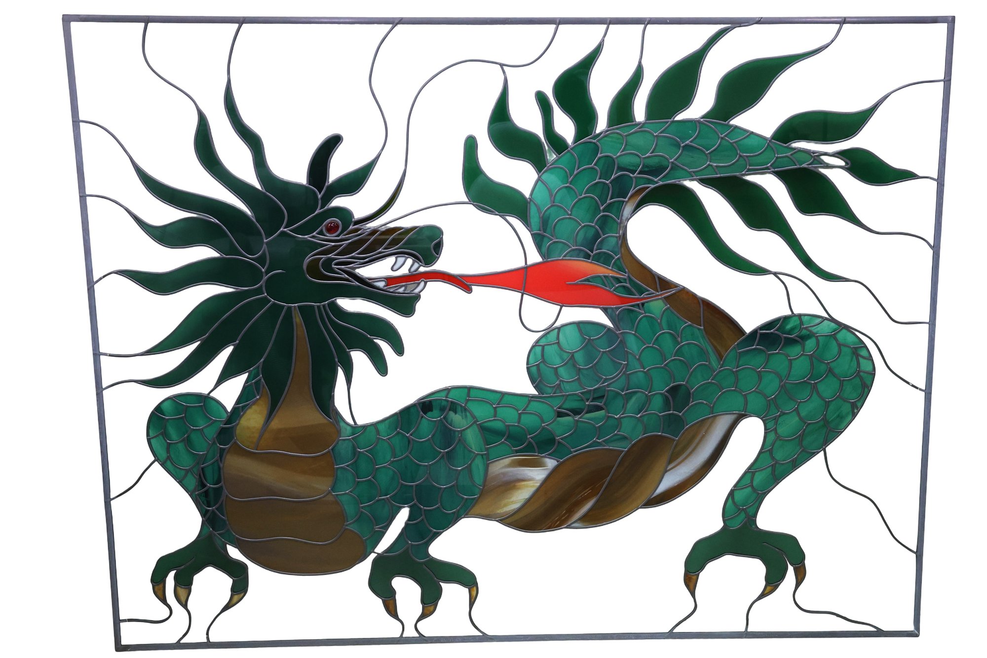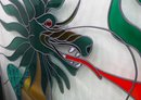 This stained-glass panel depicts a Chinese dragon with a vivid green body, a red eye, and a red tongue. The design employs green, red, yellow, and white or clear glass, producing a bold contrast. 63"W x 48"L