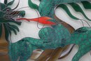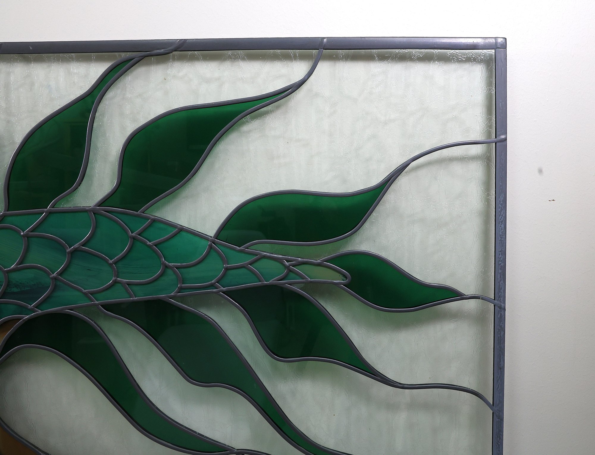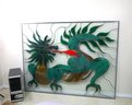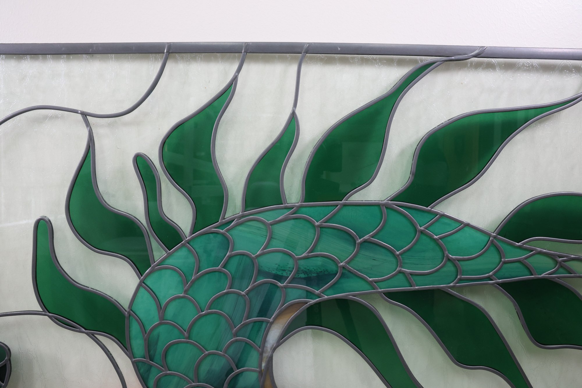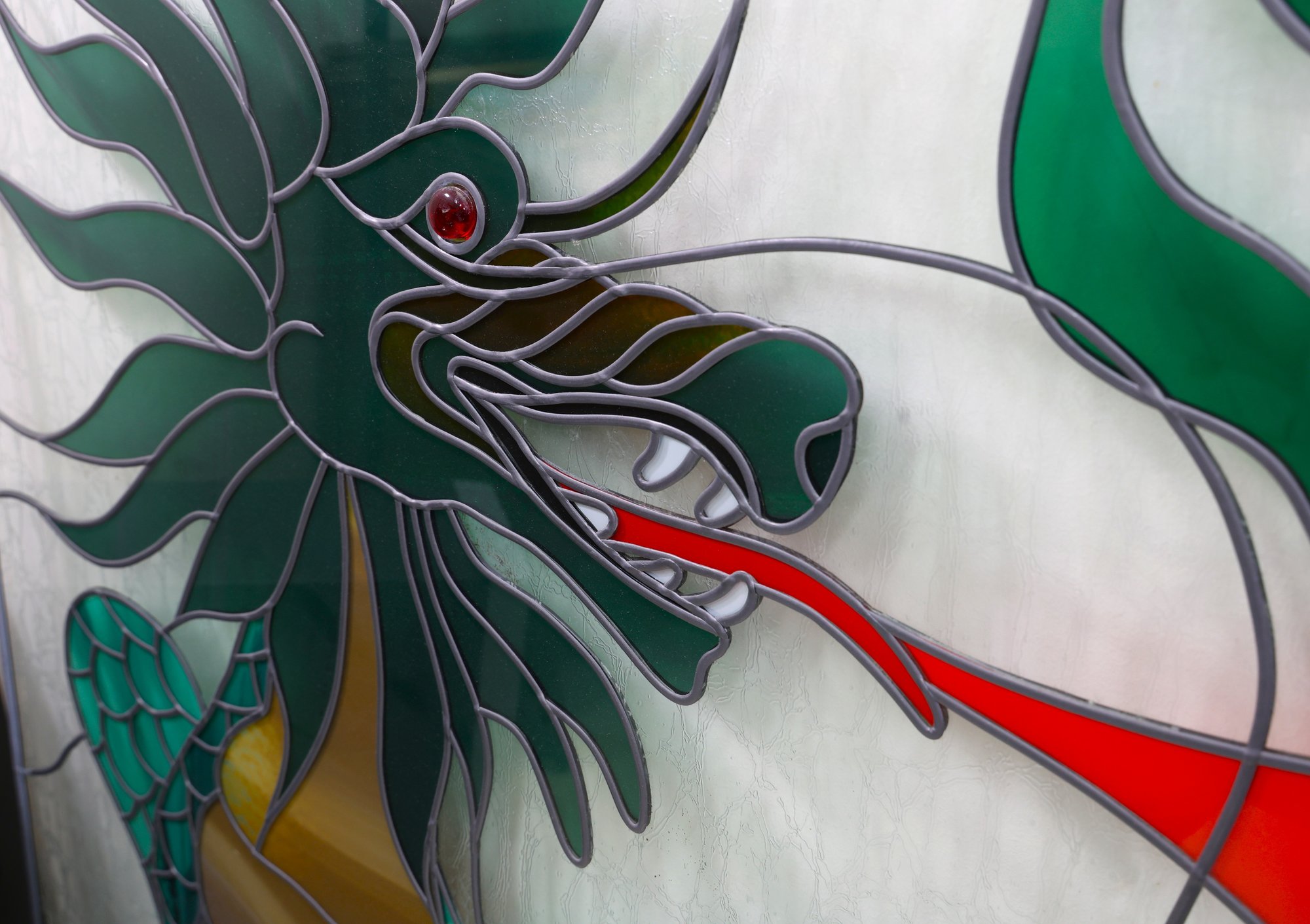 This stained-glass panel depicts a Chinese dragon with a vivid green body, a red eye, and a red tongue. The design employs green, red, yellow, and white or clear glass, producing a bold contrast. 63"W x 48"L