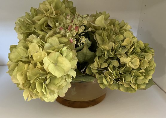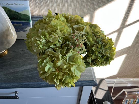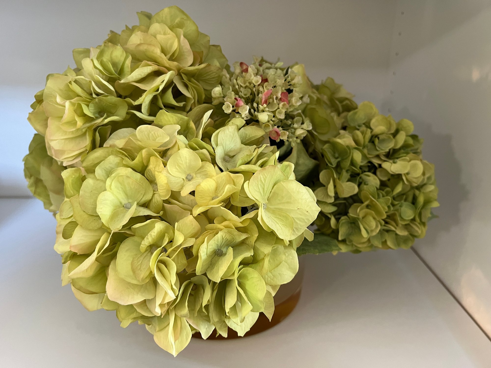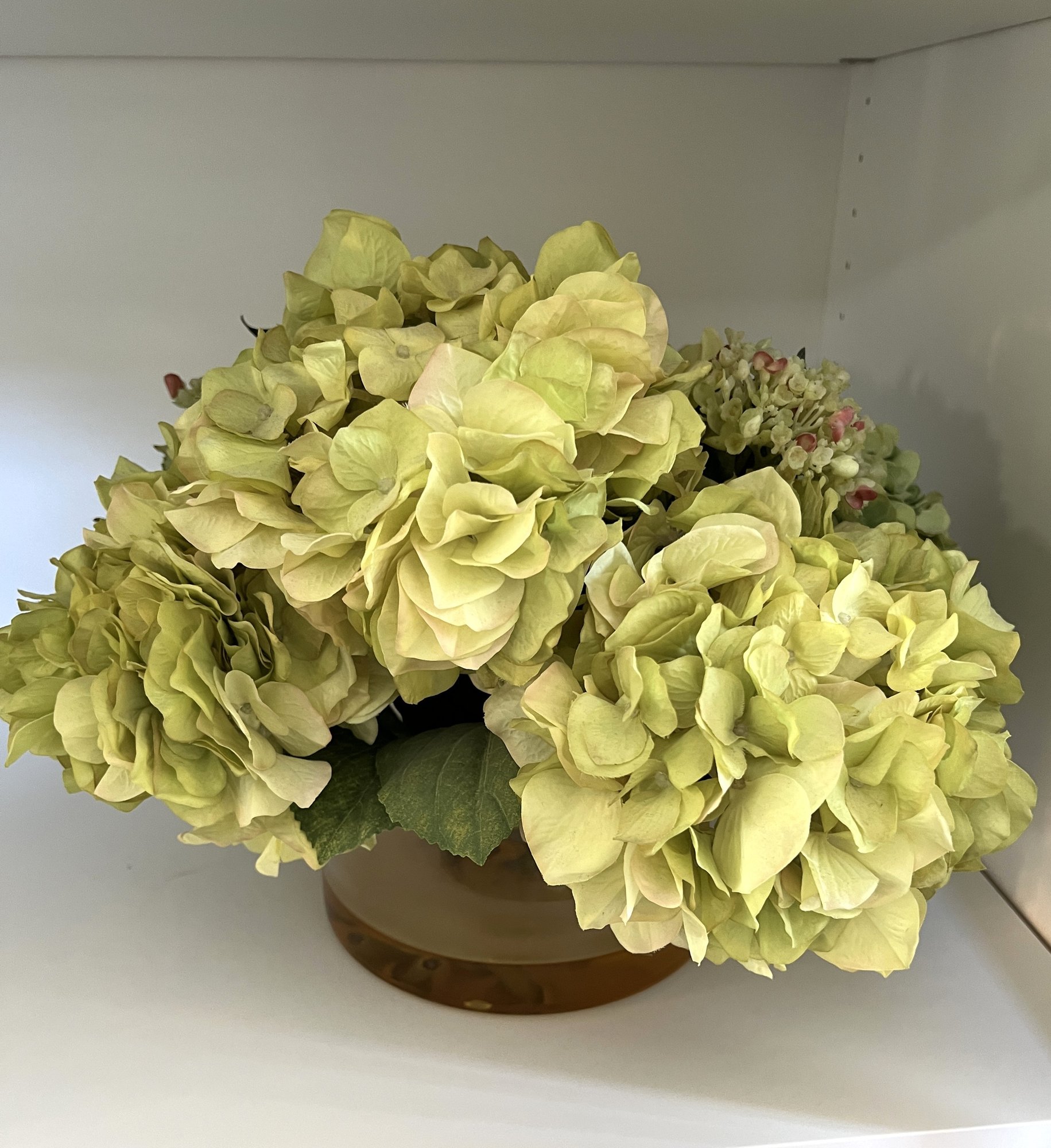 Faux Hydrangea flowers with hand made glass vase by New Growth