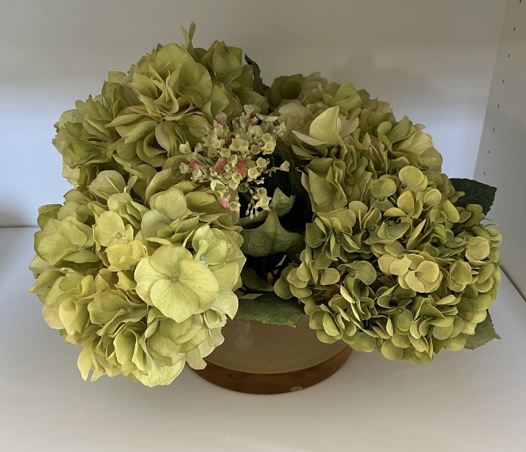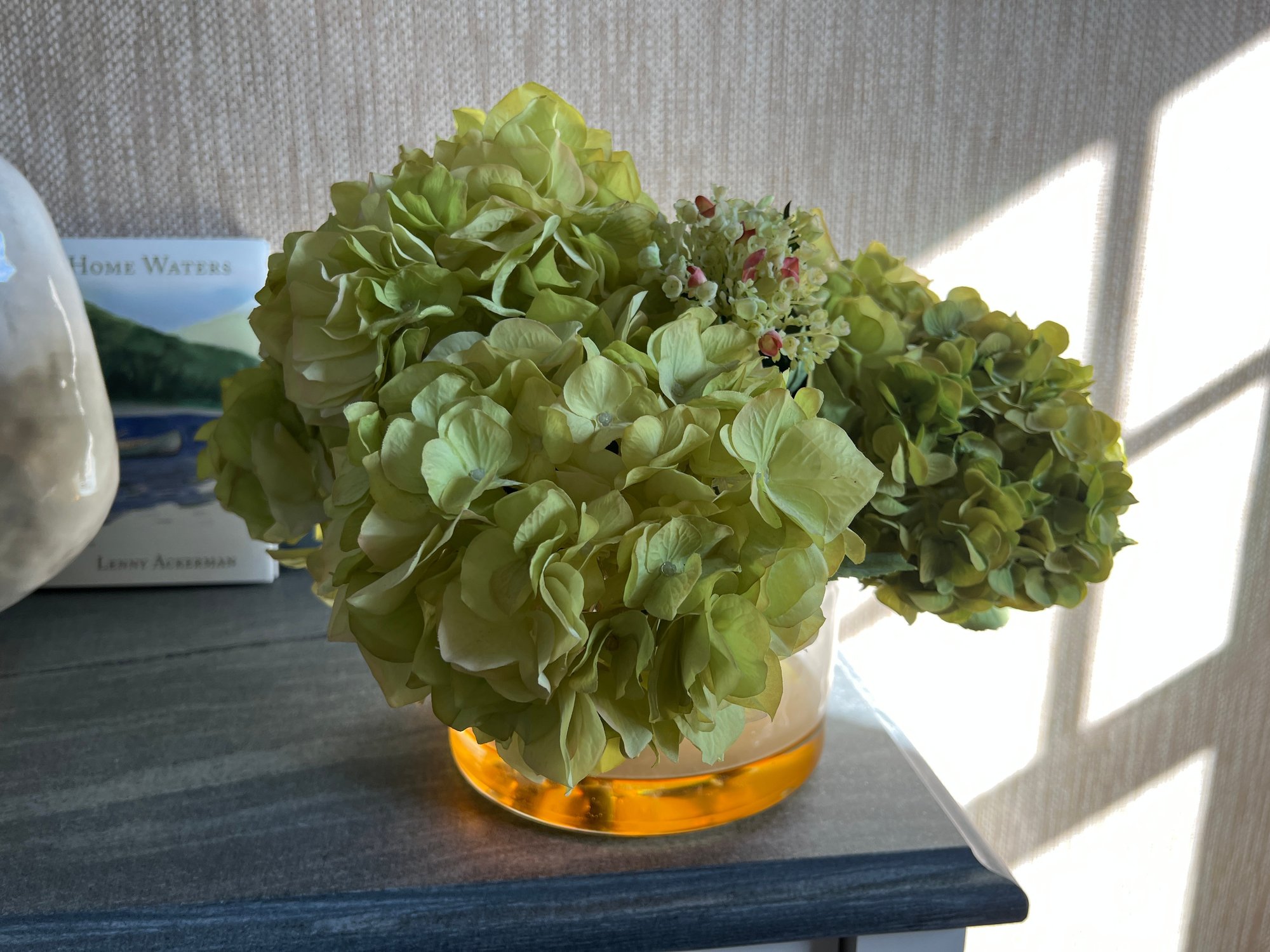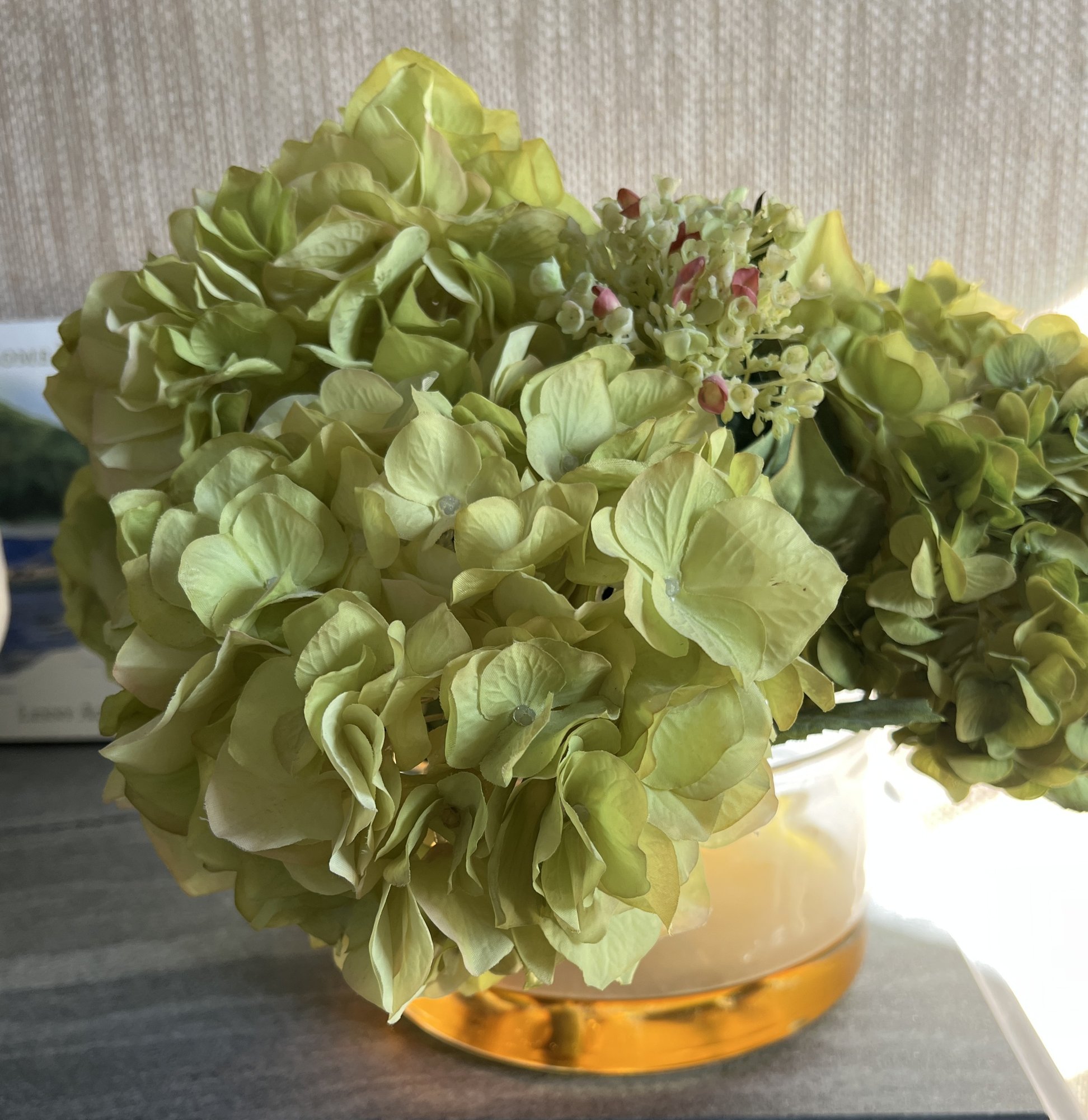 Faux Hydrangea flowers with hand made glass vase by New Growth