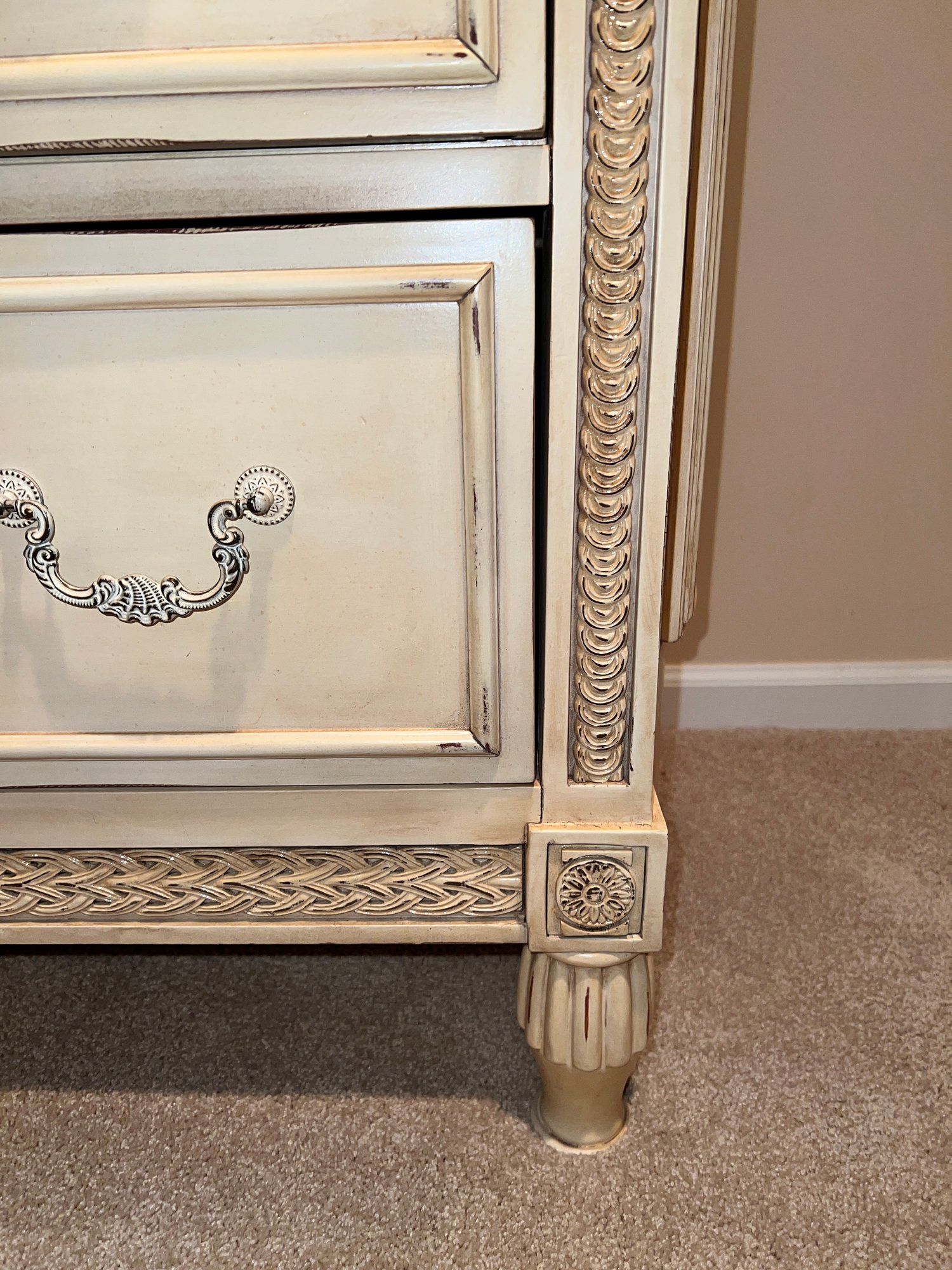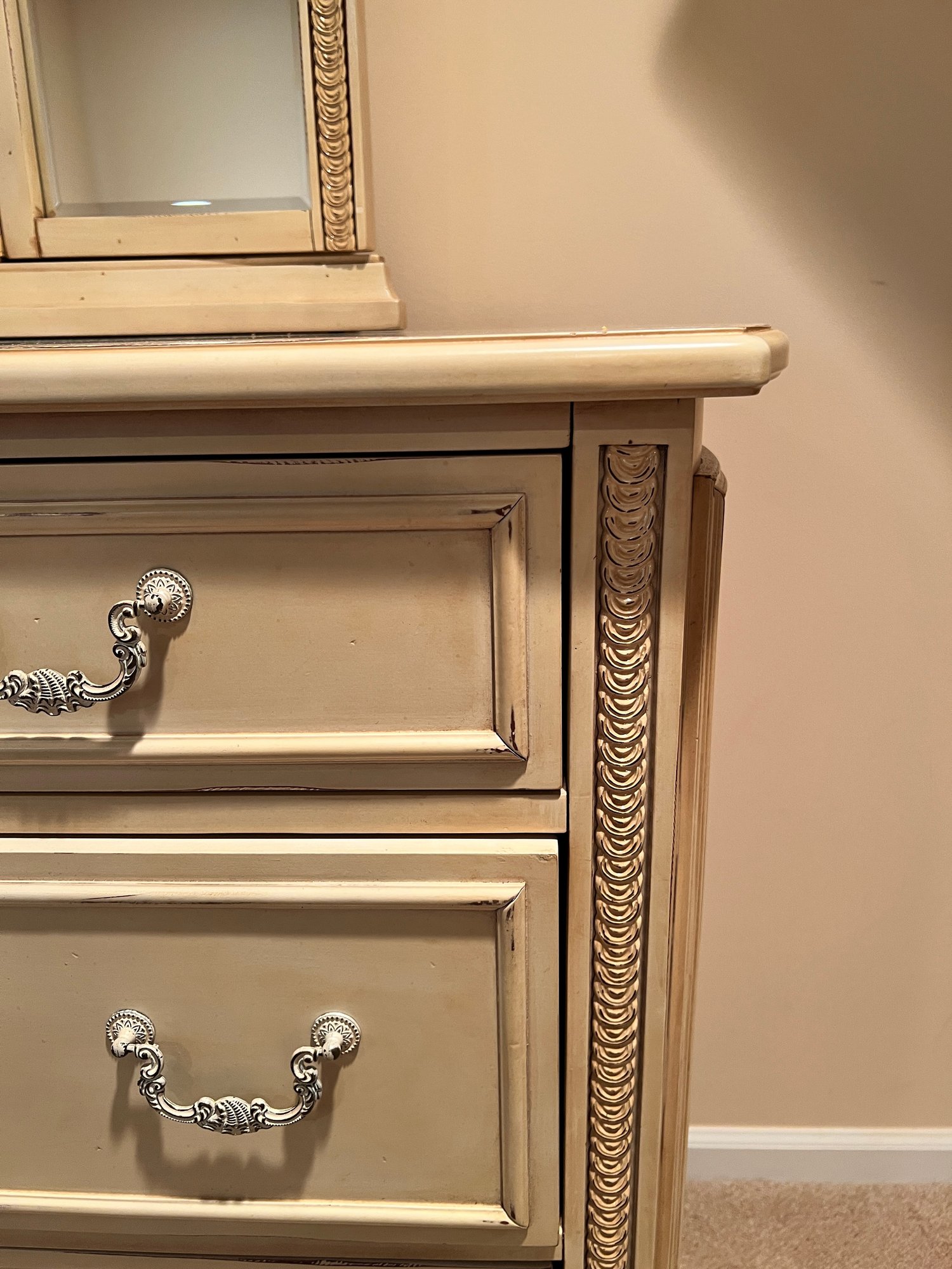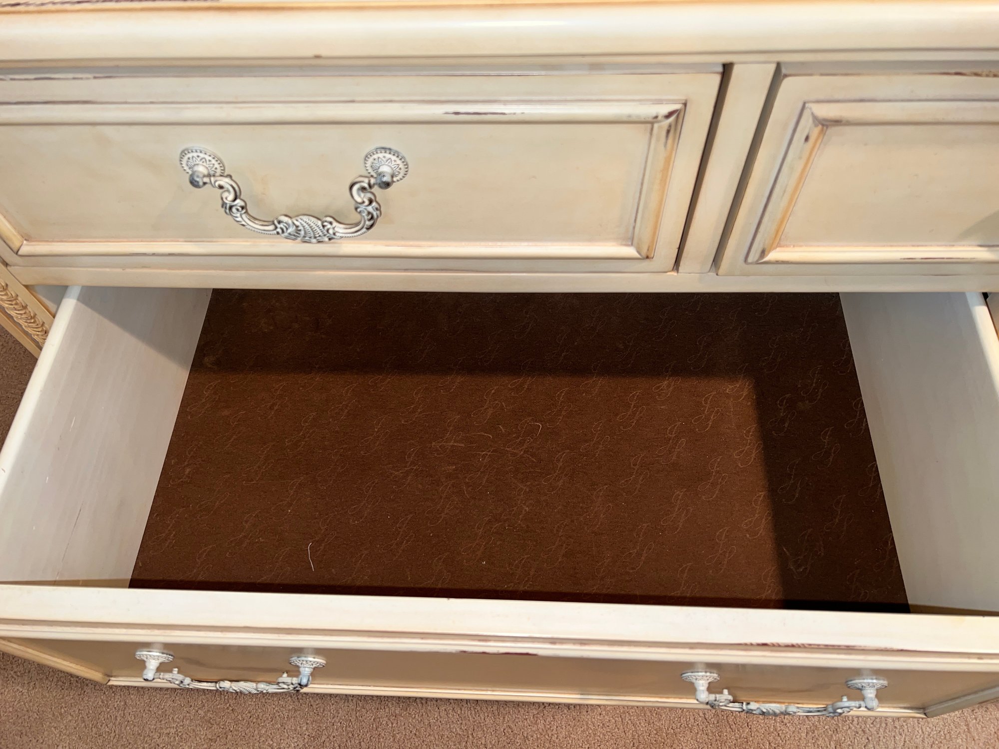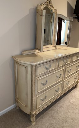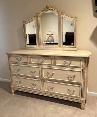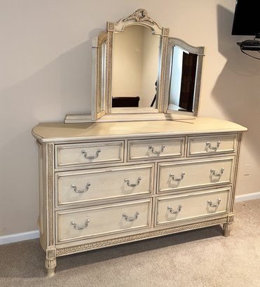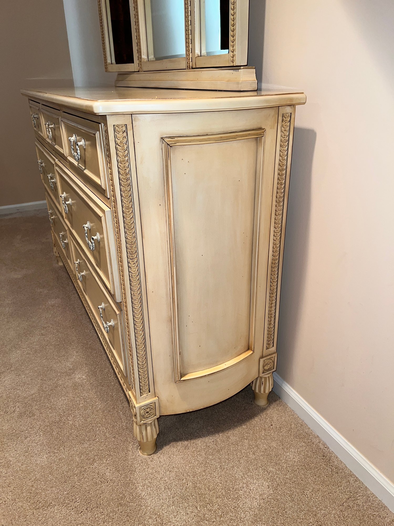 Jaclyn Smith Dresser With Adjustable Mirror. Seven drawers felt lined and pulled in and out smoothly. The mirror has three panels and two adjustable panels. Ivory color - Professional mover required