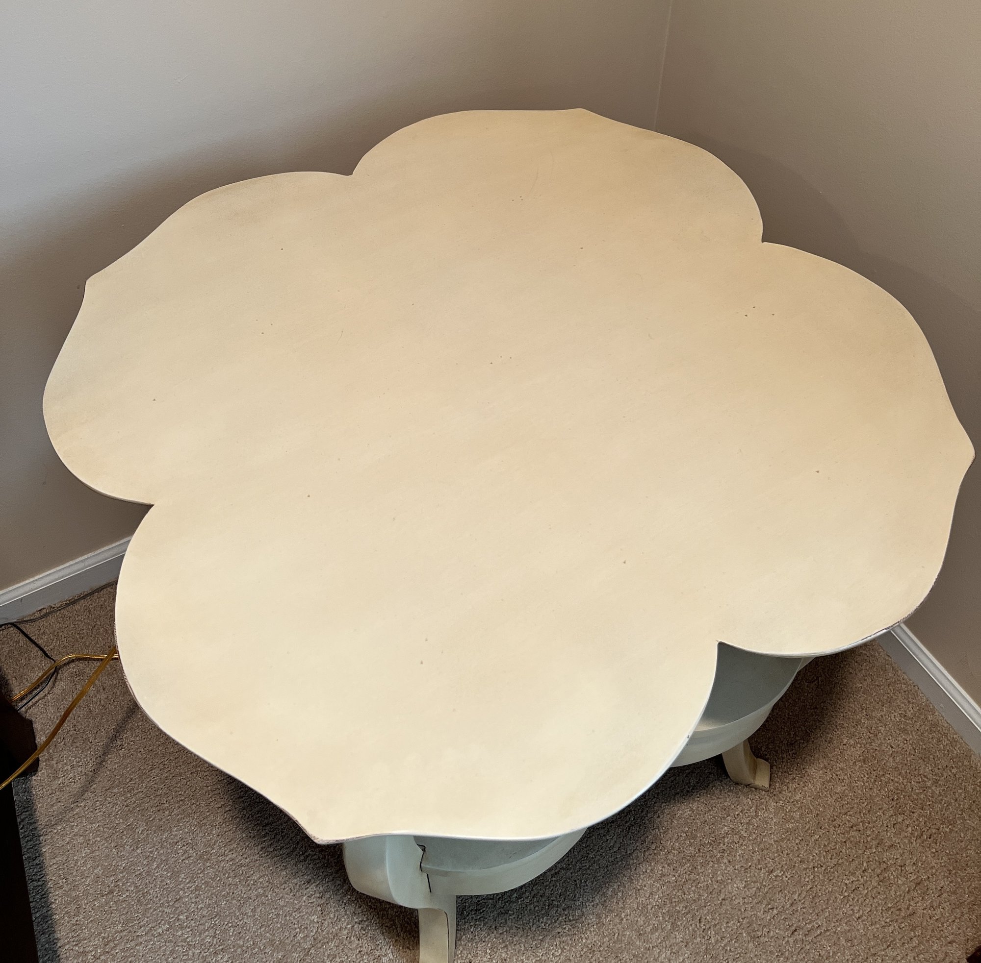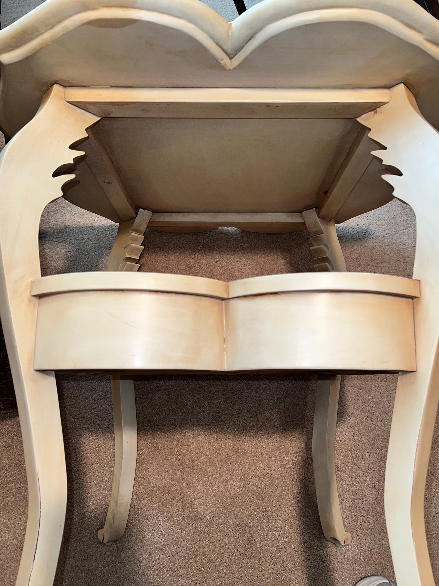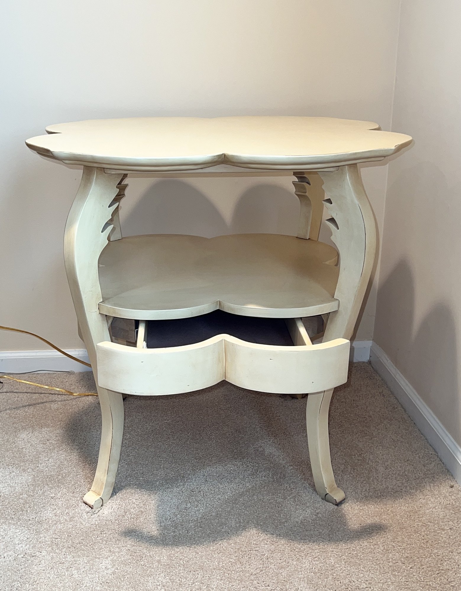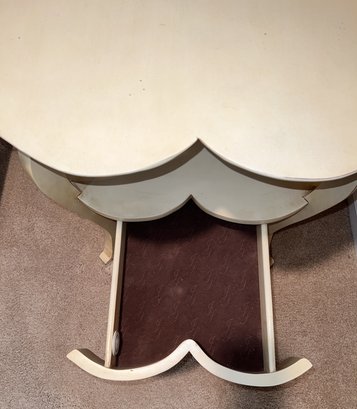 Jacyln Smith Table With Drawer with scalloped top and cabriole legs. Ivory color