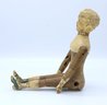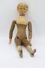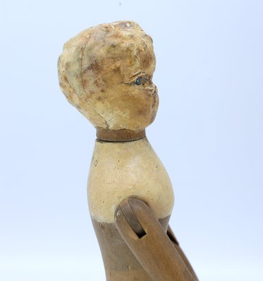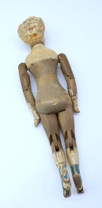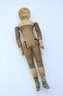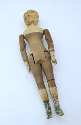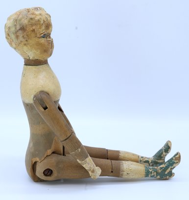 Joel Ellis (1872-1873) Vermont early antique wooden jointed doll. Hand painted blue eyes, wear to paint, green painted boots . Body by hip has a small chuck of wood missing.- see photo. Otherwise nice.