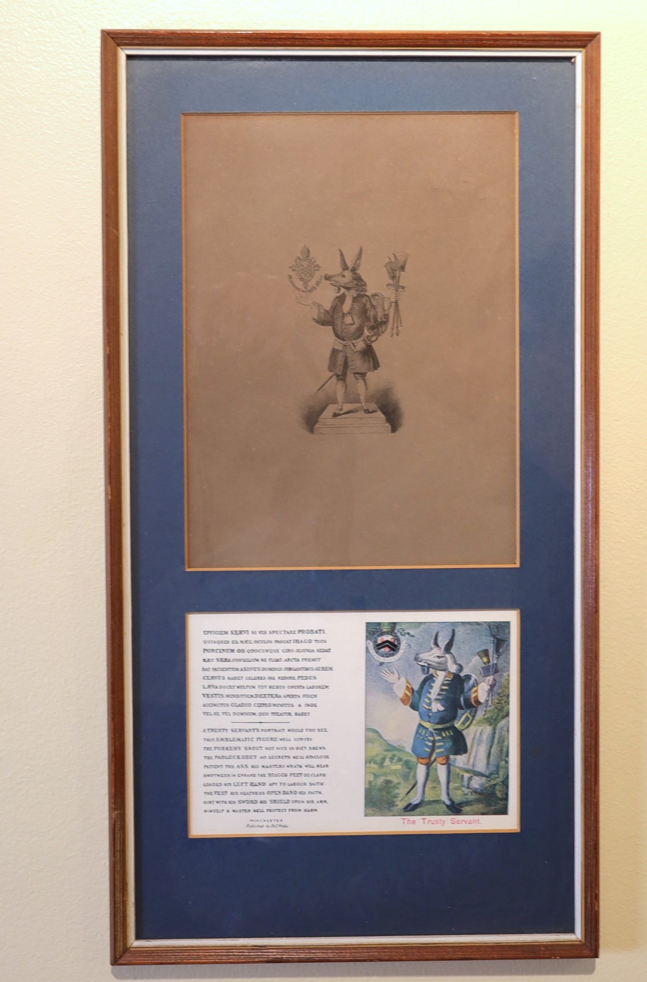 Hoskins is recognized for his painting of The Trusty Servant emblem outside the Winchester College kitchen in 1579. The emblem was accompanied by a verse in both Latin and English that provided an interpretation of the image. The framed size of the painting is 8" x 14.5", and it is currently part of a private collection in NYC.