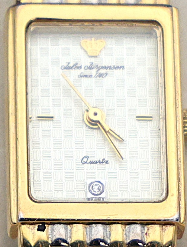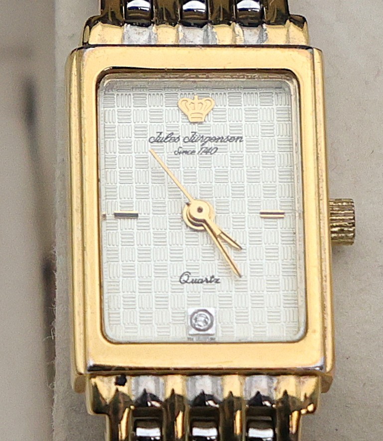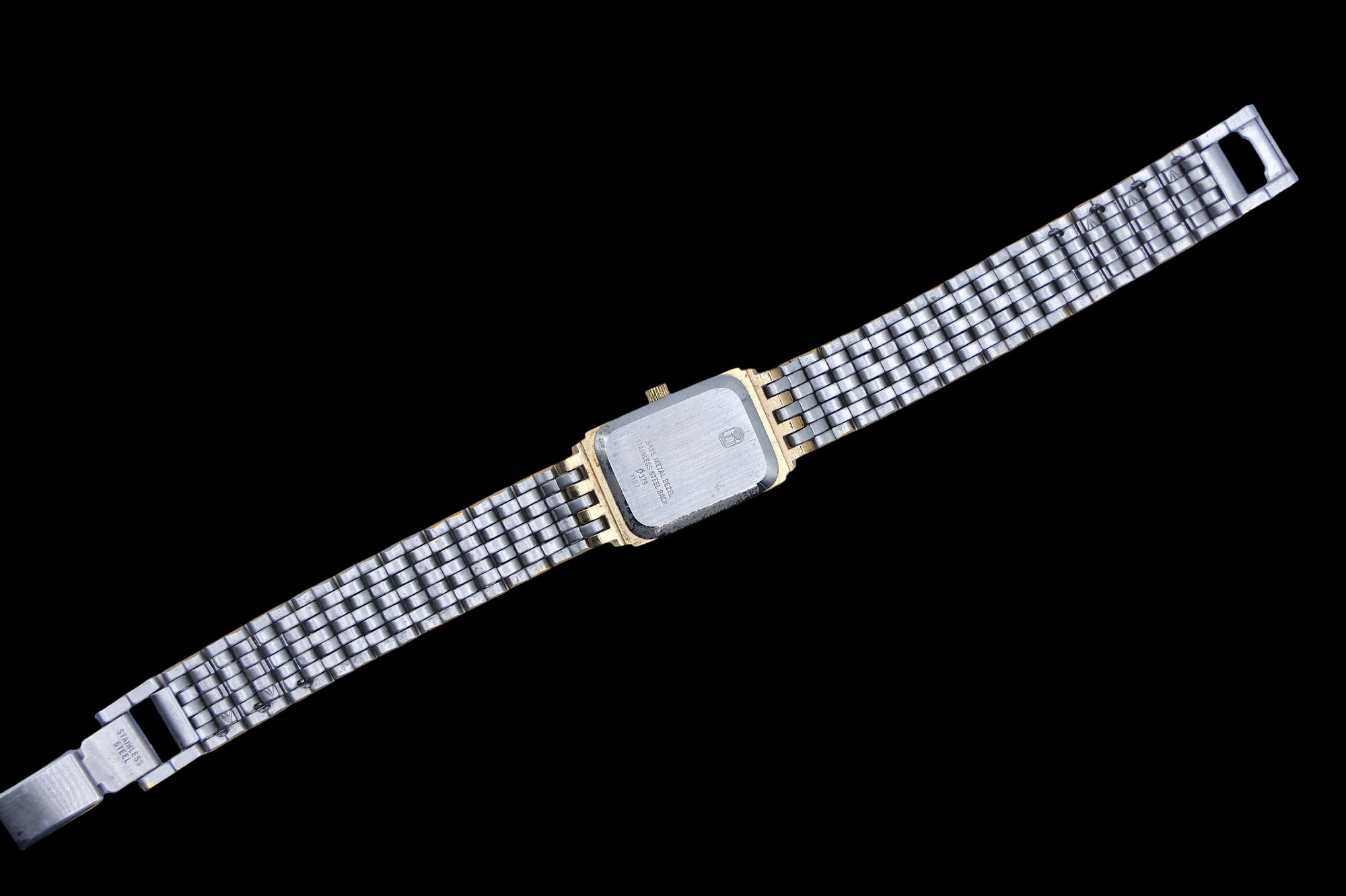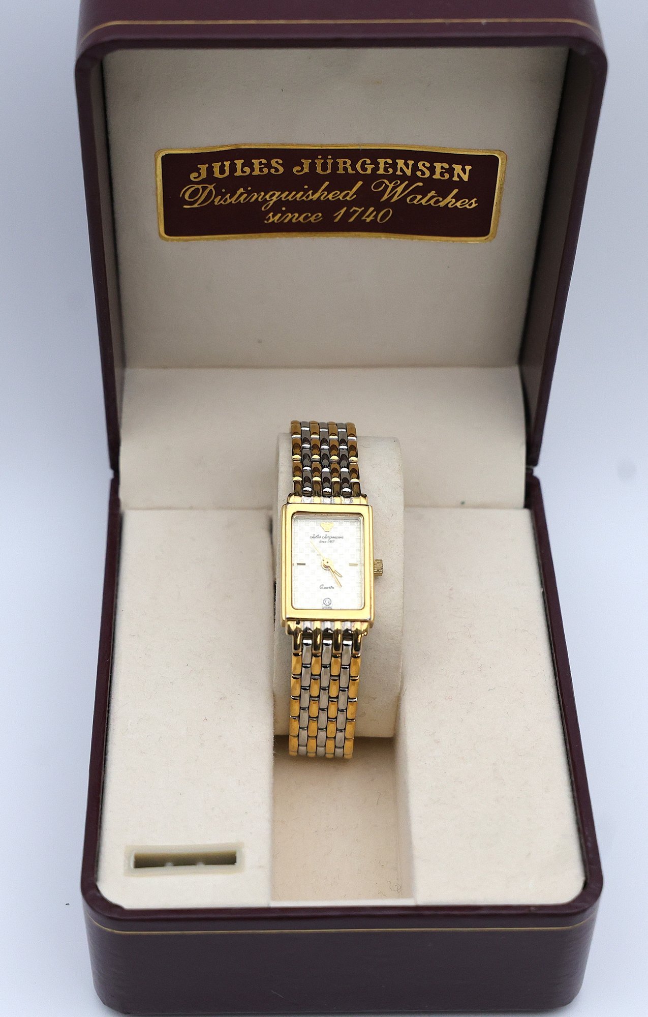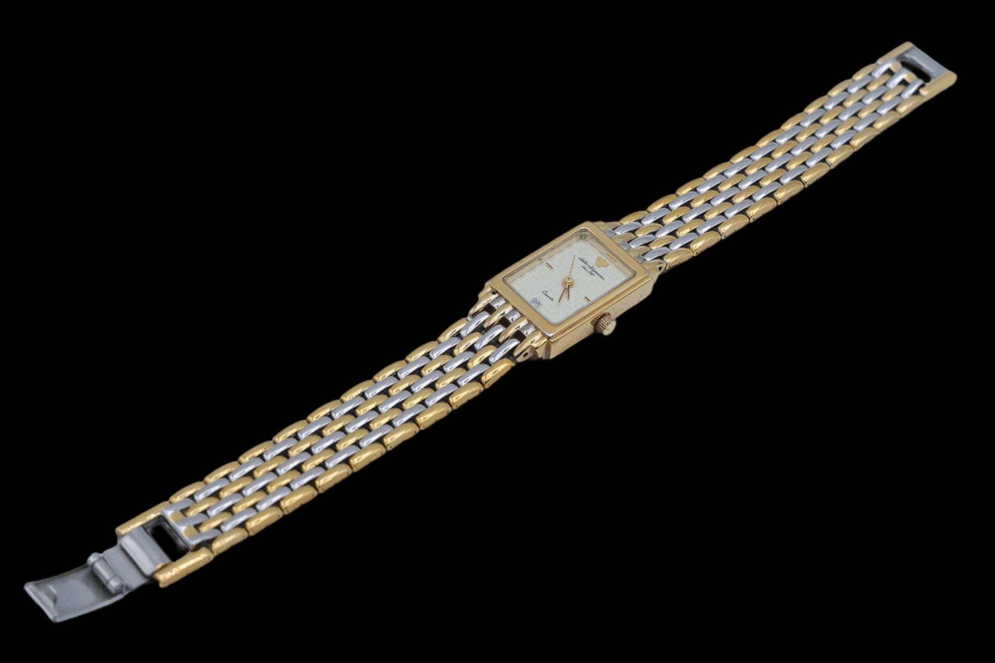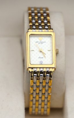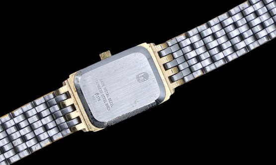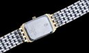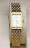 Two tones band with original box #753 quartz featuring a rectangular case and a two tone stainless steel bracelet.