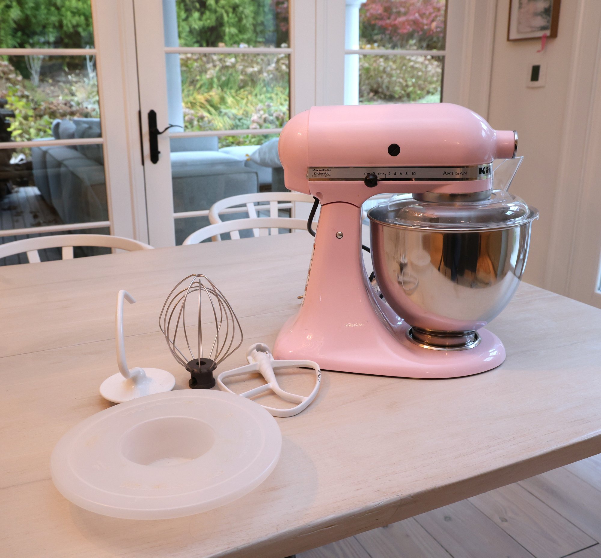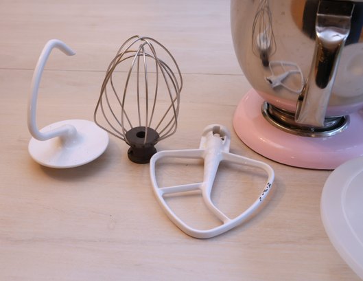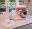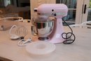 Kitchen Aid, tilt head stand mixer in pink. Comes with bowl, mixers and whisk