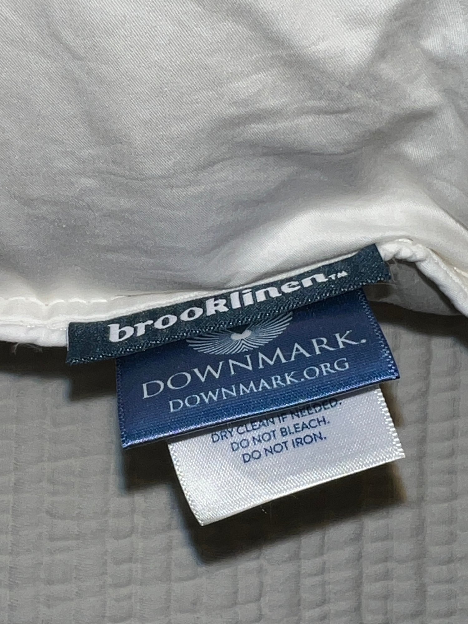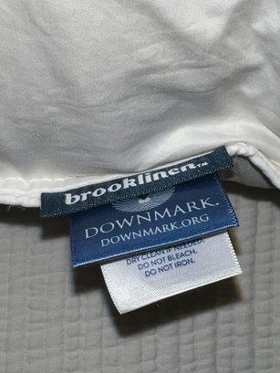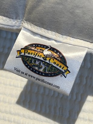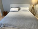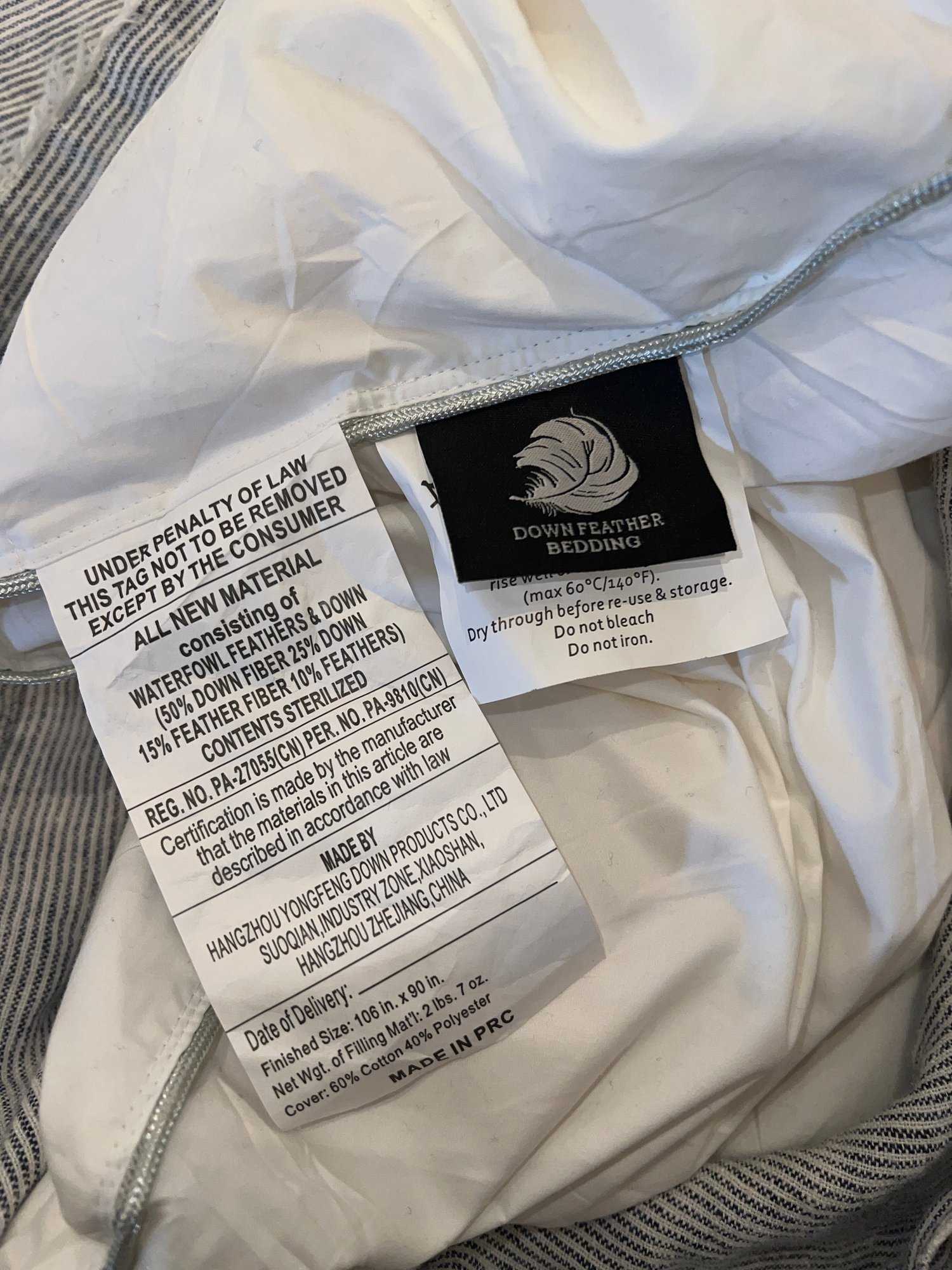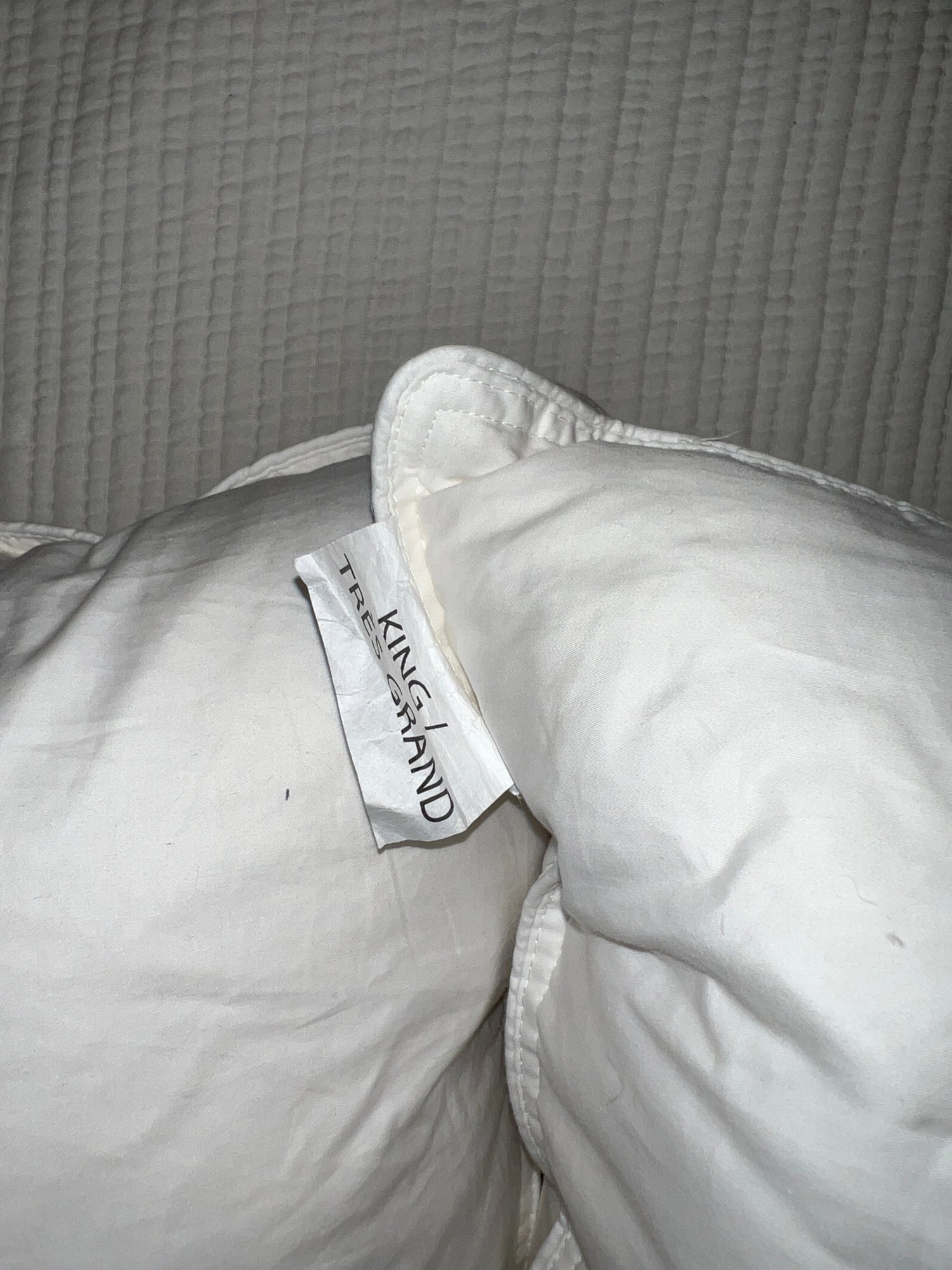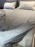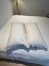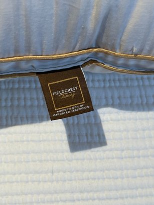 King Oeko-Tex standard 100 down feather comforter and duvet in denim blue. Three King goose down pillows, one king pillow by Fieldcrest Luxury.