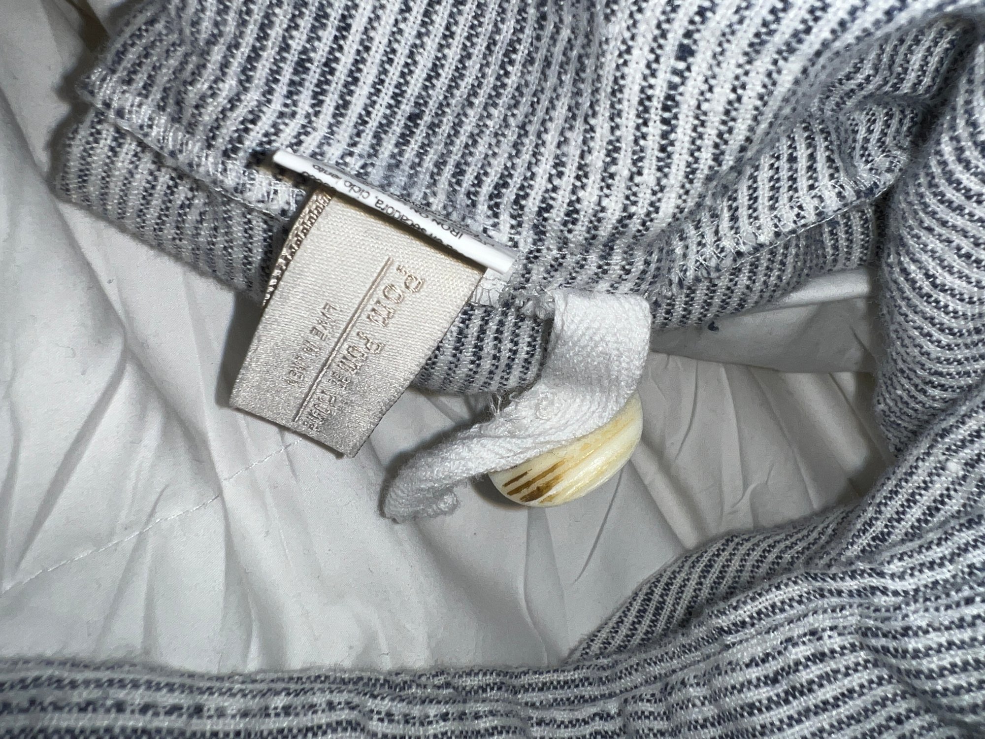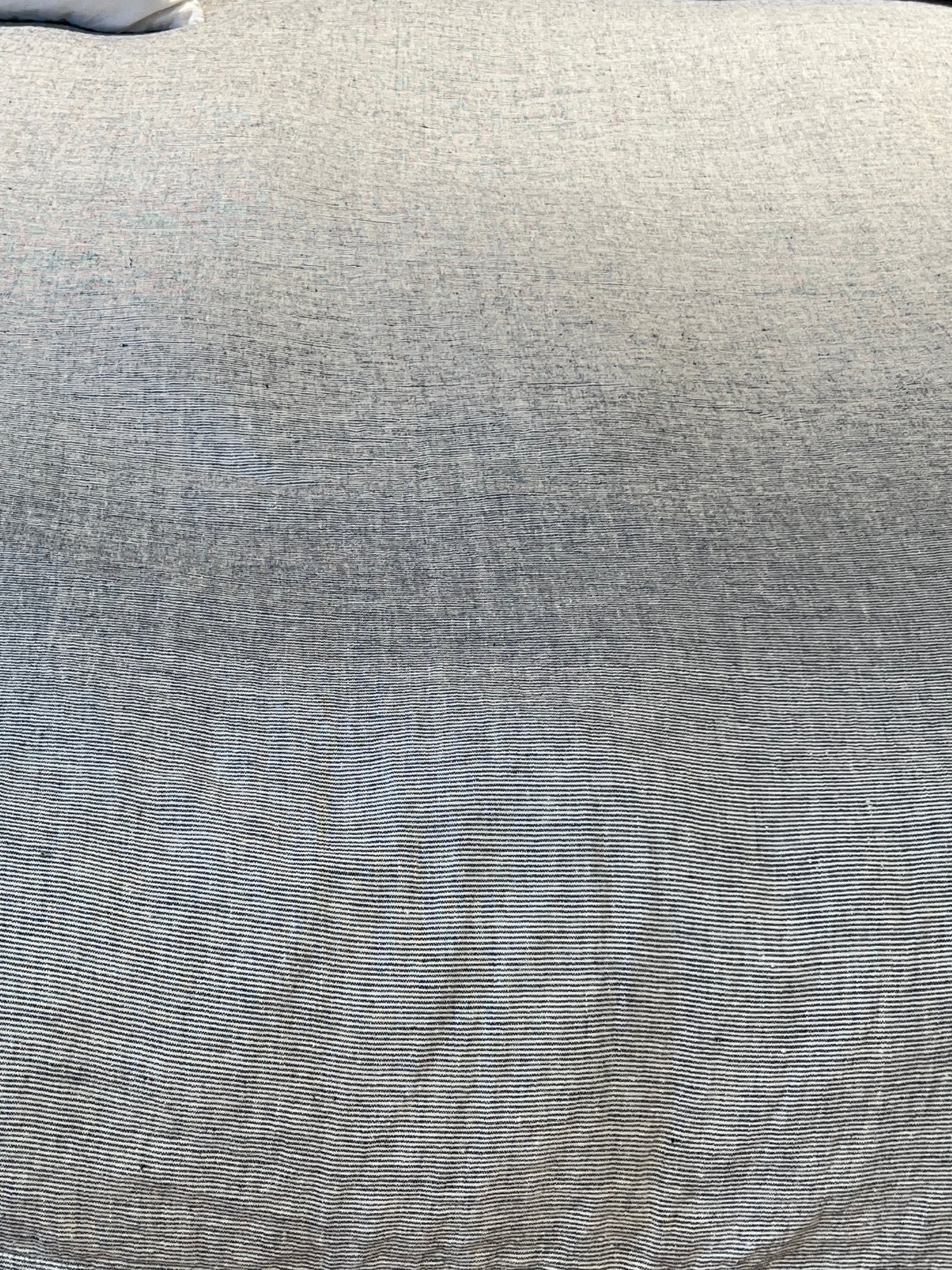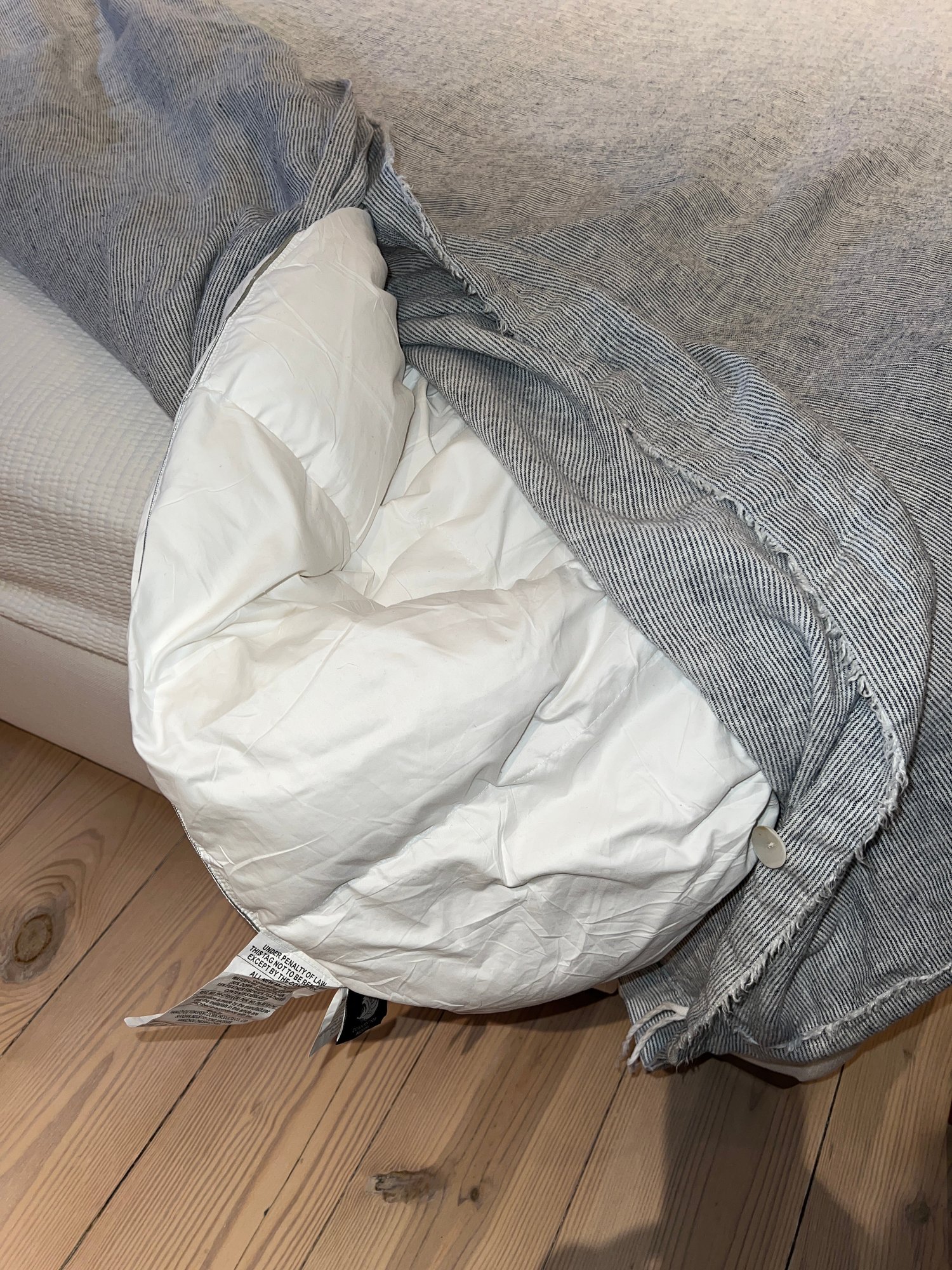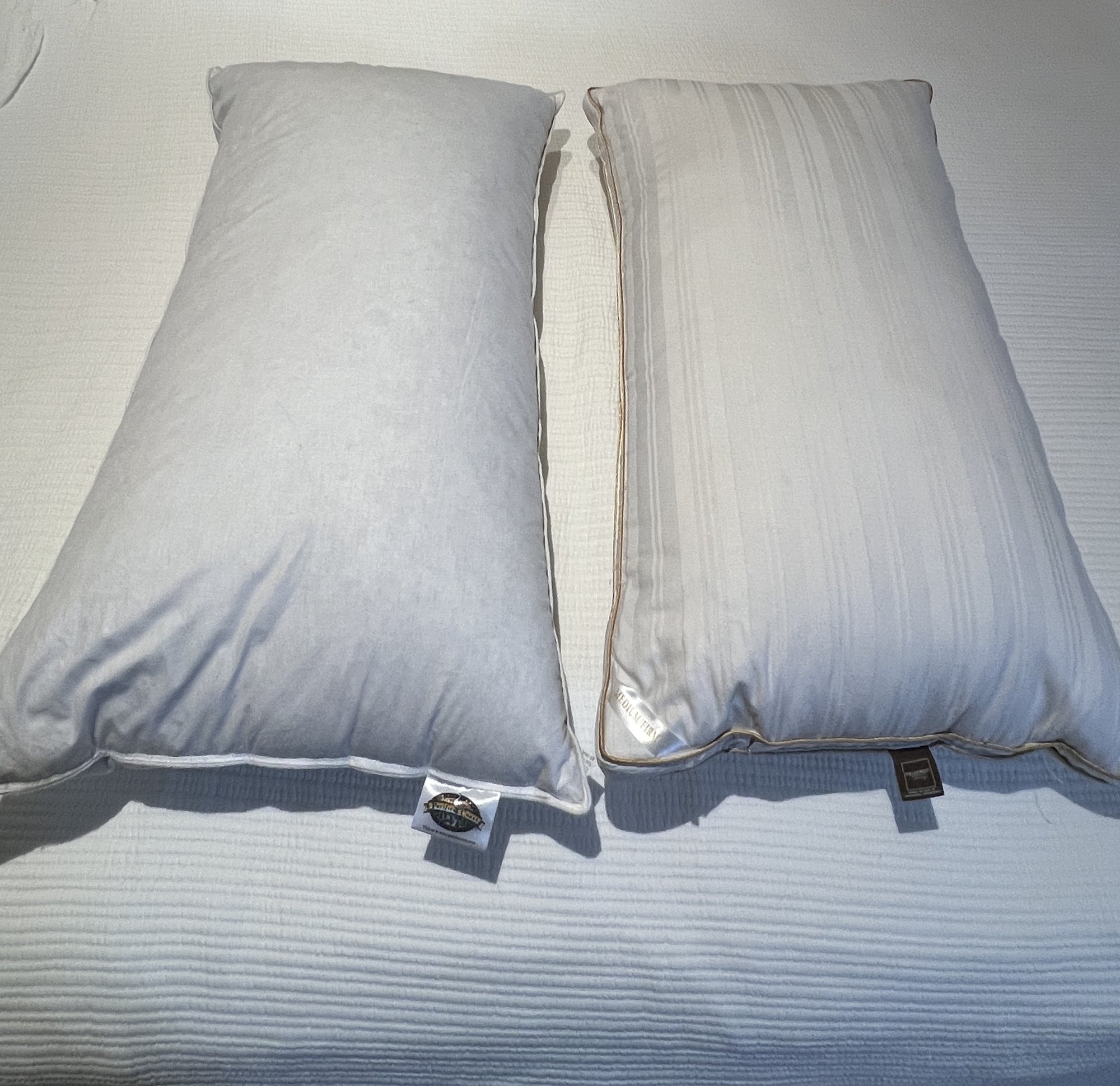 King Oeko-Tex standard 100 down feather comforter and duvet in denim blue. Three King goose down pillows, one king pillow by Fieldcrest Luxury.