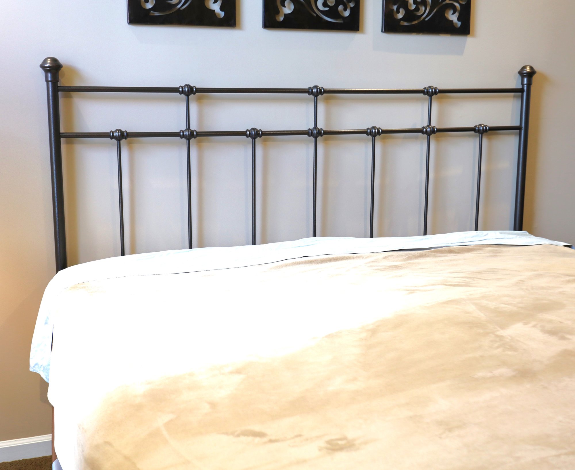 King metal headboard with frame includes sheet set, 2 king pillows and a lightweight blanket. Serta Perfect sleeper Allura mattress and boxspring included. This was a guest bedroom.