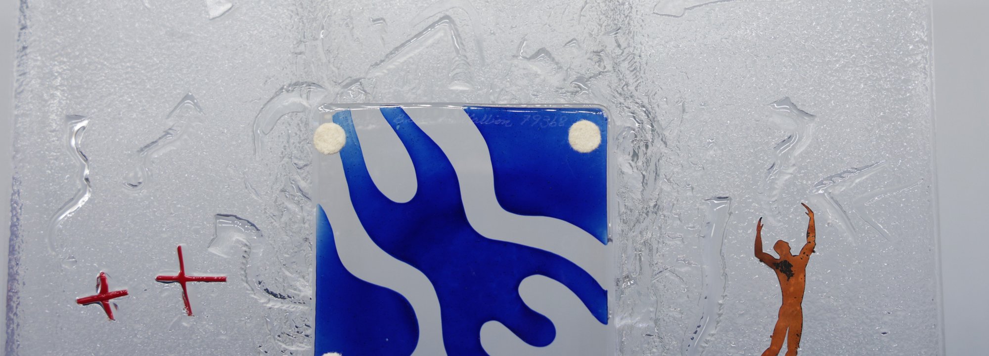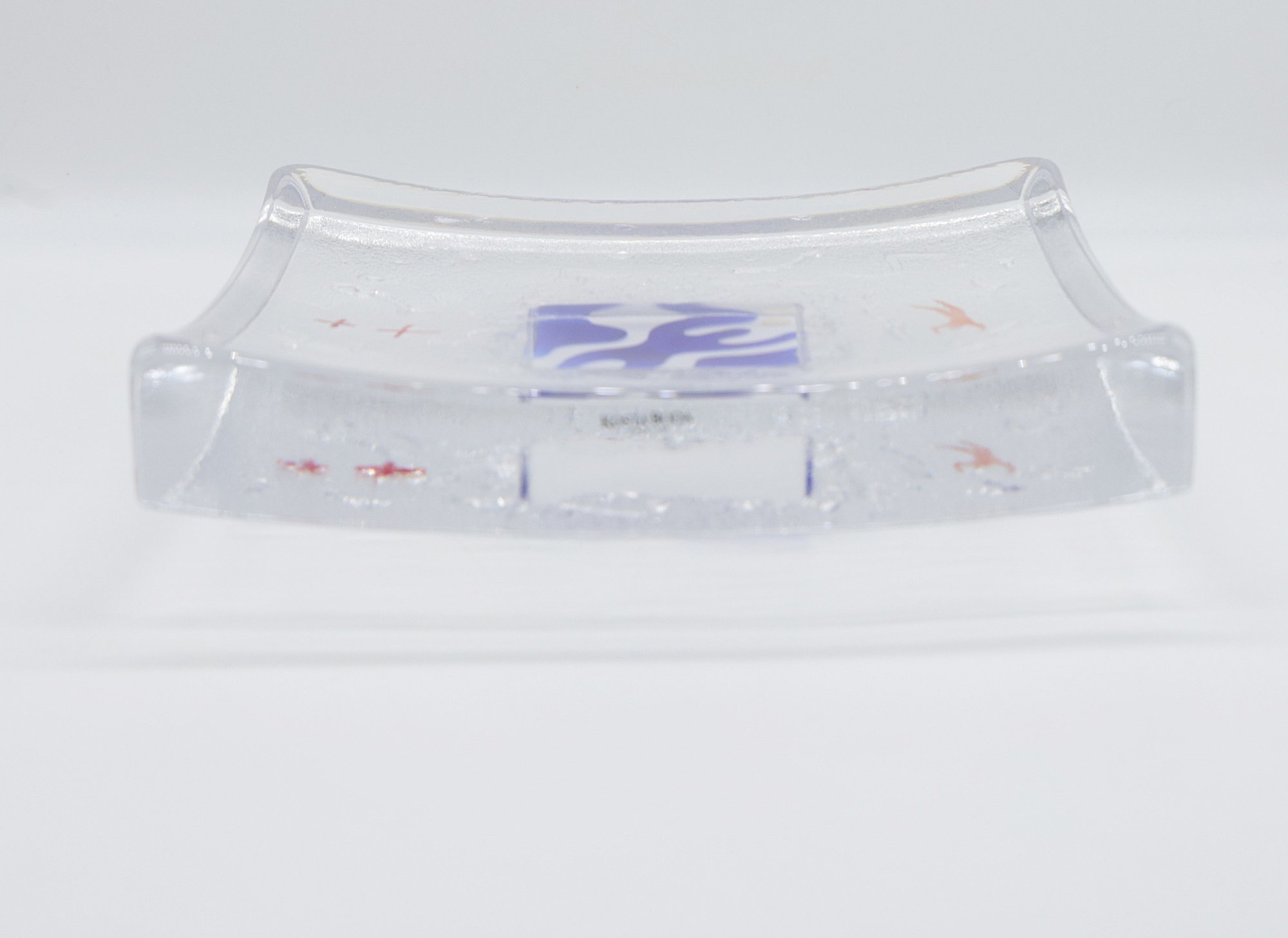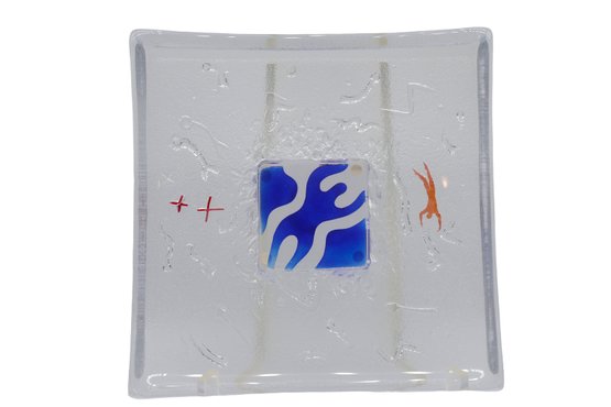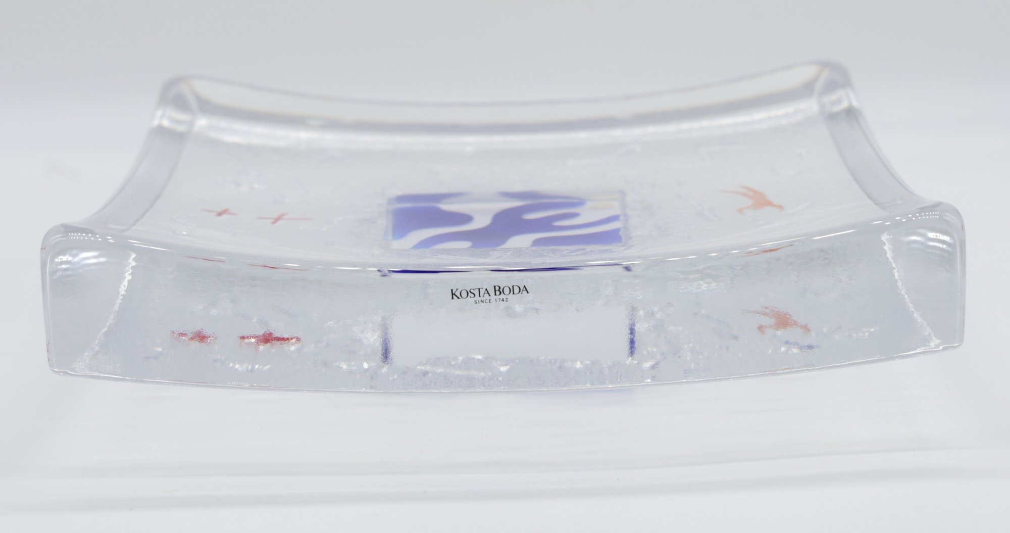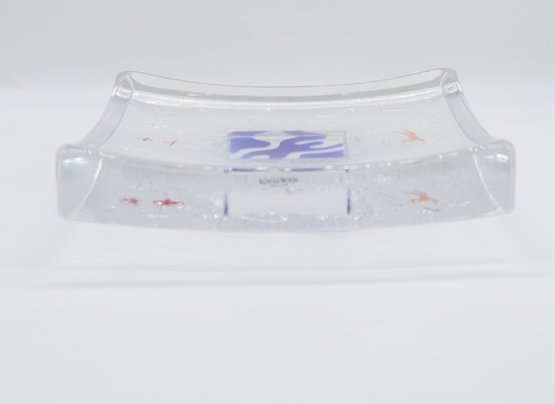 Kosta Boda By Bertil Vallien "Domino Swimmer" Dish is in nice condition and comes with a lucite stand. The dish is signed on the base.