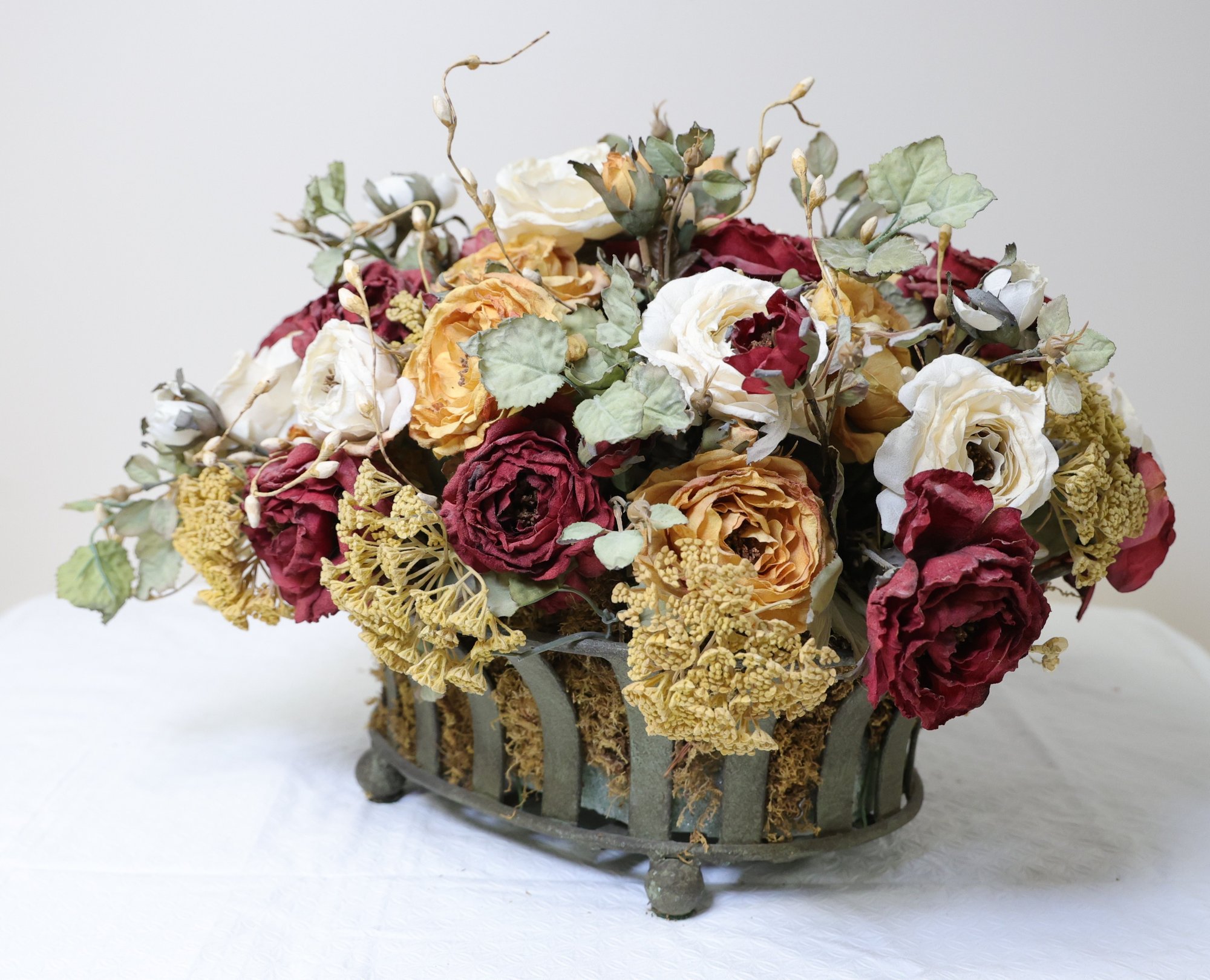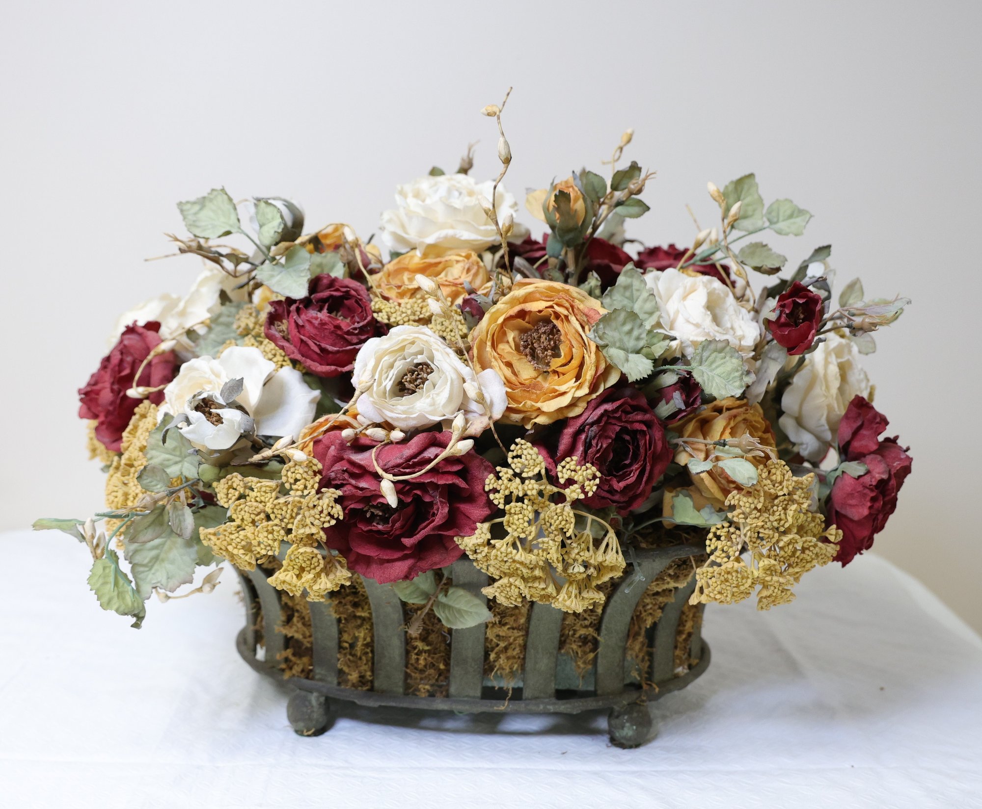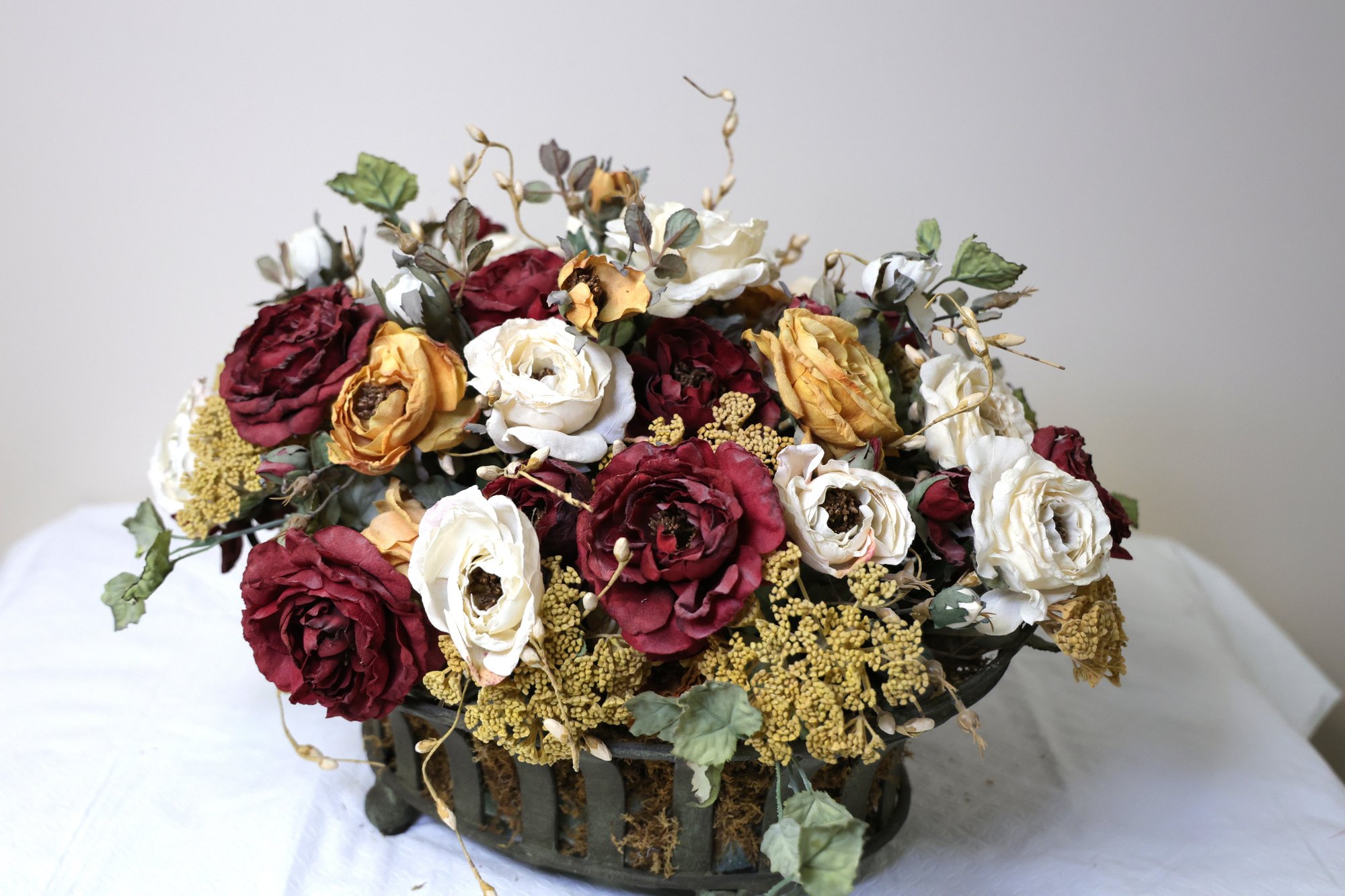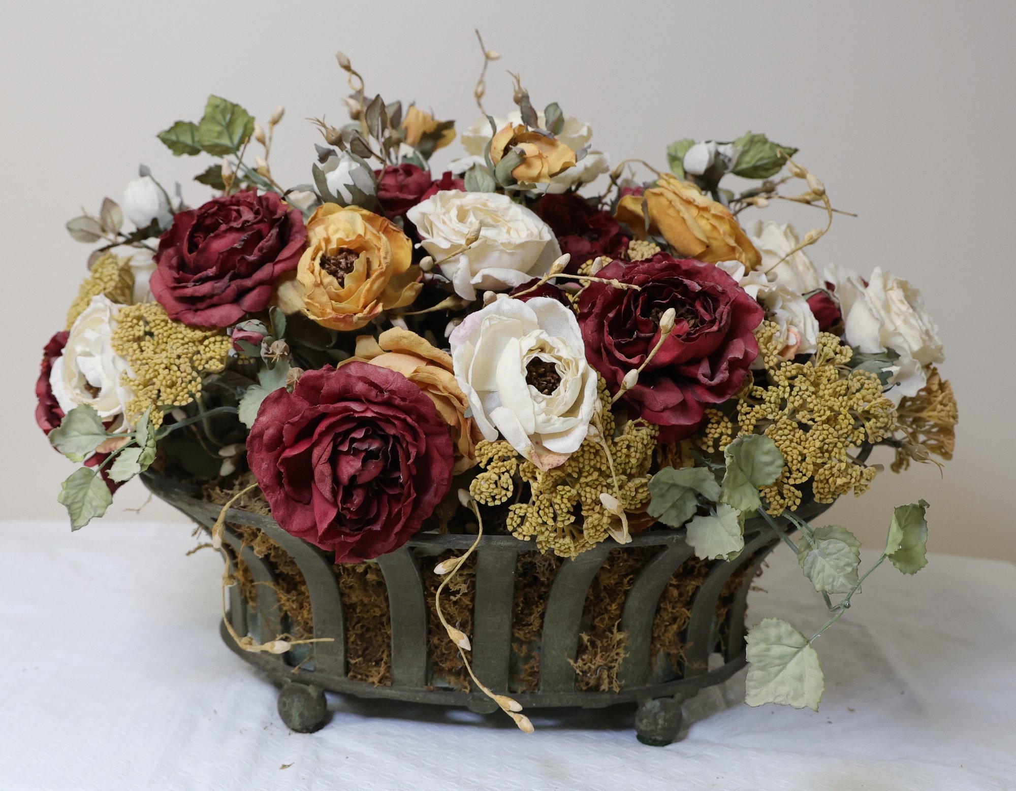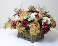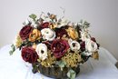 A large silk flower centerpiece featuring a rich arrangement of artificial burgundy and cream colored blooms.