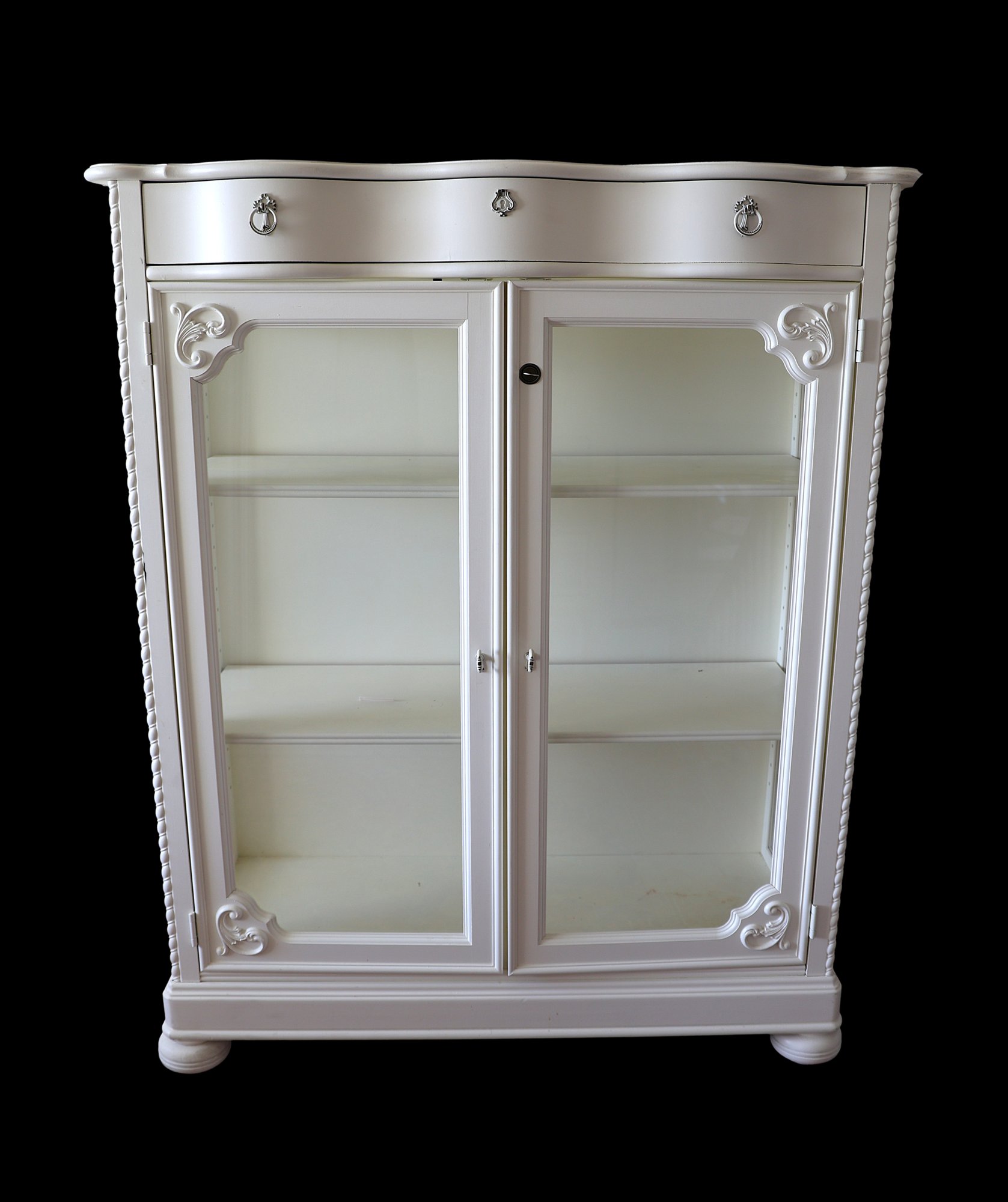 Two glass doors with key, 1 drawer with 4 dividers, drop bail pulls with rosettes, serpentine fronts, waterfall drawer, and bun feet. Nice !!!!
