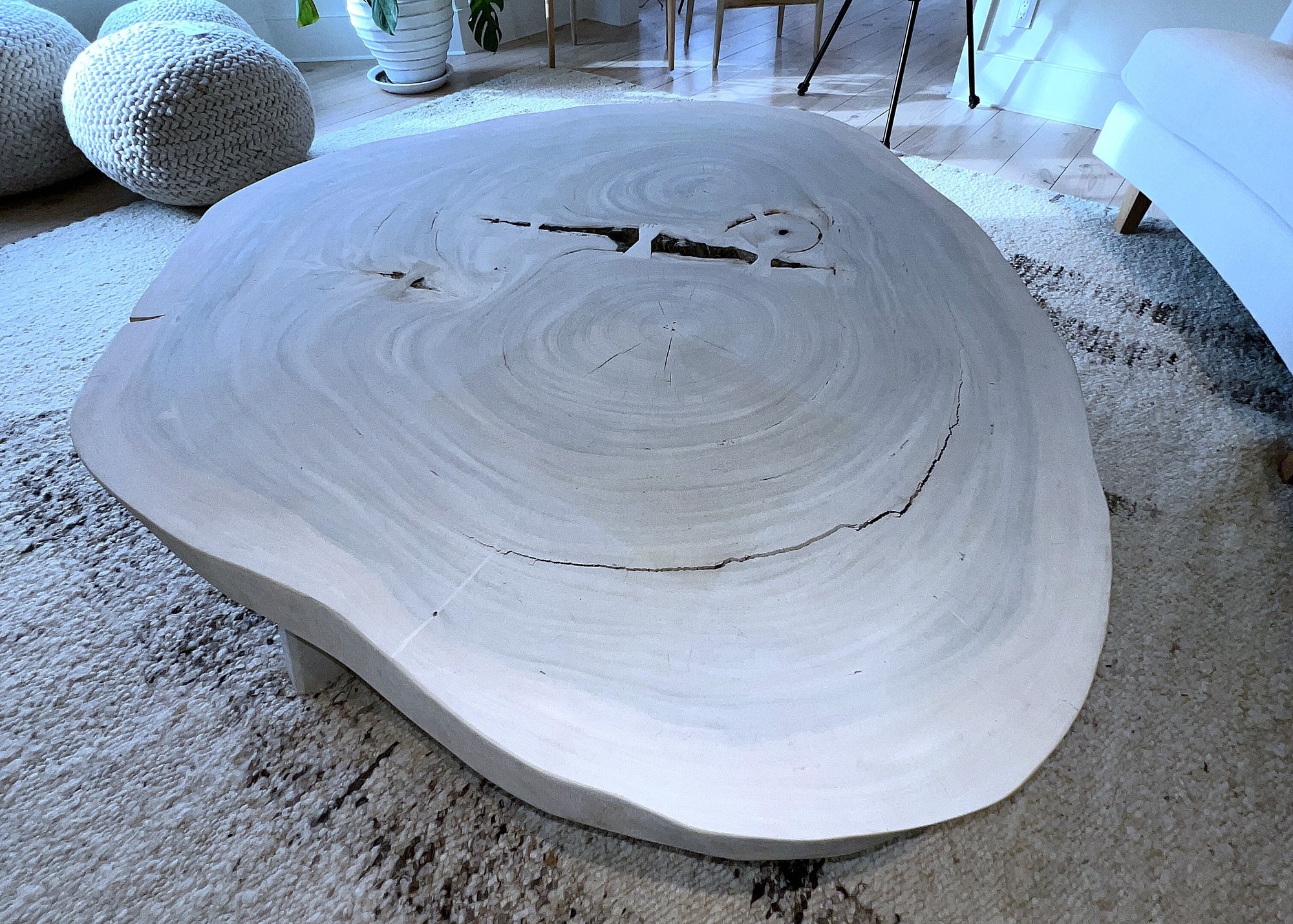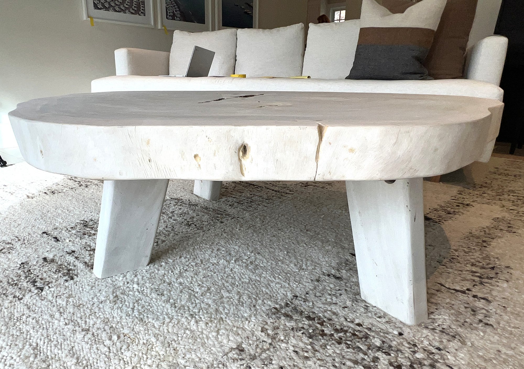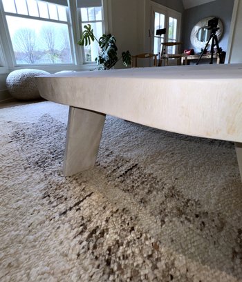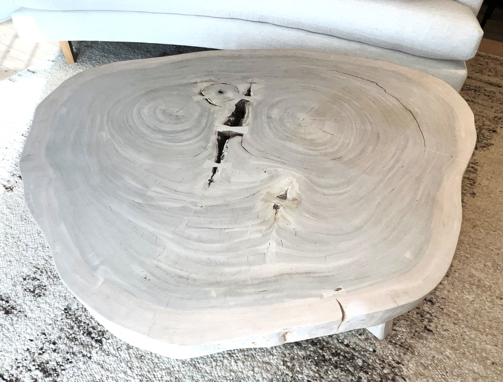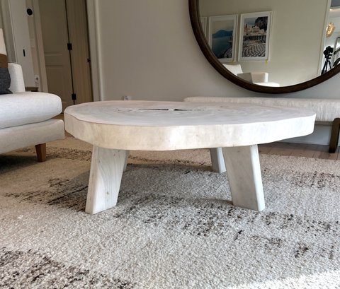 Live Edge Wood Slab Coffee Table with three legs, white-washed top. Very heavy—ask about our movers. Measures 51" x 54" x 18" H.