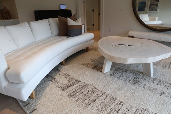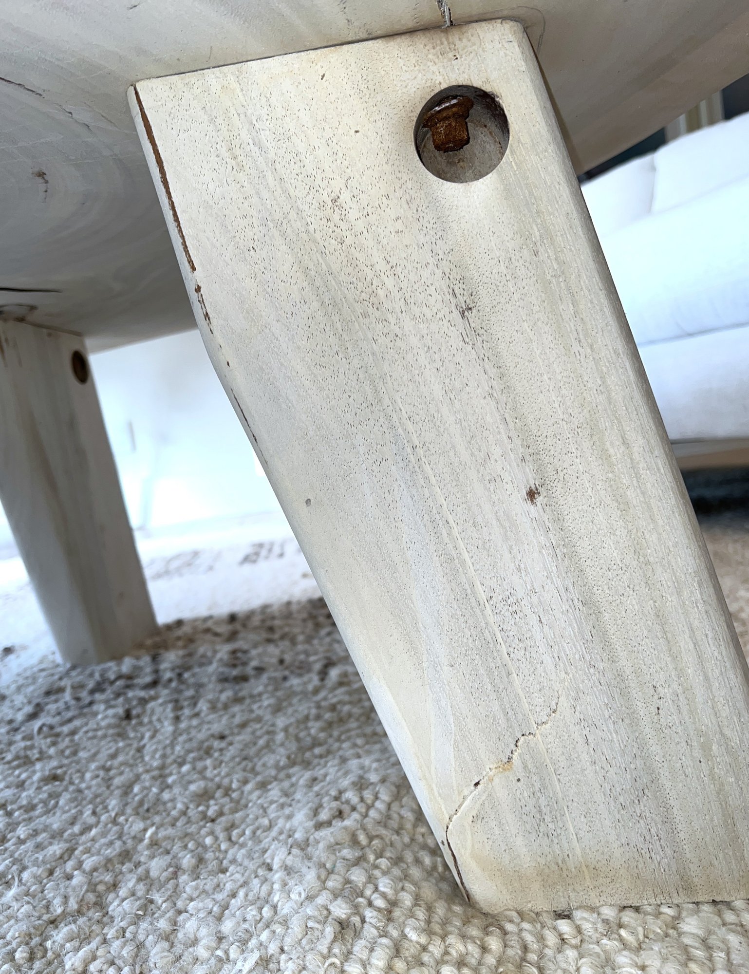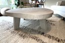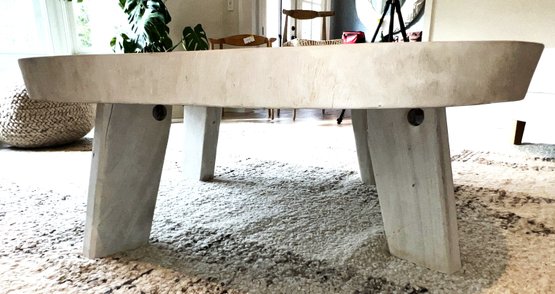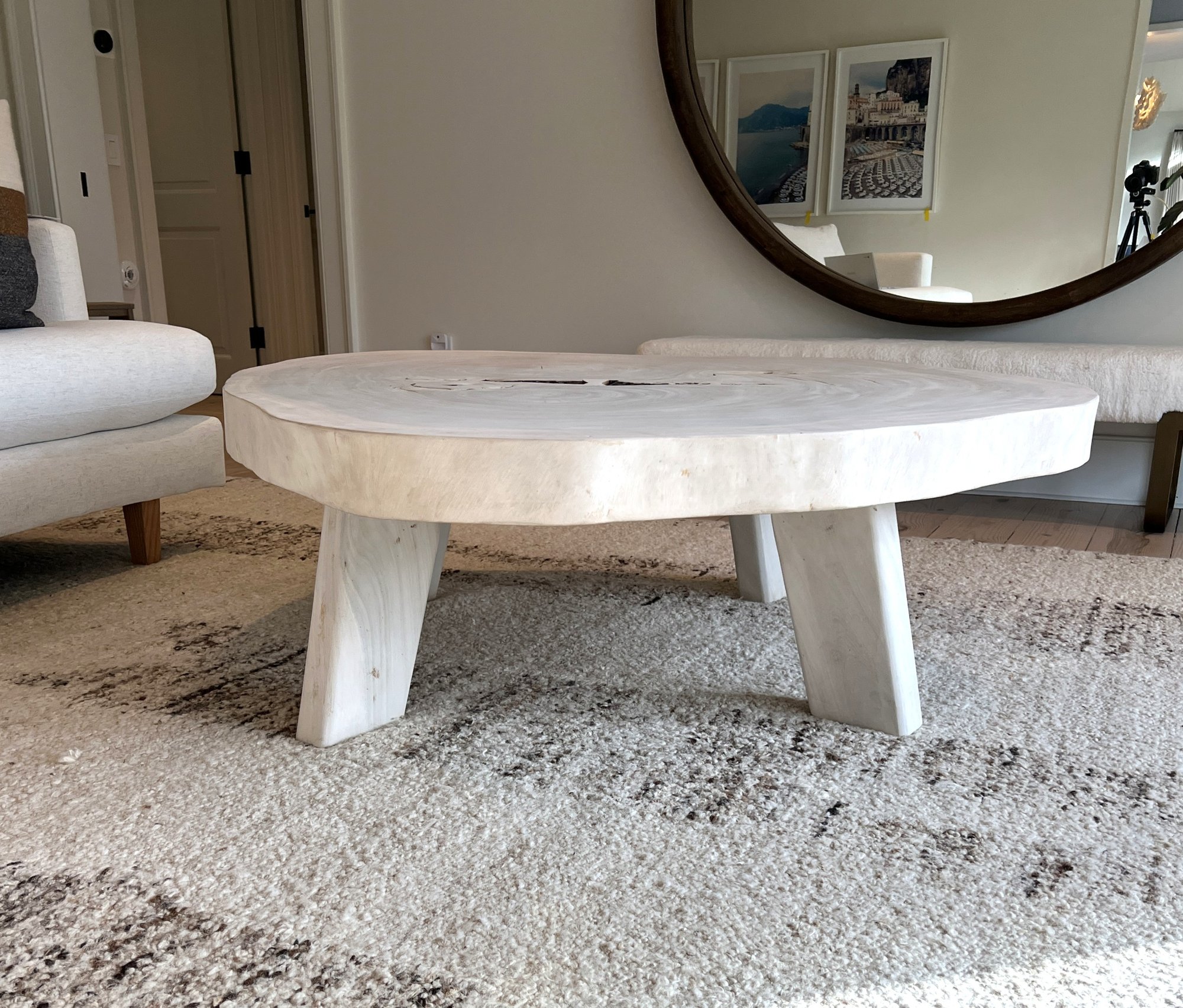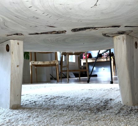 Live Edge Wood Slab Coffee Table with three legs, white-washed top. Very heavy—ask about our movers. Measures 51" x 54" x 18" H.