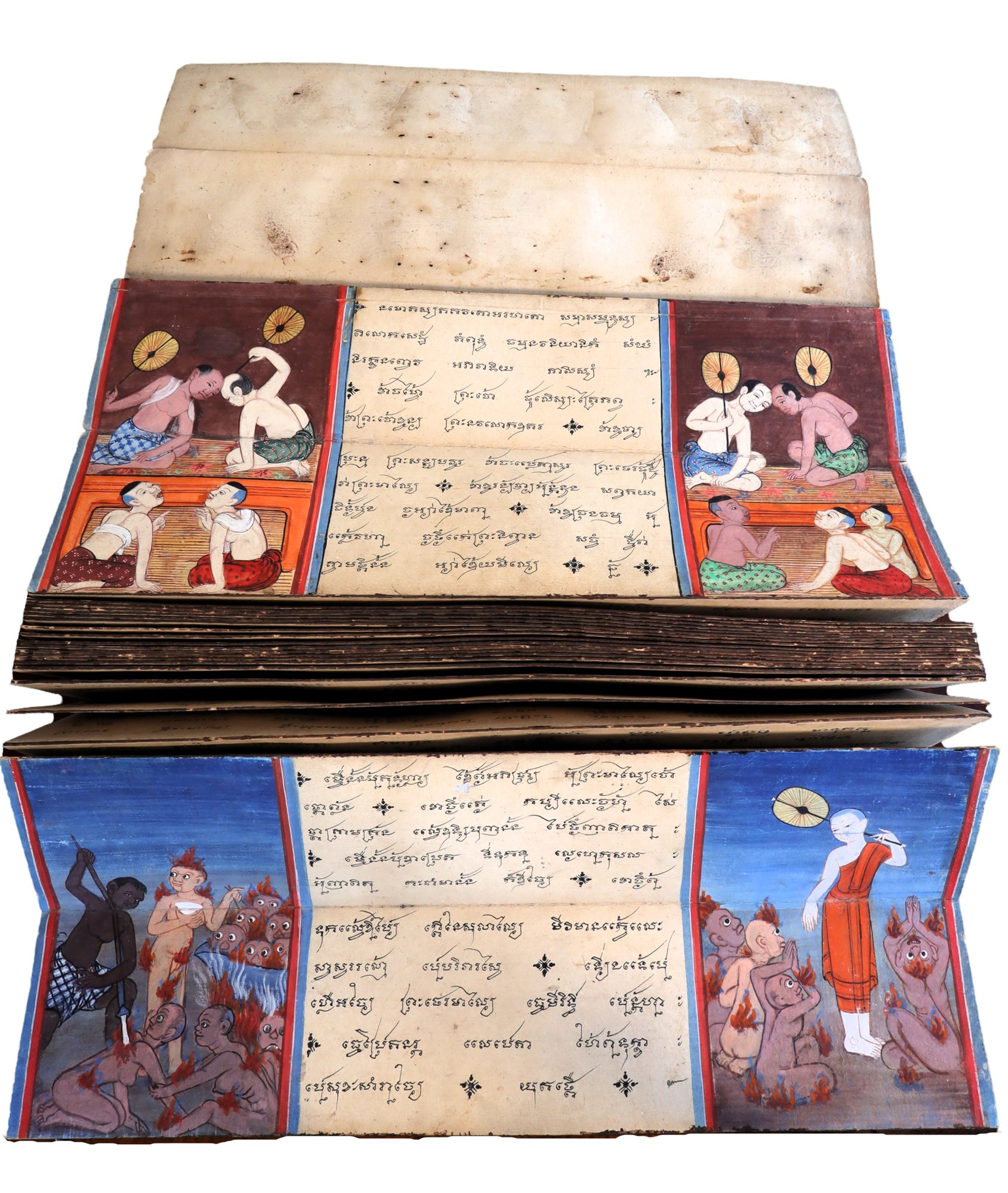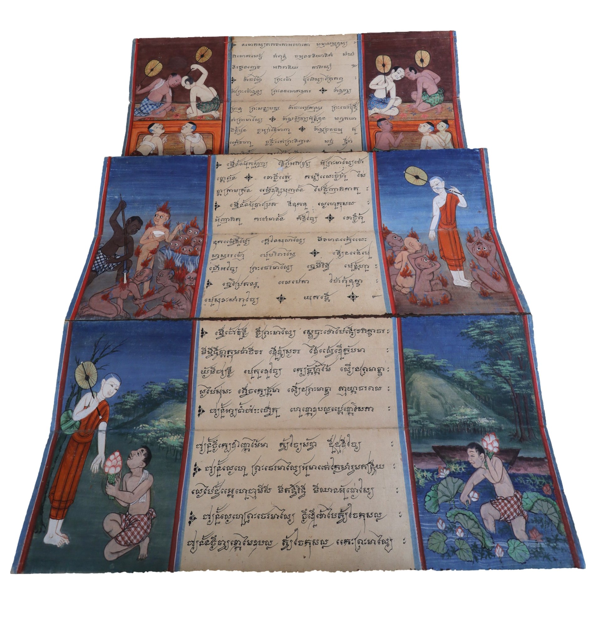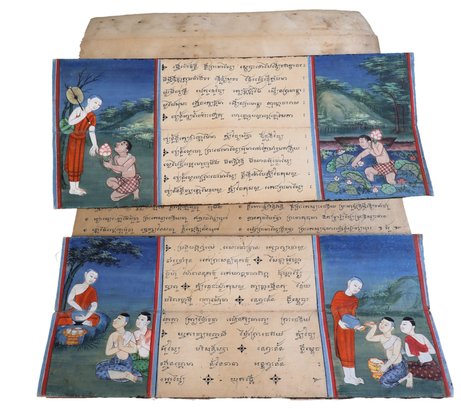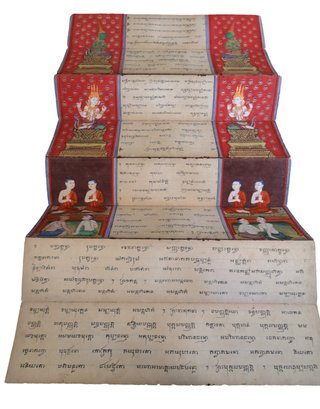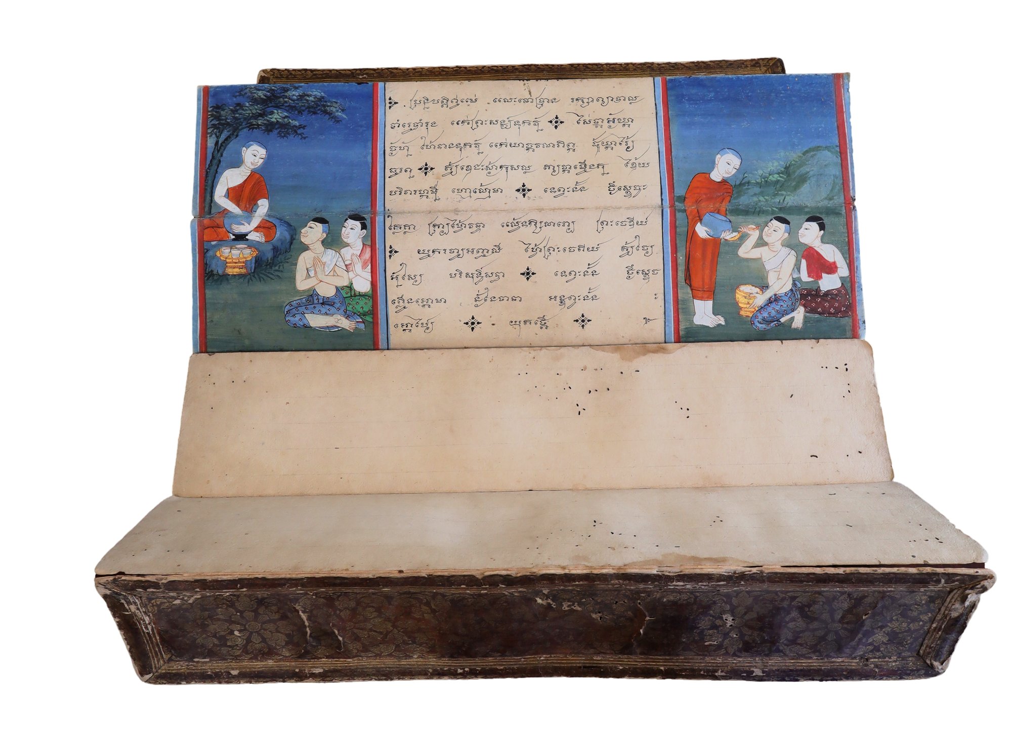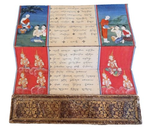 This is an antique manuscript, a Buddhist book which contains illustrated paintings. The manuscript is a compilation of Buddhist texts written in Pali and Thai languages, using Khmer (Cambodian) script. The manuscript was created in the 19th century and executed using watercolor, gilt, and ink. The dimensions of the manuscript measure 26.5 inches in length and 5.75 inches in width.