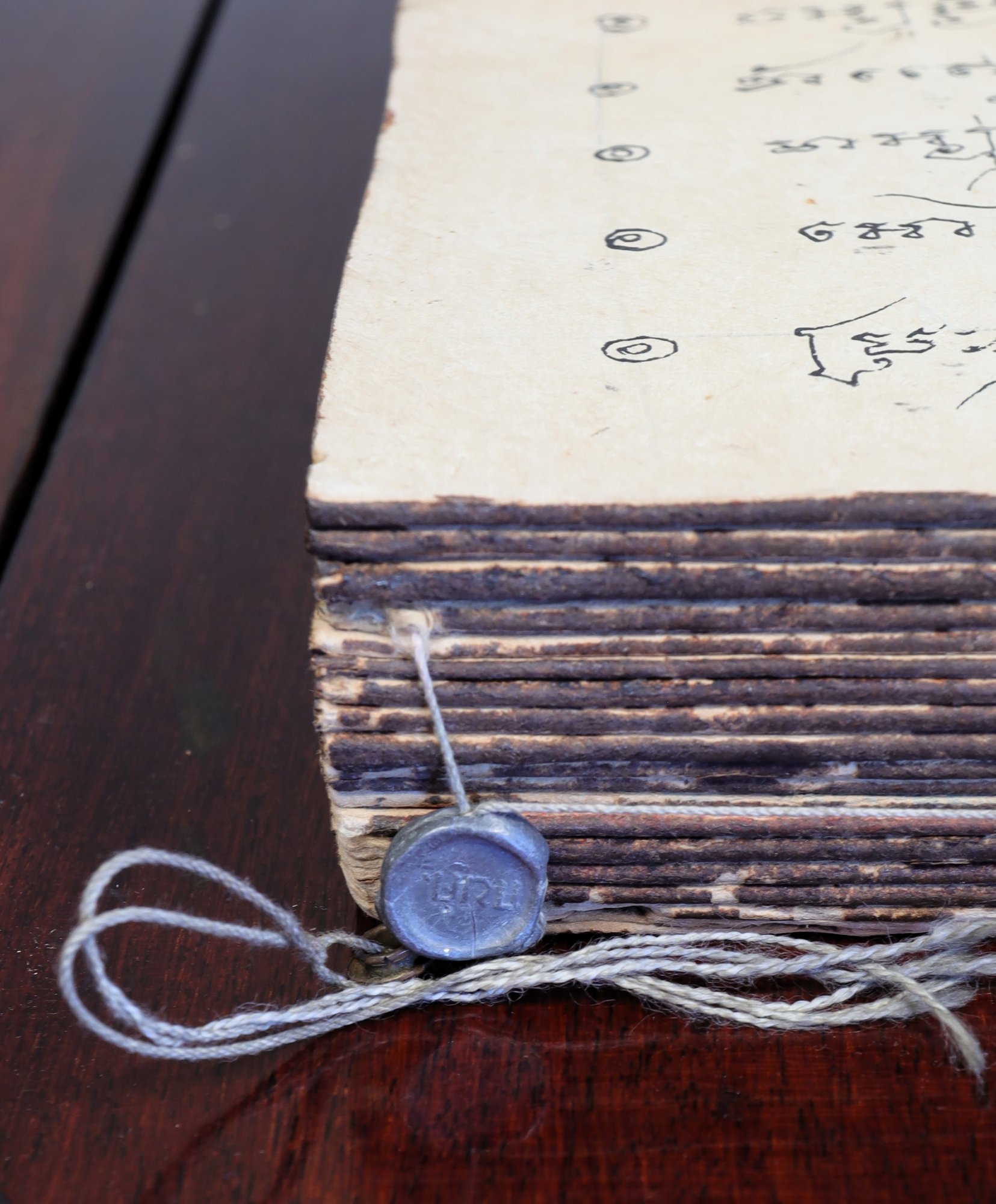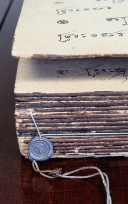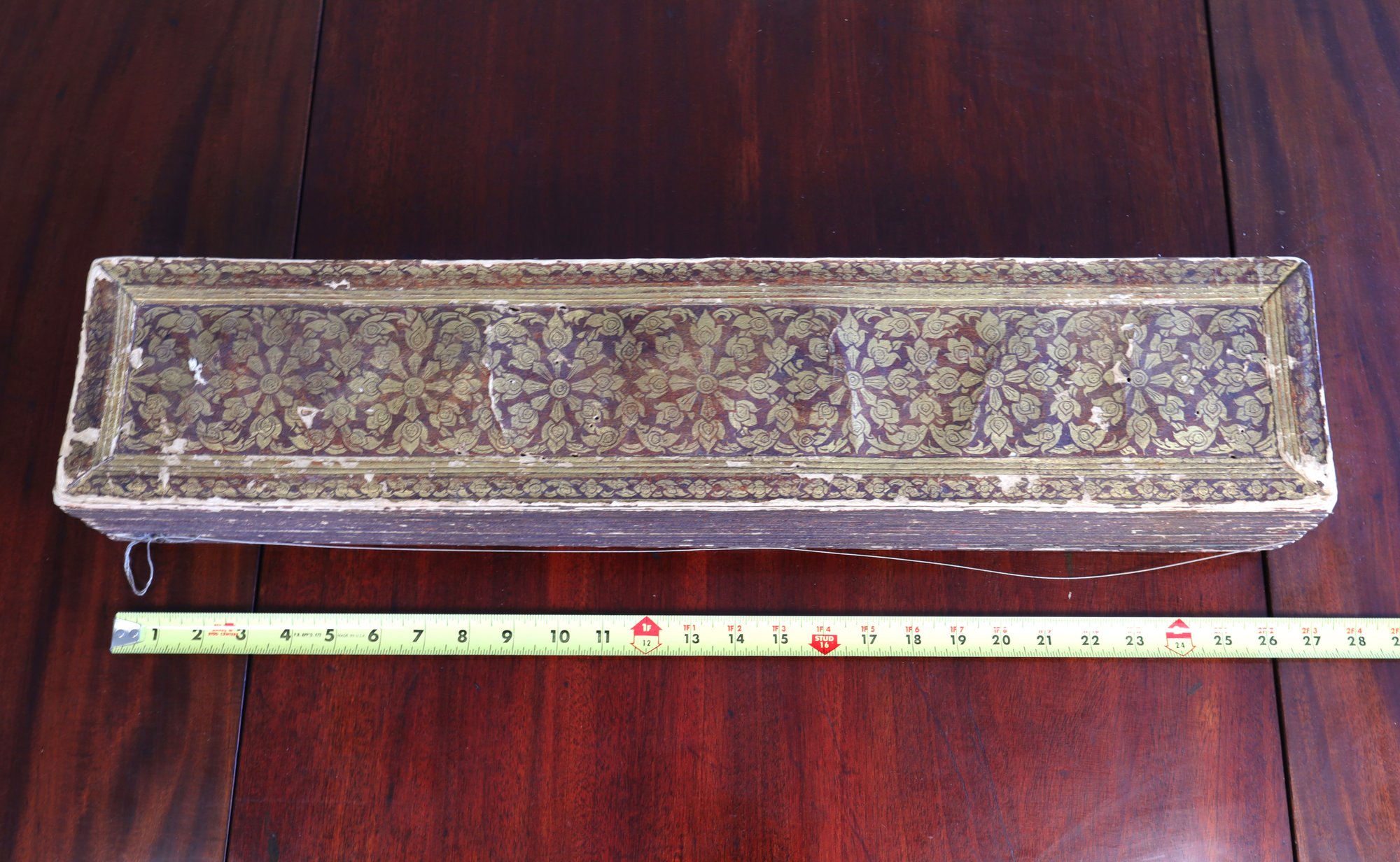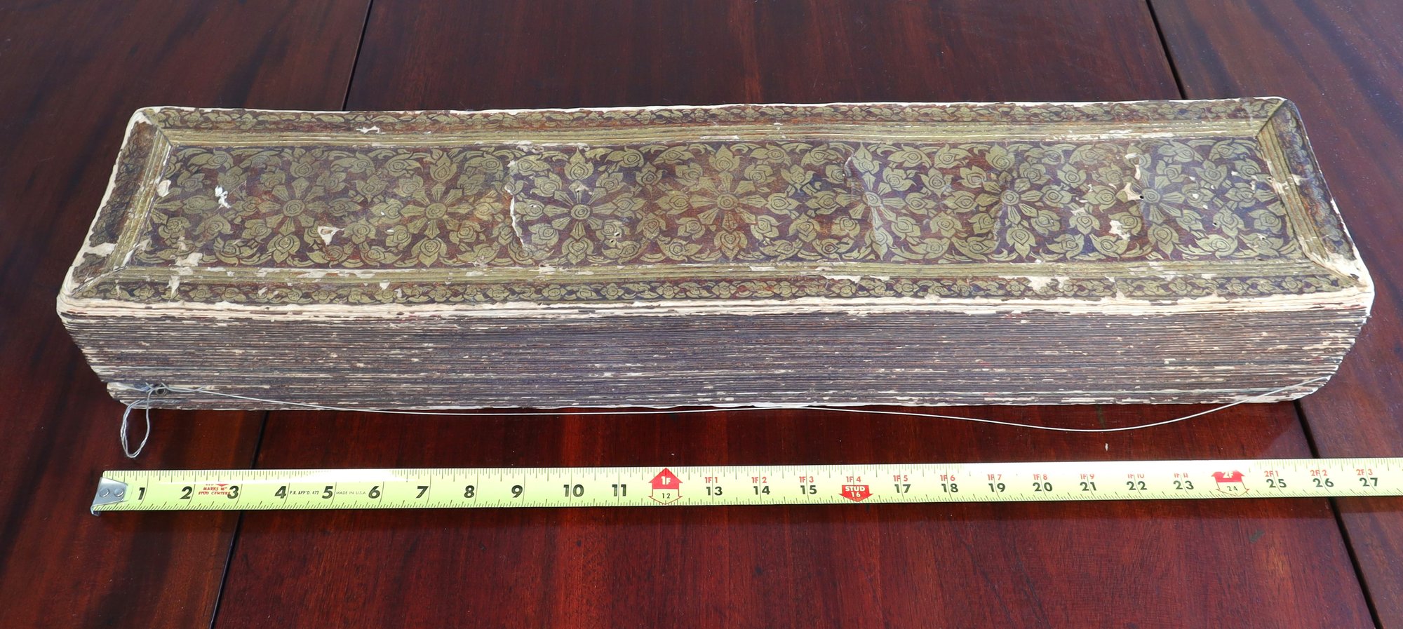 This is an antique manuscript, a Buddhist book which contains illustrated paintings. The manuscript is a compilation of Buddhist texts written in Pali and Thai languages, using Khmer (Cambodian) script. The manuscript was created in the 19th century and executed using watercolor, gilt, and ink. The dimensions of the manuscript measure 26.5 inches in length and 5.75 inches in width.