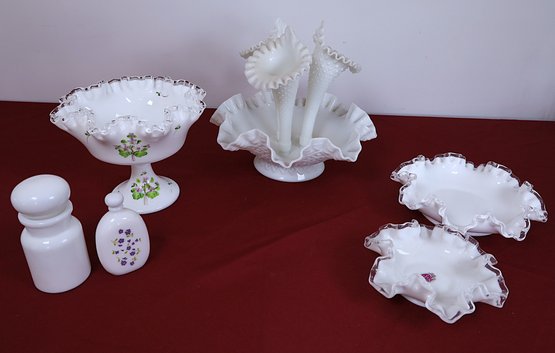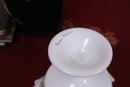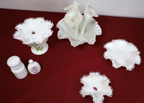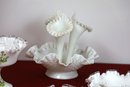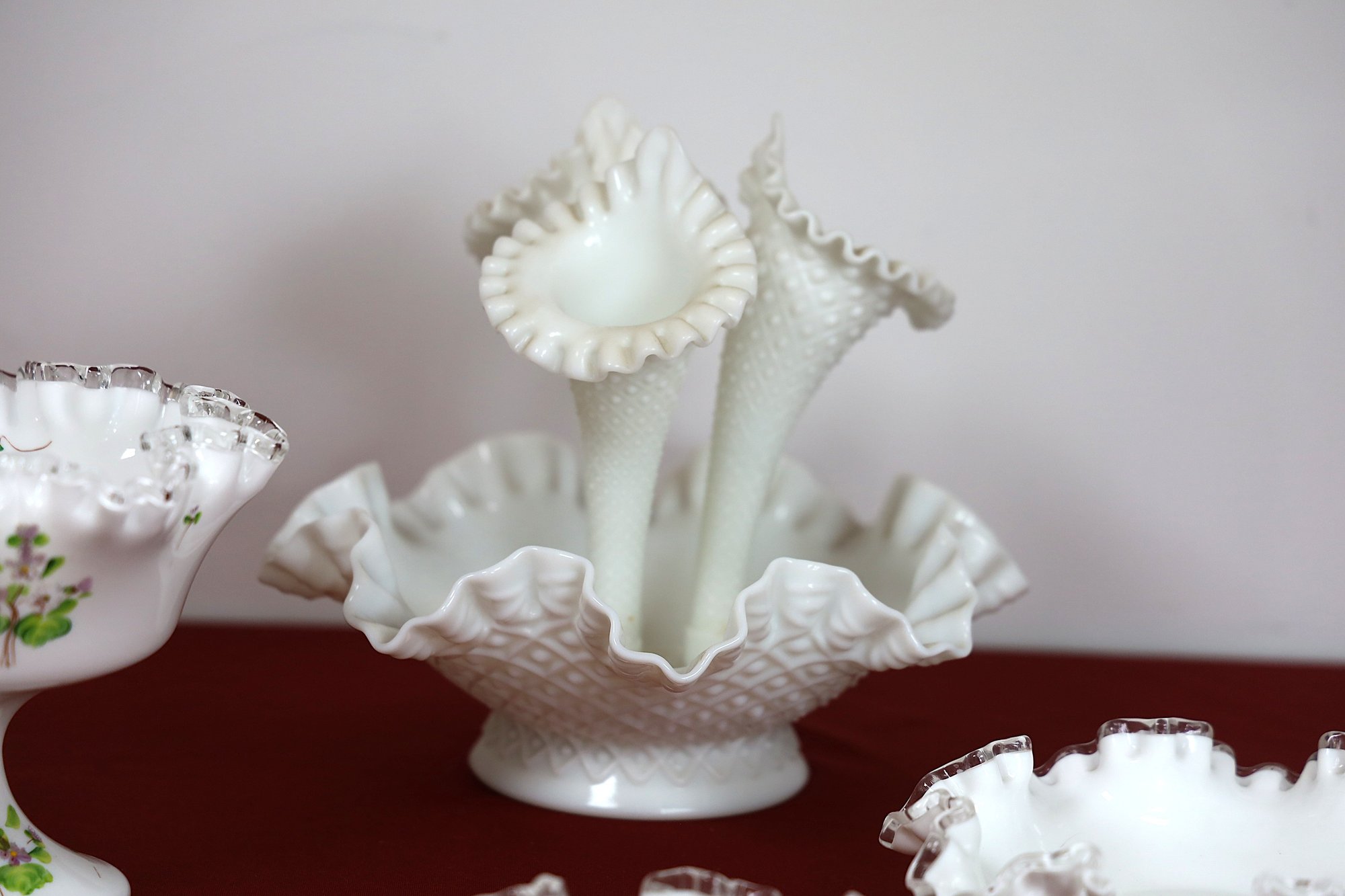 - Vintage Fenton Large Diamond Lace Milk Glass Epergne, 3 Horn Vase - 10"W x 9"H