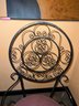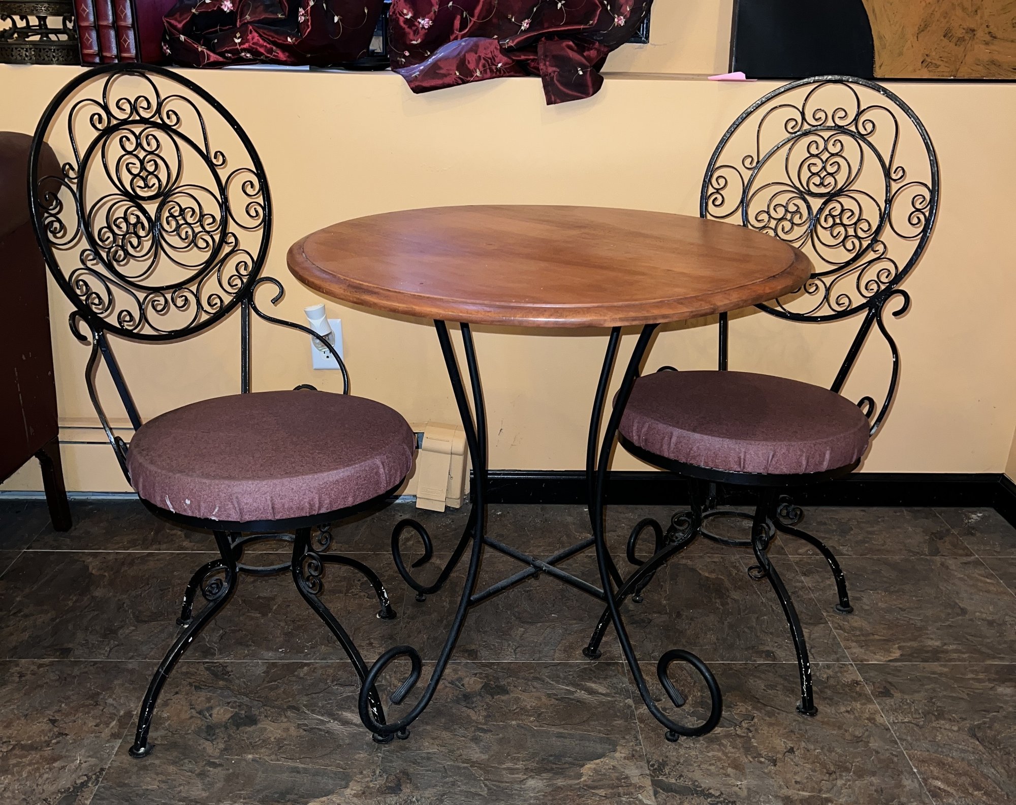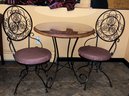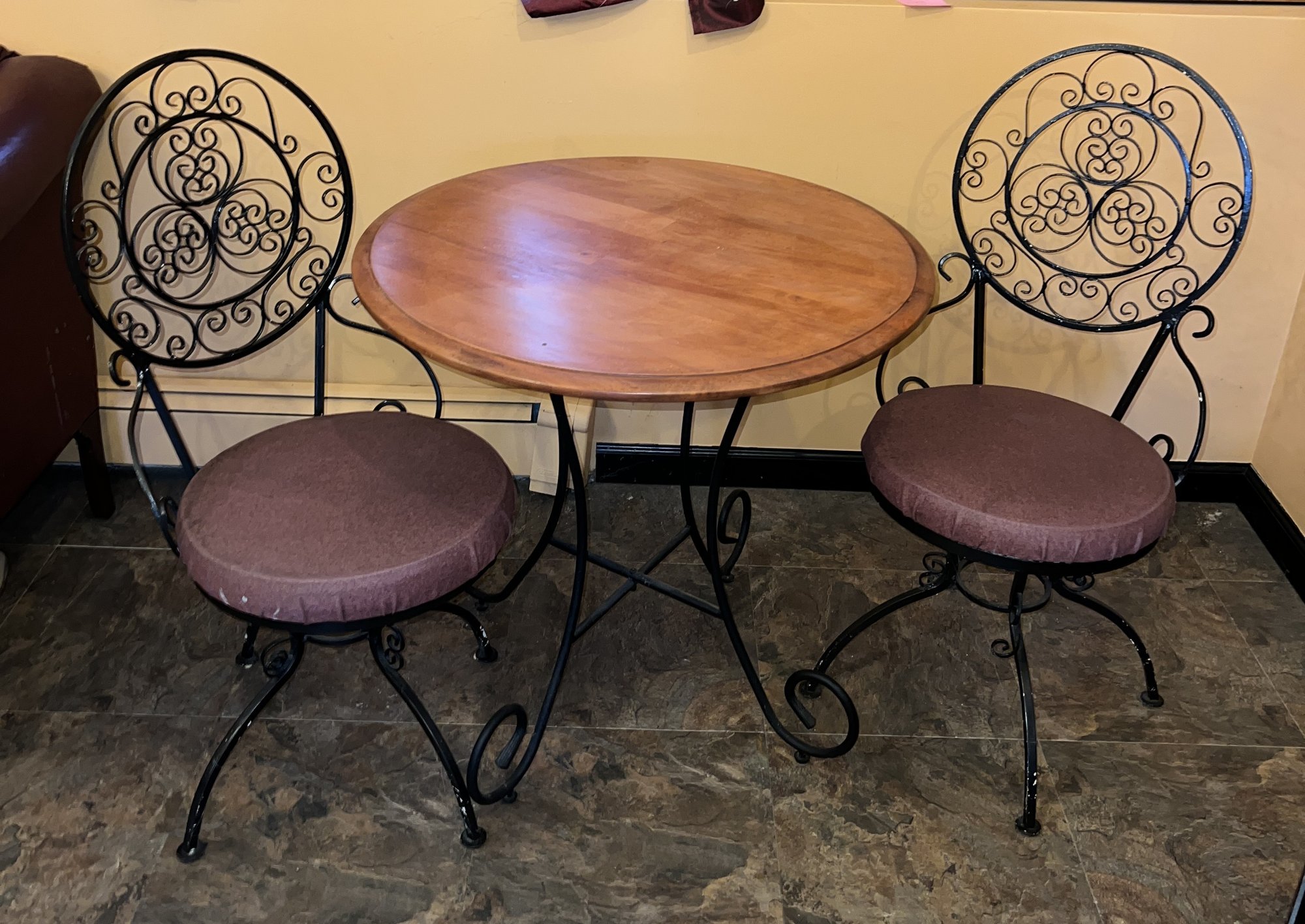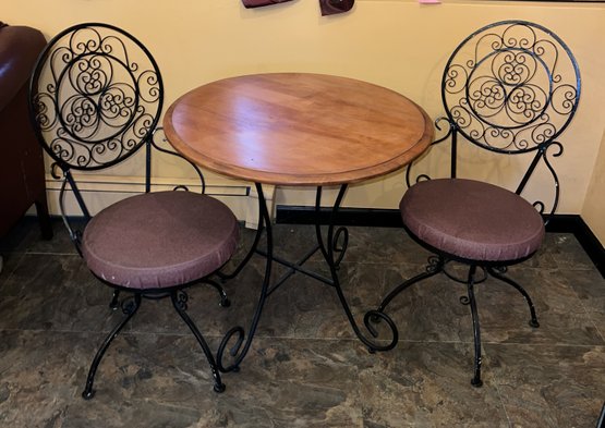 Two swivel chairs with a glass top for the protection of the wood top. Metal base.