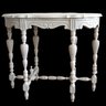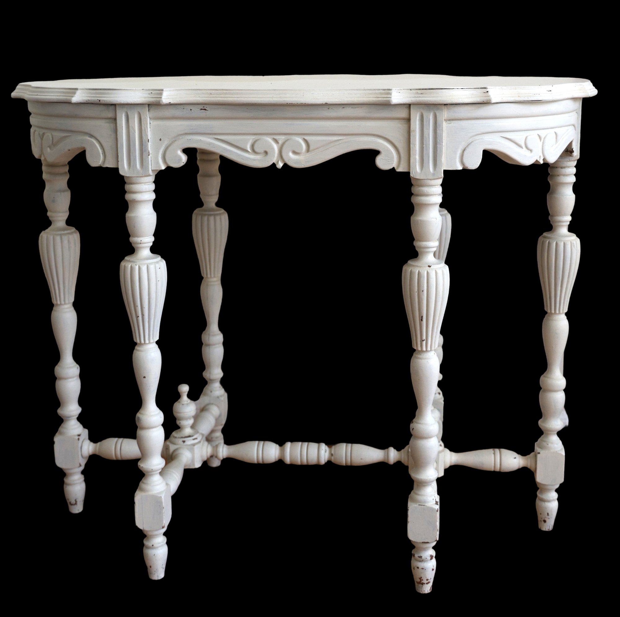 This delightful distressed white side table features a vintage design. It has a central scroll pattern on the apron and scalloped edges. The fluted and ribbed legs enhance its decorative charm. With its unique shape, weathered finish, and intricate details, it stands out as an eye-catching furniture piece.