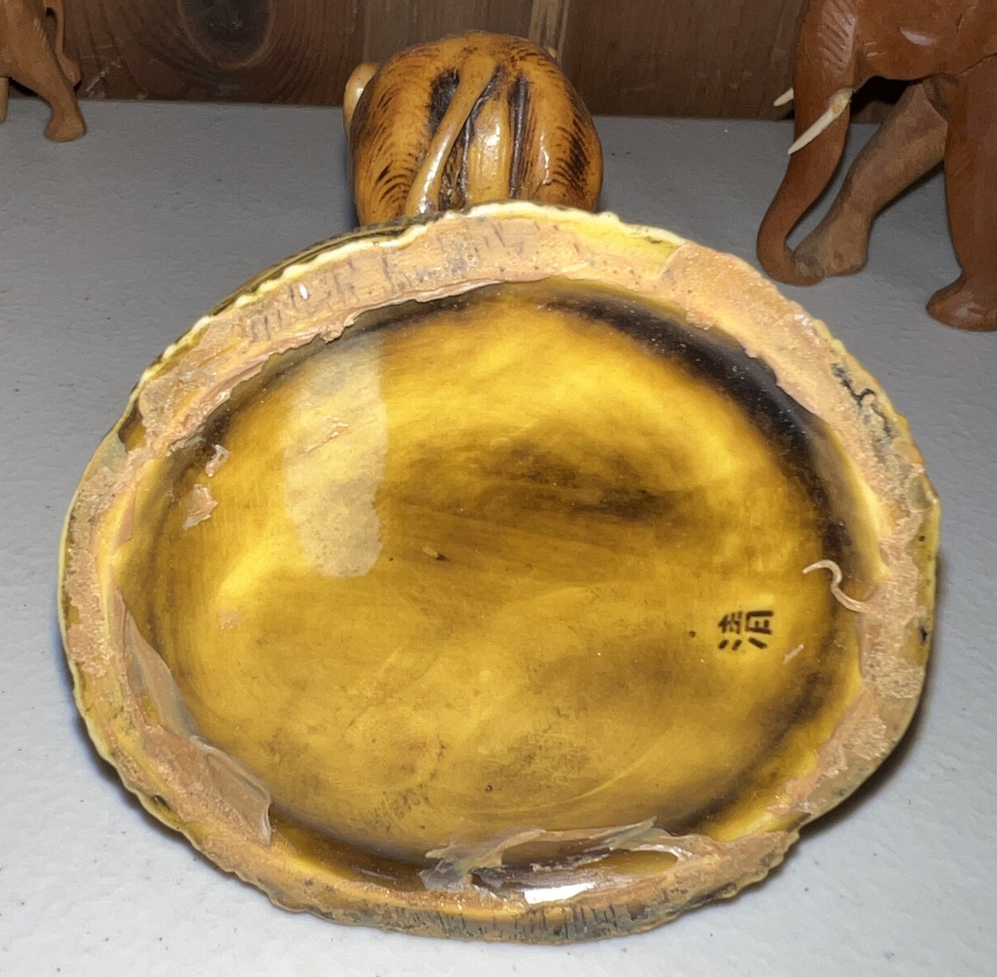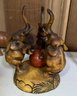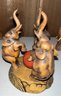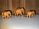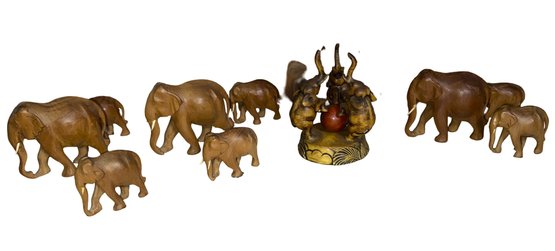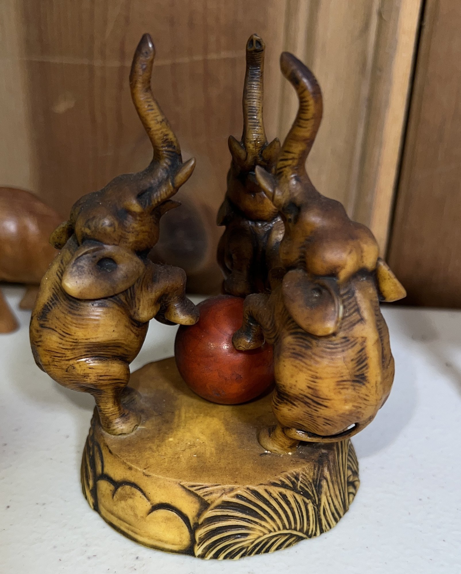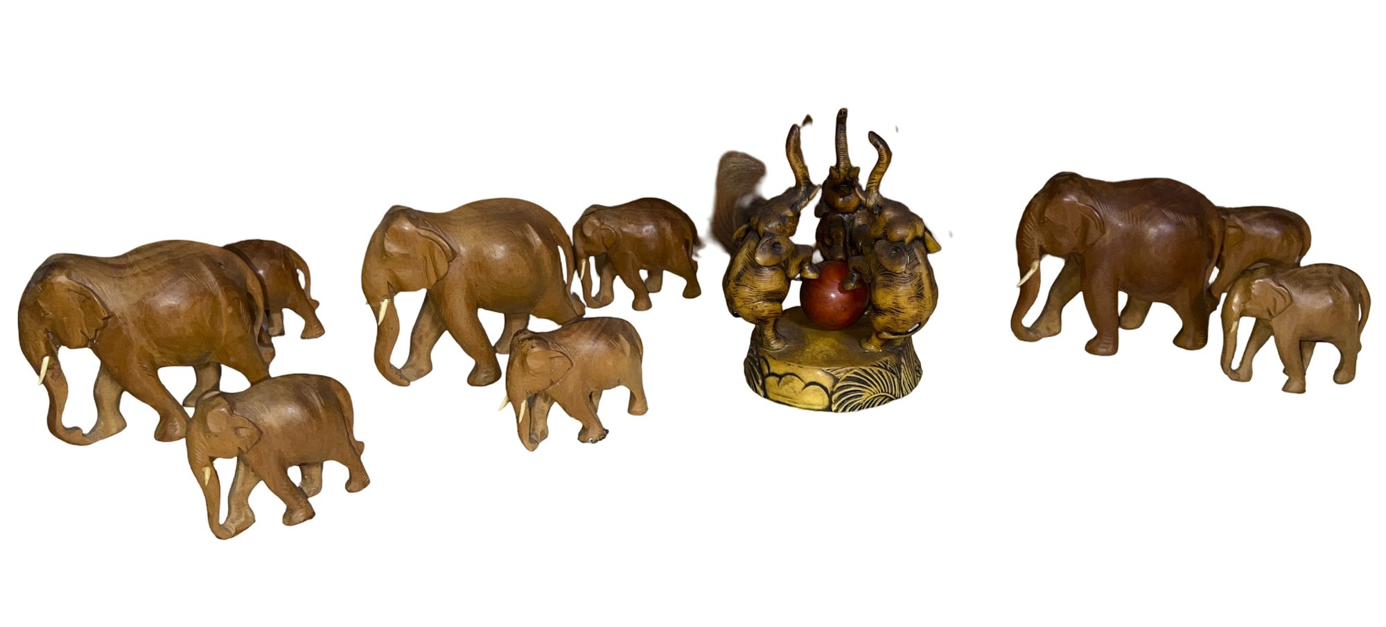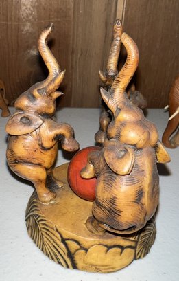 Lovely wooden elephant collection with one composition threesome with a ball signed on base'H