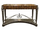Maitland Smith console table featuring an intricate inlaid bamboo top, aged metal torchiere style legs, scrolled metal stretchers, and tessellated marble bottom shelf with a starburst pattern at the center. Two drawers offer storage.