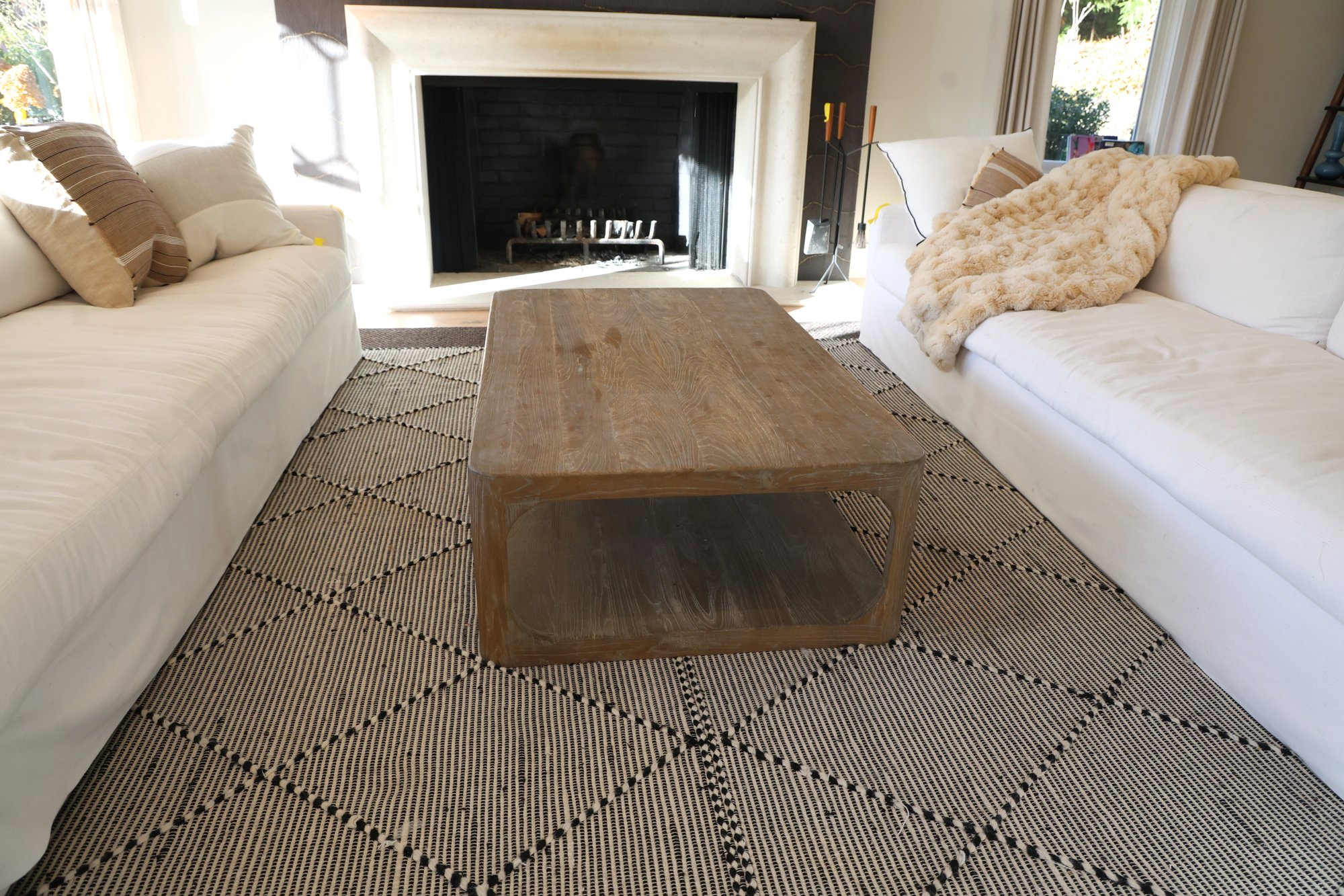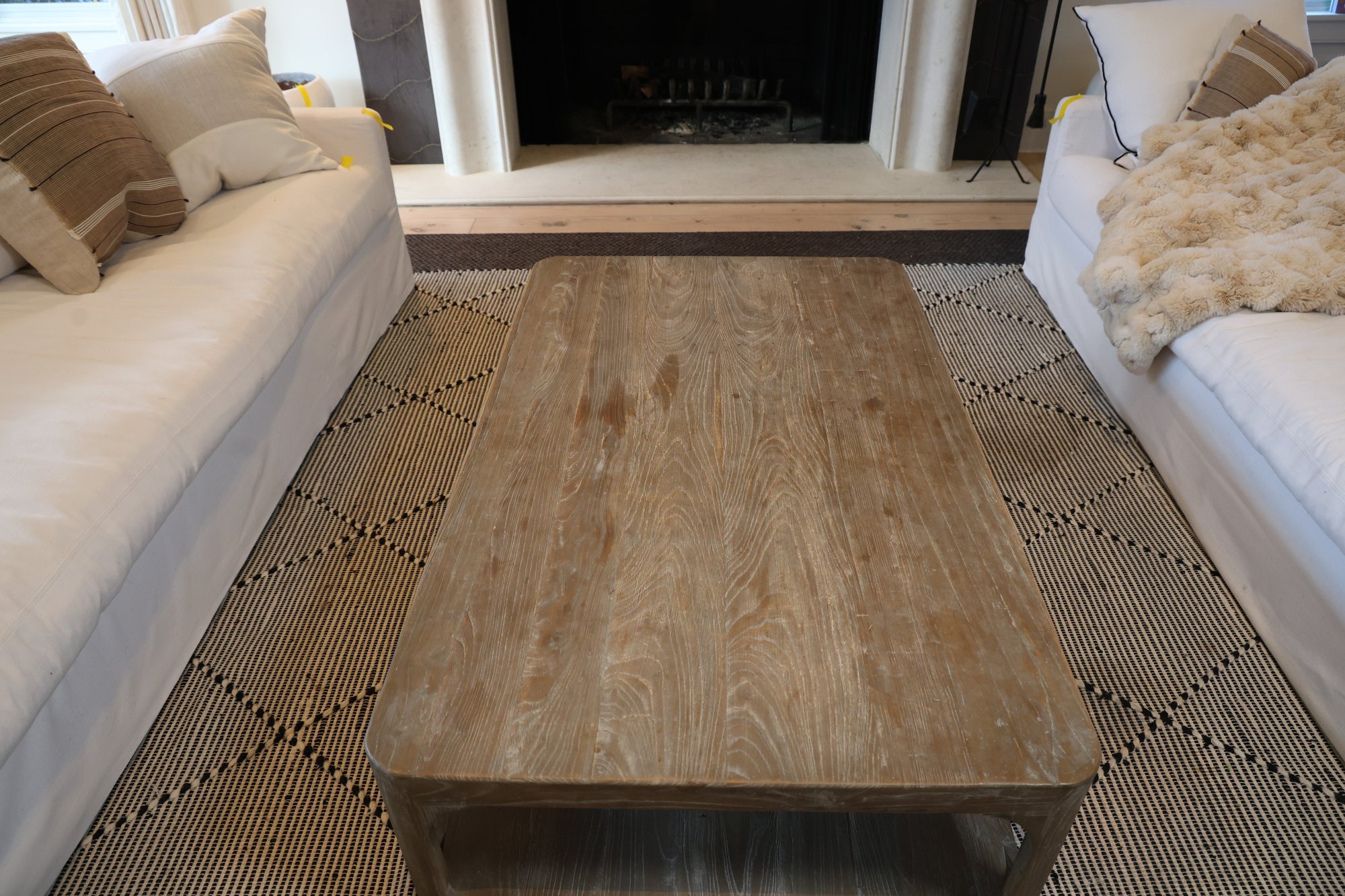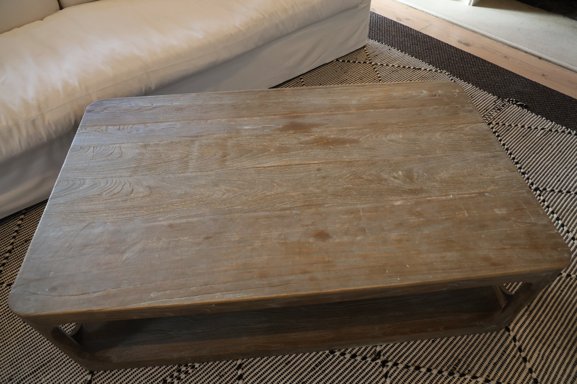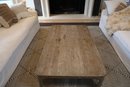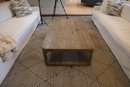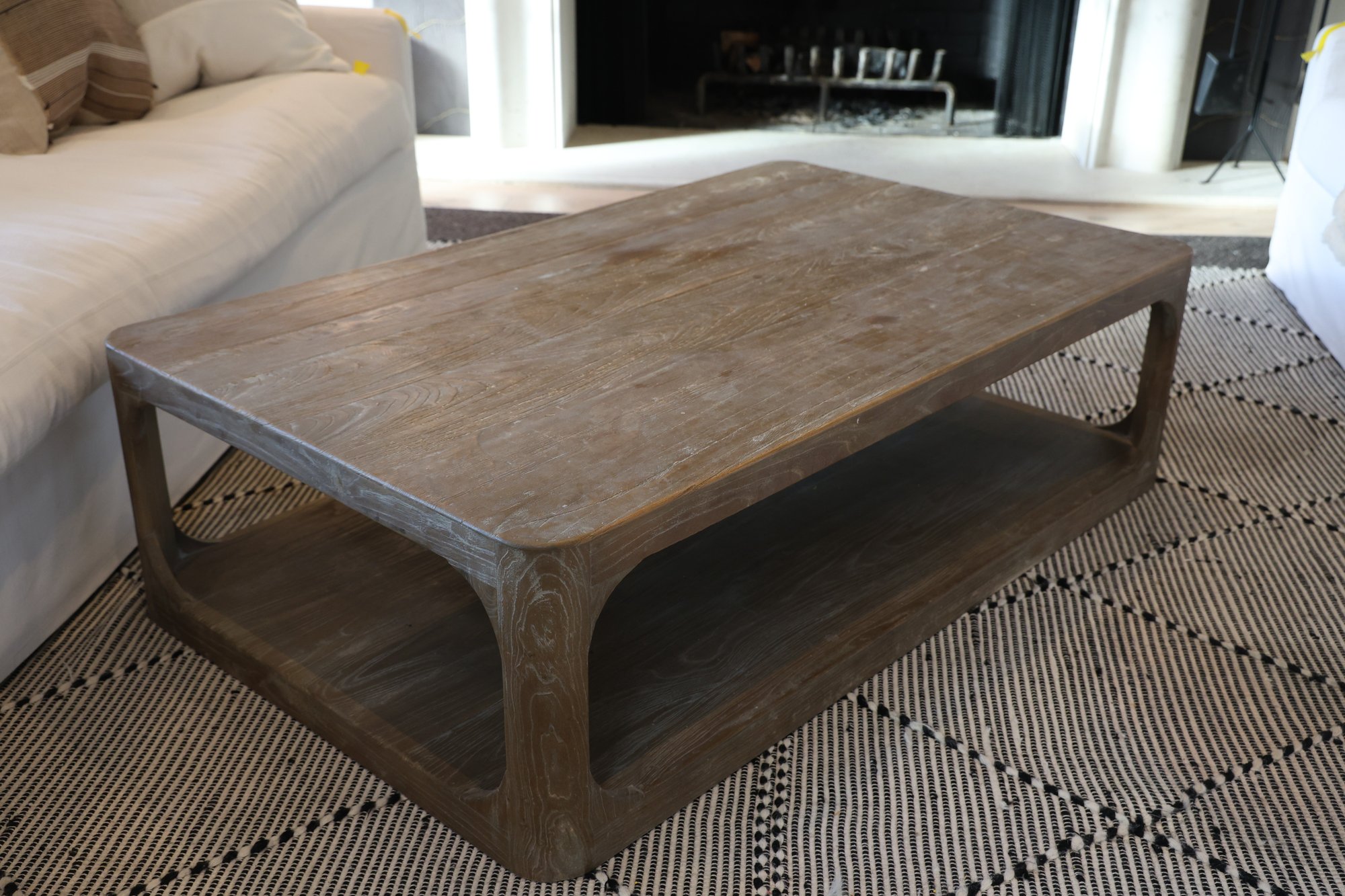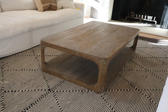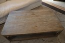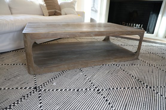 Aged Elm wood coffee table features a solid pine tabletop and refined yet durable legs. The bottom shelf is ideal for storing toys, magazines, remotes, and other items in baskets.